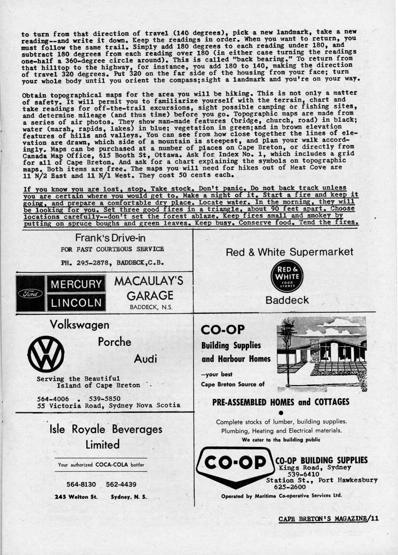 Published by Ronald Caplan on 1973/5/1 (1055 reads)to turn from that direction of travel (140 degrees), pick a new landmark, take a new reading • and write it down. Keep the readings in order. When you want to return, you must follow the same trail. Simply add 180 degrees to each reading under 180, and subtract 180 degrees from each reading over 180 (in either case turning the readings one-half a 360-degree circle around). This is called "back bearing." To return from that hilltop to the highway, for instance, you add 180 to 140, making the direction of travel 320 degrees. Put 320 on the far side of the housing from your face; turn your whole body until you orient the compass;sight a landmark and you're on your way. Obtain topographical maps for the area you will be hiking. This is not only a matter of safety. It will permit you to familiarize yourself with the terrain, chart and take readings for off-the-trail excursions, sight possible camping or fishing sites, and determine mileage (and thus time) before you go. Topographic maps are made from a series of air photos. They show man-made features (bridge, church, road) in black; water (marsh, rapids, lakes) in blue; vegetation in green;and in brown elevation features of hills and valleys. You can see from how close together the lines of ele? vation are drawn, which side of a mountain is steepest, and plan your walk accord? ingly. Maps can be purchased at a number of places on Cape Breton, or directly from Canada Map Office, 615 Booth St, Ottawa. Ask for Index No. 1, which includes a grid for all of Cape Breton. And ask for a chart explaining the symbols on topographic maps. Both items are free. The maps you will need for hikes out of Meat Cove are 11 n/2 East and 11 N/l West. They cost 50 cents each. If you know you are lost, stop. Take stock. Don't panic. Do not back track unless you are certain where you would get to. Make a night of it. Start a fire and keep it going, and prepare a comfortable dry'piace. Locate water. In the morning, they will be looking tor you. Set three good tires in a triangle, about 90 feet apart. Choose locations carefully • don't set the forest ablaze. Keep fires small and smokey bY putting on spruce boughs and green leaves. Keep busy. Conserve food. Tend the fires. Frank's Drive-in FOR FAST COURTEOUS SERVICE PH. 295-2878, BADDECK,C.B. Red & White Supermarket MERCURY I LINCOLN! MACAULAY'S GARAGE BADDECK, N.S. Baddeck Volkswagen Porche Audi Serving the Beautiful Island of Cape Breton '. 564-4006 . 539-5850 55 Victoria Road, Sydney Nova Scotia Isle Royale Beverages Limited Your authorized COCA-COLA boffler 564-8130 562-4439 245 Weiton St. Sydney, N. S. CO-OP Building Supplies and Harbour Homes • your best Cape Breton Source of PRE-ASSEMBLED HOMES and COHAGES • Complete stocks of lumber, building supplies. Plumbing, Heating and Electrical materials. We cater to the building public CO-OP i CO-OP BUILDING SUPPLIES Kings Road, Sydney 539-6410 "Station St., Port Hawkesbury 625-2600 Operated by Maritime Co-operative Services Ltd. CAKE BRETON ??S MAGAZINB/ll