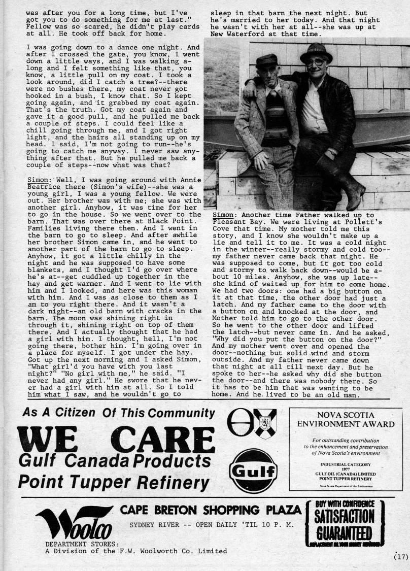Published by Ronald Caplan on 1980/6/1 (372 reads)was after you for a long time, but I've got you to do something for me at last." Fellow was so scared, he didn't play cards at all. He took off back for home. I was going down to a dance one night. And after I crossed the gate, you know, I went down a little ways, and I was walking a- long and I felt something like that, you know, a little pull on my coat. I took a look around, did I catch a tree • ?there were no bushes there, my coat never got hooked in a bush, I know that. So I kept going again, and it grabbed my coat again. That's the truth. Got my coat again and gave it a good pull, and he pulled me back a couple of steps. I could feel like a chill going through me, and I got right light, and the hairs all standing up on my head. I said, I'm not going to run--he's going to catch me anyway. I never saw any? thing after that. But he pulled me back a couple of steps--now what was that? Simon: Well, I was going around with Annie Beatrice there (Simon's wife)--she was a young girl, I was a young fellow. We were out. Her brother was with me; she was withf another girl. Anyhow, it was time for her to go in the house. So we went over to the barn. That was over there at Black Point. Families living there then. And I went in the barn to go to sleep. And after awhile her brother Simon came in, and he went to another part of the barn to go to sleep. Anyhow, it got a little chilly in the night and he was supposed to have some blankets, and I thought I'd go over where he's at--get cuddled up together in the hay and get warmer. And I went to lie with him and I looked, and here was this woman with him. And I was as close to them as I am to you right there. And it wasn't a dark night • an old barn with cracks in the bam. The moon was shining right in through it, shining right on top of them there. And I actually thought that he had a girl with him. I thought, hell, I'm not going there, bother him. I'm going over in a place for myself. I got under the hay. Got up the next morning and I asked Simon, "What girl'd you have with you last night?" "No girl with me," he said. "I never had any girl." He swore that he nev? er had a girl with him at all. So I told him wha' I saw, and he wouldn't goto sleep in that barn the next night. But he's married to her today. And that night he wasn't with her at all--she was up at New Waterford at that time. Simon: Another time Father walked up to Pleasant Bay. We were living at Pollett's Cove that time. My mother told me this story, and I know she wouldn't make up a lie and tell it to me. It was a cold night in the winter'-really stormy and cold too • my father never came back that night. He - was supposed to come, but it got too cold and stormy to walk back down • would be a- bout 10 miles. Anyhow, she was up late • she kind of waited up for him to come home. We had two doors: one had a big button on it at that time, the other door had just a latch. And my father came to the door with a button on and knocked at the door, and Mother told him to go to the other door. So he went to the other door and lifted the latch • but never came in. And he asked, "Why did you put the button on the door?" And my mother went over and opened the door--nothing but solid wind and storm outside. And my father never came down that night at all till next day. But he spoke to her--he asked why did she button the door • and there was nobody there. So it has to be him that was wanting to be home. And he. lived to be an old man. As A Citizen Of This Community WE CARE Gulf Canada Products Point Tupper Refinery NOVA SCOTIA ENVIRONMENT AWARD For outstanding contribution to the enhancement and preservation of Nova Scotia's environment INDUSTRIAL CATEGORY 1977 GULF OIL (CANADA) LIMITED POINT TUPPER REFINERY >lff CAPS BRETON SHOPPING ??J' Sm SYDNEY RIVER OPEN DAILY 'TIL 10 P. M. DEPARTMENT STORES: A Division of the F.W. Woolworth Co. Limited imOMROBICE 1 SIMION mml it • Mill m'mw GUIUUNTSD (17)