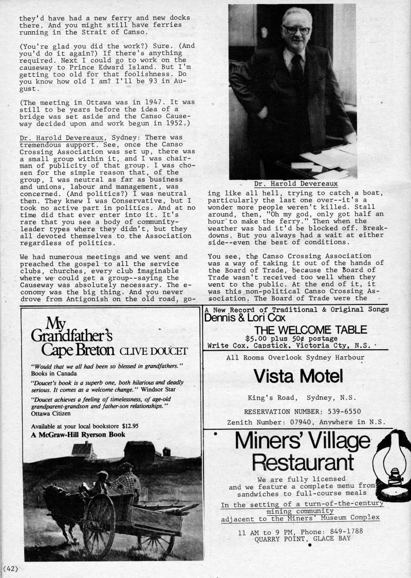 Published by Ronald Caplan on 1980/6/1 (402 reads)they'd have had a new ferry and new docks there. And you might still have ferries running in the Strait of Canso. (You're glad you did the work?) Sure. (And you'd do it again?) If there's anything required. Next I could go to work on the causeway to Prince Edward Island. But I'm getting too old for that foolishness. Do you know how old I am? I'll be 93 in Au? gust. (The meeting in Ottawa was in 1947. It was still to be years before the idea of a bridge was set aside and the Canso Cause? way decided upon and work begun in 1952.) Dr, Harold Devereaux, Sydney: There was tremendous support. See, once the Canso Crossing Association was set up, there was a small group within it, and I was chair? man of publicity of that group, I was cho? sen for the simple reason that, of the group, I was neutral as far as "business and unions, labour and management, was concerned. (And politics?) I was neutral then. They knew I was Conservative, but I took no active part in politics. And at no time did that ever enter into it. It's rare that you see a body of community- leader types where they didn't, but they all devoted themselves to the Association regardless of politics. We had numerous meetings and we went and preached the gospel to all the service clubs, churches, every club imaginable where we' could get a group--saying the Causeway was absolutely necessary. The e- conomy was the big thing, And you never drove from Antigonish on the old road, go- Harold Devereaux ing like all hell, trying to catch a boat, particularly the last one over--it's a wonder more people weren't killed. Stall around, then, "Oh my god, only got half an hour to make the ferry," Then when the weather was bad it'd be blocked off. Break? downs , But you always had a wait at either side--even the best of conditions. You see, th' Canso Crossing Association was a way of taking it out of the hands of the Board of Trade, because the Board of Trade wasn't received too veil when they went to the public. At the end of it, it was this non-political Canso Crossing As? sociation. The Board of Trade were the Grandfather' (jape Breton clive doucet "Would that we alt had been so blessed in grandfathers." Books in Canada "Doucet's book is a superb one, both hilarious and deadly serious. It comes as a welcome change." Windsor Star "Doucet achieves a feeling of timelessness, of age-old grandparent-grandson and father-son relationships." Ottawa Citizen Available at your local bookstore $12,95 A McGraw-Hill Ryerson Book A New Record of Traditional & Original Songs Dennis & Lori Cox THE WELCOME TABLE $5.00 plus 500 postage Write Cox. Capstick. Victoria Cty, N.S. • All Rooms Overlook Sydney Harbour Vista Motel King's Road, Sydney, N,S, RESERVATION NUMBER: 5 39-6550 Zenith Number: 07940, Anywhere in N.S. Miners'Village Restaurant We are fully licensed and we feature a complete menu from' sandwiches to full-course meals In the setting of a turn-of-the-centur' mining community adjacent to the Miners' Museum Complex 11 AM to 9 PM, Phone: 849-1788 QUARRY POINT, GLACE BAY