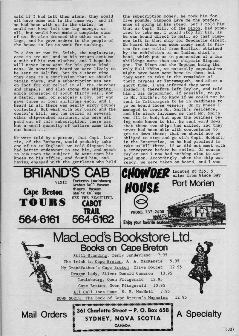 Published by Ronald Caplan on 1980/8/1 (271 reads)said if I had left them alone, they would all have come out in the same way, and if he had been with us in the winter, he would not have left one leg amongst us all, but would have made a complete cure of us. He also dressed the other men's legs, and he gave orders to the people of the house to let us want for nothing. In a day or two" Mr. Smith, the magistrate, came to see me, and on his return sent me a suit of his own clothes, and I hope he will never know want for his great kind? ness. We sometimes heard we were likely to be sent to Halifax, but in a short time they came to a conclusion that we should remain there, and a subscription was set on foot for our relief in all the churches and chapels, and also among the shipping, which consisted of about thirty sail; not a master, man, or scarcely a boy, but who gave three or four shillings each, and I heard in all there was nearly sixty pounds collected. But what with our board and the doctor's bill, and the relief of several other shipwrecked mariners, who were all paid out of this subscription, there was but a small quantity of dollars came into our hands.... We were told by a person, that Capt. Low- rie, of the Barbara, would probably take one of us to England; we told Simpson he had better endeavour to see him, and speak to him upon the subject. He went upon his knees to his office, and found him, and having engaged with the gentleman who held the subscription money, he took him for five pounds. Simpson gave me the prefer? ence of going in his stead, but I told him that as Capt. Gill, of the Dixon, had prom? ised to take me, I would stop for him, as he was bound direct to Hull, so that Simp? son left in that ship for Newcastle direct. We heard there was some money sent to Pic? tou for our relief from Halifax, obtained by the exhibition of an Indian chief's head, which put us in possession of a few shillings more than our shipmate Simpson got. The Dixon and the Neptune being the only Hull ships, we naturally expected we might have been sent home in them, but they went to take in the remainder of their cargoes at Tattamagush, and after a short time, I was informed they were loaded; I therefore left Taylor, and told him I was determined, if possible, to go to Mr. Smith's, to know if we could not be sent to Tattamagush to be in readiness to go on board those vessels. On my knees I managed to reach Mr. Smith's residence, and his clerk informed me that Mr. Smith was ill in bed, but upon the business be? ing made known to him, he sent word down that those two ships had sailed, and they never had been able with convenience to get us down there; that we should now be obliged to stop and go with Capt. Hobbart, in the Enterprize, as he had promised to take us all three, if we did not meet with a conveyance before he sailed. Of course Taylor and I now had nothing else to de? pend upon. Accordingly, when the ship was ready, we were taken on board, and I was BRIAND'S CAB VISIT TOURS 664-6161 Fortress Louisbourg Graham Bell Museum Miners' Museum Gaelic College SEE THE BEAUTIFUL aBOT TRAIL 664-61' HOUU located Rt 255, 5 miles from Glace Bay Port Morien PHONE:737-2408 Enjoy your favorite MacLeod's Bookstore Ltd. Books on Caoe Breton Still Standing, Terry Sunderland 7.95 The Irish in Cape Breton, A. A. MacKenzie 5.95 My Grandfather's Cape Breton, Clive Doucet 12.95 Dragon Lady, Silver Donald Cameron 13.95 Louisbourg, Owen Fitzgerald 12.95 Cape Breton, Owen Fitzgerald 10.95 All Call lona Home, S. R. MacNeil 7.95 DOWN NORTH: The Book of Cape Breton's Magazine 12.95 r Mail Orders I 361 Charlotte Street - P. O. Box 658 j SYDNEY, NOVA SCOTIA CANADA A Specialty (33)