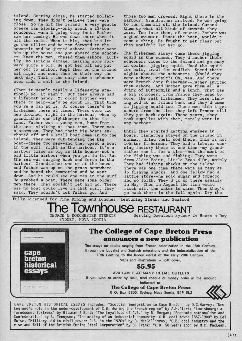 Published by Ronald Caplan on 1980/8/1 (347 reads)island. Getting close, he started holler? ing down. They didn't believe they were close. So he hit the island. A very gentle breeze was blowing--only about a 13-ton schooner, wasn't going very fast. Father saw her coming. He was down there when it hit the rocks. When it hit, that kid let go the tiller and he ran forward to the bowsprit and he jumped ashore. Father sent him up the house and got aboard the schoon? er. Knew the men, chased them ashore. Luck? ily, no serious damage. Leaking some for? ward quite a bit. He got her off and put her out to anchor. Kept them on the island all night and sent them on their way the next day. That's the only time a schooner ever made a call to the island. (Then it wasn't really a lifesaving sta? tion?) No, it wasn't. But they always had a lifeboat handy. My older brother was there to help--he'd be about 12. That time you're a man at 12. Of course there'd be fishermen there at times. There were two men drowned, right in the harbour, when my grandfather was lightkeeper on that is? land. Father was a young man, home from the sea, visiting at that time. There was a storm on. They had their big boats an? chored off and a small boat came in to the island. They were out tending the big boat--these two men--and they upset a boat in the surf, right in the harbour. It's a harbour twice as big as this house--not a bad little harbour when you get in it. But the sea was surging back and forth in the harbour. Grandfather was up at the house, and Father was up on the grass somewhere and he heard the commotion and he went down. And he could see one man in the surf. He grabbed a boat. There were some older men there. They wouldn't let him go. There was no boat could live in that surf, they* said. They wouldn't let Father go. And those two men drowned. Right there in the harbour. Grandfather arrived. He was going to run them all off the island. Cursed them up what all kinds of cowards they were. Too late then, of course. Father was a good swimmer. Upset the boat, wouldn't mean a thing. He fought to get clear but they wouldn't let him go. The fishermen always came there jigging squid in the summer. They'd anchor their schooners close to the island and go away in dories, jigging squid. Used the squid for bait, trawl for codfish. Spend their nights aboard the schooners. (Would they come ashore, visit?) Oh, yes. And there were French dory fishermen • Father invited them ashore. And Mother gave them all a drink of buttermilk and a lunch. That was a big schooner, from France they used to come, the salt fishermen. They were fish? ing cod at an island bank and they'd come in jigging squid too. Those men didn't get ashore from the time they left France till they got back again. Those years, they took supplies with them, rarely went in any harbour. Until they started getting engines in boats, fishermen stayed on the island in summer, dried their cod there. This is not lobster fishermen. They had a lobster can? ning factory there at one time--my grand? father ran it for a time--but the most of the fishing was cod fishing. They were from Alder Point, Little Bras d'Or, mainly. They had fishing shacks on the island. There was one time there were as many as 16 fishing shacks. And one fellow had a little store--he sold sugar and tobacco and so forth. They'd go up there usually in May. Then in August the fish would slack off, the water is warm. Then they'd go back there in the fall again. Dry the Fully Licensed for Fine Dining and Lunches, featuring Steaks and Seafood The Townhouse restaurant GEORGE 6c DORCHESTER STREETS Serving Downtown Sydney 24 Hours a Day SYDNEY, NOVA SCOTIA cape breton historical essays The College of Cape Breton Press announces a new public:ation Ten essays on topics ranging from French colonization in the 18th Century, through the Loyalist and Scottish migrations and the industrialization of the 19th Century, to the labour unrest of the early 20th Century. Maps and illustrations • soft cover. $5.95 AVAILABLE AT MANY RETAIL OUTLETS if you wish to order by mail, send cheque or money order in the amount indicated to: The College off Cape Breton Press P. O. Box 5300, Sydney, Nova Scotia, BIP 6L2 CAPE BRETON HISTORICAL ESSAYS includes: "Scottish immigration to Cape Breton" by D.C.Harvey; "New England's role in the under-development of C.B. during the French regime" by A.H.Clark; "Louisbourg: a foredoomed fortress" by Hitsman & Bond; "The Loyalists of C.B." by R. Morgan; "Economic nationalism and Confederation" by B. Tennyson; "The making of an industrial community: C.B. coal towns 1867-1900" by Del Muise; "Military aid to civil power: C.B. in the 1920s" by D. MacGillivray; "C.B. coal industry and the rise and fall of the British Empire Steel Corporation" by D. Frank; "C.B. 50 years ago" by M.C. MacLean. (43)