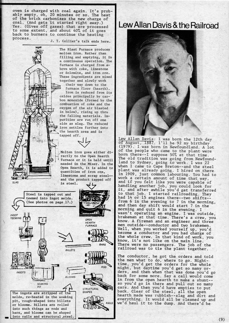 Published by Ronald Caplan on 1980/12/1 (345 reads)oven is charged with coal again. It's prob? ably empty, oh, 20 minutes or so. The heat of the brick carbonizes the new charge of coal. (And gets it started right away.) Yes. (Gives off gases) that are processed to some extent, and about 40% of it goes back to burners to continue the heating process. J. T. Collier's talk ends here. The Blast Furnace produces molten iron. Rather than filling and emptying, it is a continuous operation. The furnace is charged from a- bove with coke, limestone or dolomite, and iron ore. These ingredients are mixed together and slowly work their way down to the furnace floor (hearth). Iron is reduced from its oxides principally by car? bon monoxide (formed by the combustion of coke and the oxygen of the air blasted in below), rising up thru the falling materials. Im? purities are run off one side as slag. The reduced iron settles further into the hearth area and is tapped off. ' Molten iron goes either di? rectly to the Open Hearth ' furnace or it is held until needed in the Mixer. In the Open Hearth, it is added to quantities of iron or.e, limestone and scrap steel • and the product tapped off is steel. ii. Steel is tapped out and I teemed into ingot molds. (See photos on page 17.) The ingots are stripped molds, re-heated in the soaking pit, rough-shaped into billets or blooms. Billets are rolled into such things as rods and bars, and blooms can be shaped into rails and structural?steel. Lew Allan Davis & the Railroad Lew Allan Davis: I was born the 12th day of August, 1887. I'll be 92 my birthday (1979). I was born in Newfoundland. A lot of the people who came to the plant were born there--I suppose 50% at that time. The old tradition was going from Newfound? land to Sydney, going to work, I was 22 when I came to Cape Breton--and the steel plant was already going. I hired on there in 1909, just common labouring. You had to work a certain amount of time that way, and if you felt like you were capable of handling another job, you could look for it, and after awhile you'd get transferred to that job, I started railroading. They had 14 or 15 engines there--two shifts-- from 6 in the evening to 7 in the morning, and then day shift would start 7 in the morning and quit 6 in the evening, I wasn't operating an engine, I was outside, brakeman at that time. There's a crew, you know. A fireman and an engineer and three men outside--conductor and two brakemen. Well, when you worked yourself up, you'd become a conductor and you had charge of the whole crew. In that kind of work, you know, it's not like on the main line. There were no passengers. The job of the railroad was to tie the plant together. The conductor, he got the orders and told the men what to do, where to go. Night? time, you'd get the orders for the whole night, but daytime you'd get so many or? ders, and then when that was done you'd go back for some more. Say a call would come in from the open hearth to make a shunt-- so you'd go in there and pull out so many cars. And then you'd have empties to put back. Clear of the steel, all the open hearth made was rubbish--slag and dirt and everything. It would all be cleaned up and we'd haul it to the dump. And there'd be (9)