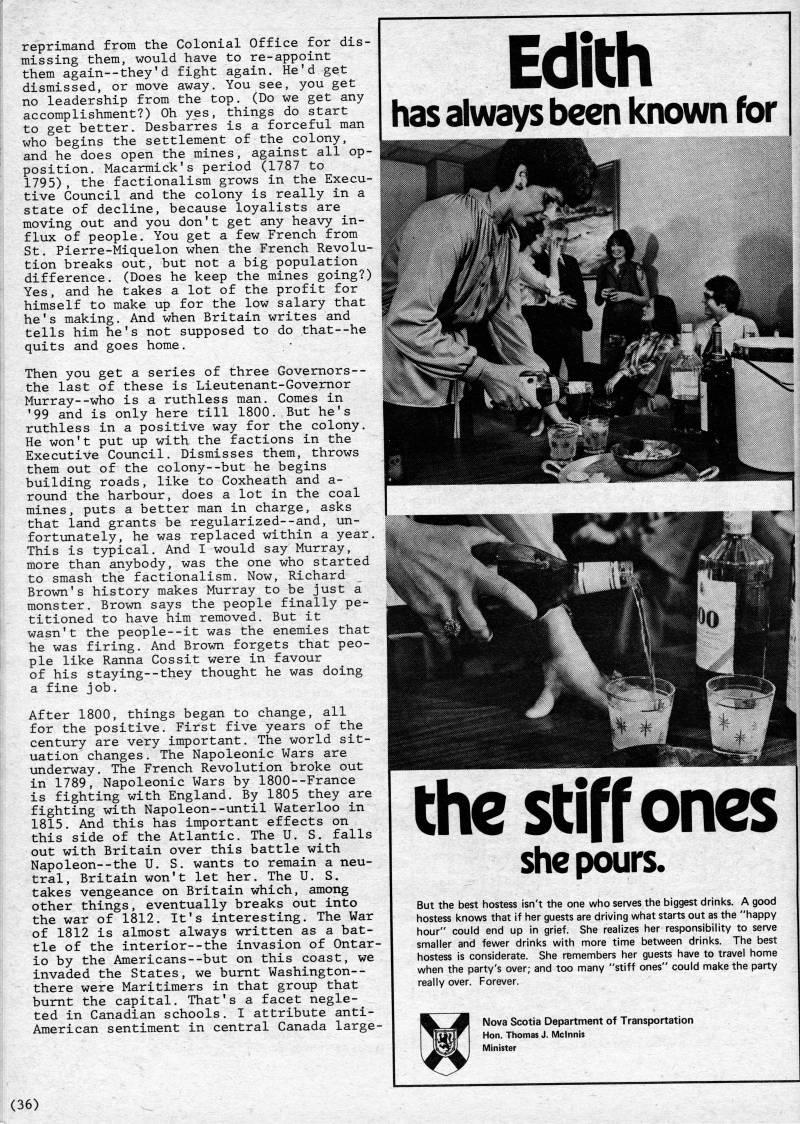 Published by Ronald Caplan on 1980/12/1 (357 reads)reprimand from the Colonial Office for dis? missing them, would have to re-appoint them again--they'd fight again. He'd get dismissed, or move away. You see, you get no leadership from the top. (Do we get any accomplishment?) Oh yes, things do start to get better. Desbarres is a forceful man who begins the settlement of the colony, and he does open the mines, against all op? position. Macarmick's period (1787 to 1795), the factionalism grows in the Execu? tive Council and the colony is really in a state of decline, because loyalists are moving out and you don't get any heavy in? flux of people. You get a few French from St. Pierre-Miquelon when the French Revolu? tion breaks out, but not a big population difference. (Does he keep the mines going?) Yes, and he takes a lot of the profit for himself to make up for the low salary that he's making. And when Britain writes and tells him he's not supposed to do that--he quits and goes home. Then you get a series of three Governors-- the last of these is Lieutenant-Governor Murray--who is a ruthless man. Comes in '99 and is only here till 1800. But he's ruthless in a positive way for the colony. He won't put up with the factions in the Executive Council. Dismisses them, throws them out of the colony--but he begins building roads, like to Coxheath and a- round the harbour, does a lot in the coal mines, puts a better man in charge, asks that land grants be regularized--and, un? fortunately, he was replaced within a year. This is typical. And I would say Murray, more than anybody, was the one who started to smash the factionalism. Now, Richard Brown's history makes Murray to be just a monster. Brown says the people finally pe? titioned to have him removed. But it wasn't the people--it was the enemies that he was firing. And Brown forgets that peo? ple like Ranna Cossit were in favour of his staying--they thought he was doing a fine job. After 1800, things began to change, all for the positive. First five years of the century are very important. The world sit? uation changes. The Napoleonic Wars are underway. The French Revolution broke out in 1789, Napoleonic Wars by 1800--France is fighting with England. By 1805 they are fighting with Napoleon--until Waterloo in 1815. And this has important effects on this side of the Atlantic. The U. S. falls out with Britain over this battle with Napoleon--the U. S. wants to remain a neu? tral, Britain won't let her. The U. S. takes vengeance on Britain which, among other things, eventually breaks out into the war of 1812. It's interesting. The War of 1812 is almost always written as a bat? tle of the interior--the invasion of Ontar? io by the Americans--but on this coast, we invaded the States, we burnt Washington-- there were Maritimers in that group that burnt the capital. That's a facet negle- ted in Canadian schools. I attribute anti- American sentiment in central Canada large- Edi(h has always been known for the stiff ones she pours. But the best hostess isn't the one who serves the biggest drinks. A good hostess knows that if her guests are driving what starts out as the "happy hour" could end up in grief. She realizes her responsibility to serve smaller and fewer drinks with more time between drinks. The best hostess is considerate. She remembers her guests have to travel home when the party's over; and too many "stiff ones" could make the party really over. Forever. Nova Scotia Department of Transportation Hon. Thomas J. Mclnnis Minister (36)