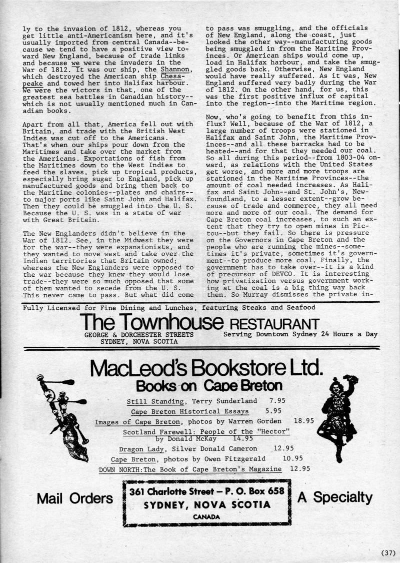 Published by Ronald Caplan on 1980/12/1 (320 reads)ly to the invasion of 1812, whereas you get little anti-Americanism here, and it's usually imported from central Canada--be? cause we tend to have a positive view to? ward New England, because of trade links and because we were the invaders in the War of 1812. It was our ship, the Shannon, which destroyed the American ship Chesa? peake and towed her into Halifax harbour. We were the victors in that, one of the greatest sea battles in Canadian history-- which is not usually mentioned much in Can? adian books. Apart from all that, America fell out with Britain, and trade with the British West Indies was cut off to the Americans. That's when our ships pour down from the Maritimes and take over the market from the Americans. Exportations of fish from the Maritimes down to the West Indies to. feed the slaves, pick up tropical products, especially bring sugar to England, pick up manufactured goods and bring them back to the Maritime colonies--plates and chairs-- to major ports like Saint John and Halifax. Then they could be smuggled into the U. S. Because the U. S. was in a state of war with Great Britain. The New Englanders didn't believe in the War of 1812. See, in the Midwest they were for the war--they were expansionists, and they wanted to move west and take over the Indian territories that Britain owned; whereas the New Englanders were opposed to the war because they knew they would lose trade--they were so much opposed that some of them wanted to secede from the U. S. This never came to pass. But what did come to pass was smuggling, and the officials of New England, along the coast, just looked the other way--manufacturing goods being smuggled in from the Maritime Prov? inces . Or American ships would come up, load in Halifax harbour, and take the smug? gled goods back. Otherwise, New England would have really suffered. As it was, New England suffered very badly during the War of 1812. On the other hand, for us, this was the first positive influx of capital into the region--into the Maritime region. Now, who's going to benefit from this in? flux? Well, because of the War of 1812, a large number of troops were stationed in Halifax and Saint John, the Maritime Prov- inces--and all these barracks had to be heated--and for that they needed our coal. So all during this period--from 1803-04 on? ward, as relations with the United States get worse, and more and more troops are stationed in the Maritime Provinces--the amount of coal needed increases. As Hali? fax and Saint John--and St. John's, New? foundland, to a lesser extent--grow be? cause of trade and commerce, they all need more and more of our coal. The demand for Cape Breton coal increases, to such an ex? tent that they try to open mines in Pic- tou--but they fail. So there is pressure on the Governors in Cape Breton and the people who are running the mines--some- times it's private, sometimes it's govern? ment- -to produce more coal. Finally, the government has to take over--it is a kind of precursor of DEVCO. It is interesting how privatization versus government work? ing at the coal is a big thing way back then. So Murray dismisses the private in- Fully Licensed for Fine Dining and Lunches, featuring Steaks and Seafood The Townhouse restaurant GEORGE 6c DORCHESTER STREETS Serving Downtown Sydney 24 Hours a Day SYDNEY, NOVA SCOTIA MacLeod's Bookstore Ltd Booksxxi CaoeBreton Still Standing, Terry Sunderland 7.95 Cape Breton Historical Essays 5.95 Images of Cape Breton, photos by Warren Gorden 18.95 Scotland Farewell: People of the "Hector" by Donald McKay 14.95 Dragon Lady, Silver Donald Cameron 12.95 Cape Breton, photos by Owen Fitzgerald 10.95 DOWN NORTH:The Book of Cape Breton's Magazine 12.95 Mail Orders i 361 Charlotte Street - P. O. Box 658 | SYDNEY, NOVA SCOTIA I CANADA A Specialty (37)