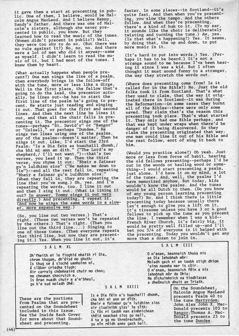 Published by Ronald Caplan on 1980/12/1 (2232 reads)it gave them a start at precenting in pub? lic. One of them, I believe, would be Mal? colm Angus MacLeod. And I believe Kenny, Sandy's father. And there was one of Mal? colm's sisters, although she never pre? cented in public, you know. But they learned how to read the music of the tunes. (Women didn't precent in public?) Well, they were too shy to do so. (But there was no rule against it?) No, no, no. And there were a lot of men who did it anyway--same as myself. I didn't learn to read the mu? sic of it, but I had most of the tunes. I knew them by heart. (What actually happens when people pre? cent?) One man sings the line of a psalm, then everybody brings in the follow-off with the tune, more or less like a dirge. Well in the first place, the fellow that's going to do the lead, the precentor actu? ally, he lines out--he has to start the first line of the psalm he's going to pre? cent. He starts just reading and singing it out. That goes for the first and second lines. And then the next line he lines it out, and then all the choir falls in pre? centing it. The precentor sings one of the tunes--perhaps "St. David's" or "Bangor" or "Colsell," or perhaps "Dundee." He sings two lines using one of the psalms, any of the psalms--doesn't matter. Then he sings it out. Like, I'd start the 23rd Psalm: "Is e Dia fein as buachaill dhomh,/ cha bhi mi ann an dith." ("The Lord's my shepherd,/ I'll not want.")--that's two ' verses, you lead it up. Then the third verse, you rhyme it out: "Bheir e fainear gu'n luidhinn sios" ("He makes me down to lie")--and all the rest fall in, repeating "Bheir e fainear gu'n luidhinn sios." (When they fall in, they are repeating the line that you've sung.) Oh, yes. And I'm repeating the words, too. I line it out and then I sing it out. (What is lining it out? In answer. Tommy sings it out very directly.) And precentingT I repeat it. (And now he sings the same words in a slow? er, more expansive way.) (So, you line out two verses.) That's right. (Those two verses won't be repeated by the others.) That's right. (Then you line out the third line....) Singing to one of those tunes. (Then everyone repeats that third line, but now they are precent? ing it.) Yes. When you line it out, it's faster. In some places--in Scotland--it's quite fast. And then when you're precent? ing, you slow the tempo. And the others follow. And when they're precenting, there's a kind of hum to it. (To my ear, it sounds like the choir is deliberately twisting and turning the tune.) Aw, yes. (Is that what's happening?) Yes. It seems, by doing that, the up and down, to put more music in it. (It's hard to put into words.) Yes. (Per? haps it has to be heard.) It's not a strange sound to me because I've been hear? ing it since I was a kid. But I often thought it must sound funny to a stranger, the way they stretch the words out. (Where does precenting come from? Is it called for in the Bible?) No. Just the old folks took it from Scotland. That's what they used to claim, that the way it orig? inated there in Scotland--it was during the Reformation--in some cases they burnt all of the Bibles--there were only some saved. They claim that's the reason this precenting took place. That's what started it. They only had one Bible perhaps, and that was kept under wraps when there'd be danger of it being discovered. So they claim the precenting originated that way: one man could line it out of his Bible and the rest follow, sort of sing it back to him. (Would you practice alone?) Oh yeah. Just more or less from force of habit, hearing the old fellows precenting--perhaps I'd be out in the woods or hauling wood or some- thing--I would start precenting a psalm, just alone. I'd have it on my mind, a lot of the tunes. And, well, the psalms I'd have memorized anyhow. But today, kids wouldn't know the psalms. And the tunes would be all Dutch to them. (Do you know of any young person learning precenting today?) No. And I think there is little precenting today because usually there isn't enough to give you a lift on it, it's tiresome unless you have 3 or 4 good fellows to pick up the tune as you precent the line. I remember when I was a kid-- French River Church, it's fairly big, it would be pretty well filled up--and I'll bet you 3/4 of everyone in it helped with the precenting. Today you wouldn't get any more than a dozen to join in. S A L M XL Dh'fheith mi le fioghid mhaith ri Dia, chrom thugam, dh'eisd mo ghuth: Is thug se a slochd uamhuinn mi, a clabar criadha tiugh: Air carraig chomhnaird chuir mo chos; mo cheuman shocruich e. Is 6ran nuadh chuir e a'm'bheul, gu b'e sud moladh Dhe: S A L M XXIII s A L M cm 0 m'anam, beannaich thusa nis an Dia lehobhah m6r: Moladh gach ni an taobh stigh dhiom 'ainm naomha mar is coir. 0 m'anam, beannaich fein a nis lehobhah mor do Dhia: Na dichuimhnich na tiodhlacan a dheonuich dhuit an Triath. These are the portions from Psalms that are pre? cented on the Soundsheet included in this issue. See the Inside Back Cover for more about that Sound- sheet and precenting. (46)' Is e Dia fein a's buachaill dhomh, cha bhi mi ann an dith. Bheir e fainear gu'n luidhinn sios air cluainibh glas' le sith: Is fos ri taobh nan aimhnichean theid seachad sios gu mall, A ta e ga mo threorachadh, gu min reidh anns gach ball. On the Soundsheet, Malcolm Angus MacLeod precents Psalm 40 to the tune Martyrdom; John Alex John X. Mac? Donald precents 103 to Bangor;Thomas A. Mac- Donald precents 23 to the tune Dundee.
