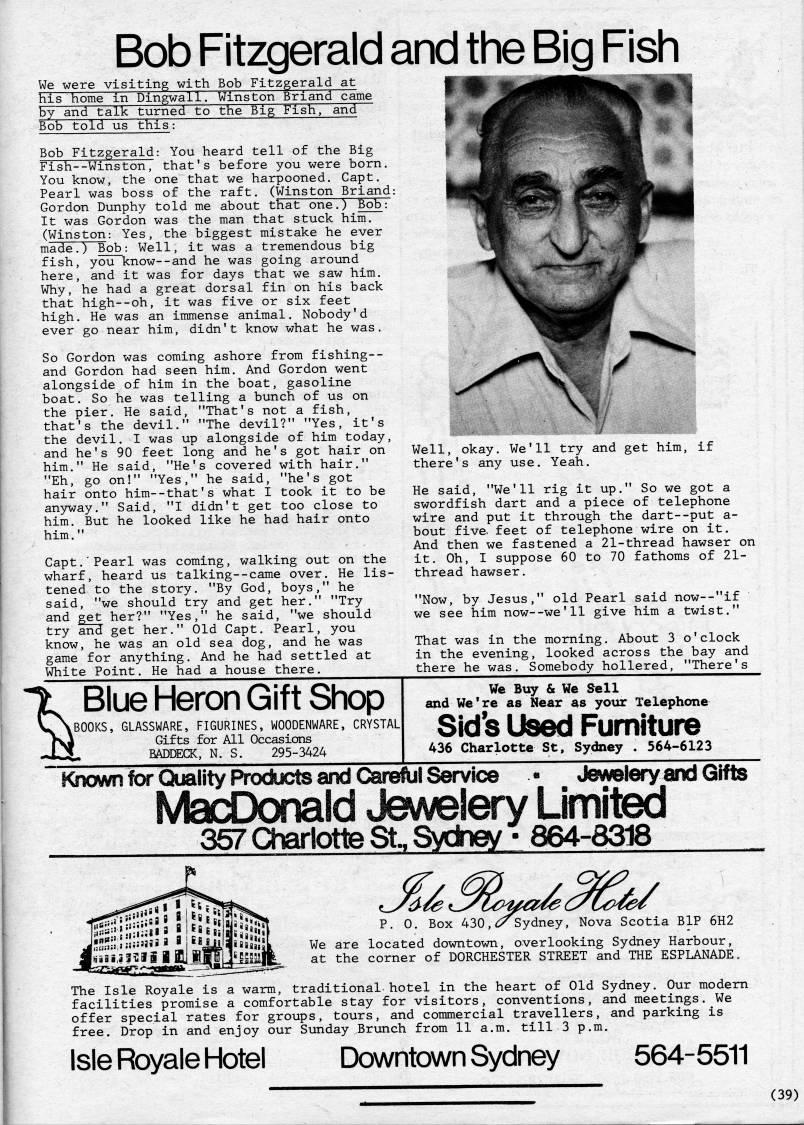 Published by Ronald Caplan on 1981/6/1 (751 reads)Bob Fitzgerald and the Big Fish We were visiting with Bob Fitzgerald at his home in Dingwall. Winston Briand came by and talk turned to the Big Fish • -' Bob told us this: and Bob Fitzgerald: You heard tell of the Big Fish--Winston, that's before you were born. You know, the one that we harpooned. Capt. Pearl was boss of the raft, (Winston Briand: Gordon Dunphy told me about that one,) BobT It was Gordon was the man that stuck him. (Winston: Yes, the biggest mistake he ever made,) Bob: Well, it was a tremendous big fish, you know--and he was going around here, and it was for days that we saw him. Why, he had a great dorsal fin on his back that high--oh, it was five or six feet high. He was an immense animal. Nobody'd ever go near him, didn't know what he was. So Gordon was coming ashore from fishing-- and Gordon had seen him. And Gordon went alongside of him in the boat, gasoline boat. So he was telling a bunch of us on the pier. He said, "That's not a fish, that's the devil." "The devil?" "Yes, it's the devil. I was up alongside of him today, and he's 90 feet long and he's got hair on him." He said, "He's covered with hair." "Eh, go on!" "Yes," he said, "he's got hair onto him--that's what I took it to be anyway." Said, "I didn't get too close to him. But he looked like he had hair onto him," Capt, Pearl was coming, walking out on the wharf, heard us talking--came over. He lis? tened to the story, "By God, boys," he said, "we should try and get her," "Try and get her?" "Yes," he said, "we should try and get her," Old Capt, Pearl, you know, he was an old sea dog, and he was game for anything. And he had settled at White Point, He had a house there. Well, okay. We'll try and get him, if there's any use. Yeah. He said, "We'll rig it up." So we got a swordfish dart and a piece of telephone wire and put it through the dart--put a- bout five, feet of telephone wire on it. And then we fastened a 21-thread hawser on it. Oh, I suppose 60 to 70 fathoms of 21- thread hawser. "Now, by Jesus," old Pearl said now--"if we see him now--we'11 give him a twist." That was in the morning. About 3 o'clock in the evening, looked across the bay and there he was. Somebody hollered, "There's 7. Blue Heron Gift Shop V BOOKS, GLASSWARE, FIGURINES, WOODENWARE, CRYSTAL P' Gifts for All Occasions BADDECK, N. S. 295-3424 We Buy & We Sell and We're as Near as yotrr Telephone Sid's Used Furniture 436 Charlotte St, Sydney . 564-6123 Known for Quality Products and CarefUl Service ?> Je ??Blery and Gifts MacDonald Jewelery Limited 357 Charlotte St.. Sydney ?? 864-8318 P, 0. Box 430, ('Sydney, Nova Scoti, Sydney, Nova Scotia BIP 6H2 overlooking Sydney Harbour, the corner of DORCHESTER STREET and THE ESPLANADE?? P, 0. Box 430 are located downtown The Isle Royale is a warm, traditional-hotel in the heart of Old Sydney, Our modem facilities promise a comfortable stay for visitors, conventions, and meetings. We offer special rates for groups, tours, and commercial travellers, and parking is free. Drop in and enjoy our Sunday Brunch from 11 a.m. till 3 p.m. isle Royale Hotel Downtown Sydney 564-5511 (39)