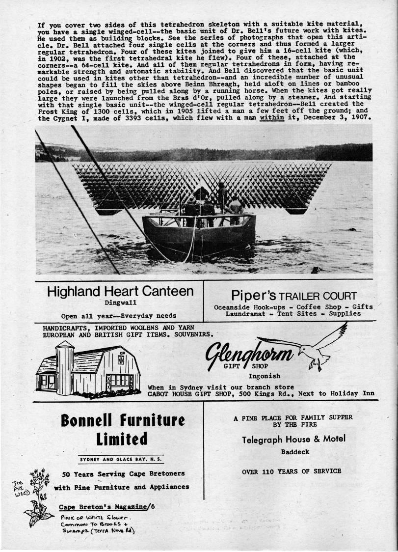 If you cover two sides of this tetrahedron skeleton with a suitable kite material, yoii have a single winged-cell • the basic unit of Dr. Bellas future work with kites. He used them as building blocks. See the series of photographs that open this arti? cle. Dr. Bell attached four single cells at the corners and thus formed a larger regular tetrahedron. Four of these kites joined to give him a 16-cell kite (which, in 1902, was the first tetrahedral kite he flew). Four of these, attached at the comers • a 64-cell kite. And all of them regular tetrahedrons in form, having re? markable strength and automatic stability. And Bell discovered that the basic unit could be used in kites other than tetrahedron • and an incredible number of unusual shapes began to fill the skies above Beinn Bhreagh, held aloft on lines or bamboo poles, or raised by being pulled along by a running horse. When the kites got really large they were launched from the Bras d'Or, pulled along by a steamer. And starting with that single basic unit • the winged-cell regular tetrahedron • Bell created the Frost King of 1300 cells, which in 1905 lifted a man a few feet off the ground; and the Cygnet I, made of 3393 cells, which flew with a maa within it, December 3, 1907. Highland Heart Canteen Dingwall Open all year • Everyday needs Piper's TRAILER COURT Oceanside Hook-ups - Coffee Shop - Gifts Laundramat - Tent Sites - Supplies HANDICRAFTS, IMPORTED W(X)LENS AND YARN EUROPEAN AND BRITISH GIFT ITEMS. SOUVENIRS. / GIFT / SHOP Ingonish When in Sydney visit our branch store CABOT HOUSE GIFT SHOP, 500 Kings Rd., Next to Holiday Inn Bonnell Furniture Limited SYDNEY AND GLACE BAY, N. S. yM.' 50 Years Serving Cape Bretoners ''' with Fine Fumitttre and Appliances A FINE H.ACE FOR FAMILY SUPPER BY THE PIRE Telegraph House & Motel Baddeck OVER 110 YEARS OF SERVICE Cape Breton's Magazine/6