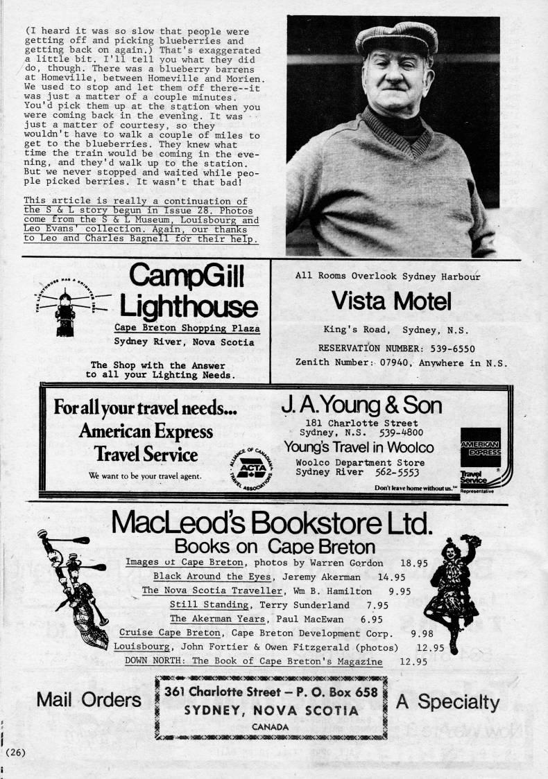 Published by Ronald Caplan on 1981/8/1 (373 reads)(I heard it was so slow that people were getting off and picking blueberries and getting back on again.) That's exaggerated a little bit. I'll tell you what they did do, th-ough. There was a blueberry barrens at Homeville, between Homeville and Morien. We used to stop and let them off there--it was just a matter of a couple minutes. You'd pick them up at the station when you were coming back in the evening. It was • just a matter of courtesy, so they wouldn't have to walk a couple of miles to get to the blueberries. They knew what time the train would be coming in the eve? ning, and they'd walk up to the station. But we never stopped and waited while peo? ple picked berries. It wasn't that bad! This article is really a continuation of the S & L story begun in Issue 28. Photos come from the S & L Museum, Louisbourg and Leo Evans' collection. Again, our thanks to Leo and Charles Bagnell for their help. f' CampGill Lighthouse Cape Breton Shopping Plaza Sydney River, Nova Scotia The Shop with the Answer to all your Lighting Needs. All Rooms Overlook Sydney Harbour Vista Motel King's Road, Sydney, N.S. RESERVATION NUMBER: 539-6550 Zenith Number: 07940, Anywhere in N.S. For all your travel needs*. American Express Travel Service /w'% We want to be your travel agent. ACTA r J.A.Ycxjng&Son; 181 Charlotte Street Sydney, N.S. 539-'800 Young's Travel in Woolco Woolco Department Store Sydney River 562-5553 Don't leave home without us.'' MacLeod's Bookstore Ltd. Books on Caoe Breton Images ut Cape Breton, photos by Warren Gordon 18.95 Black Around the Eyes, Jeremy Akerman 14.95 The Nova Scotia Traveller, Wm B. Hamilton 9.95 7.95 6.95 Cruise Cape Breton, Cape Breton Development Corp. 9.98 Louisbourg, John Fortier & Owen Fitzgerald (photos) 12. DOWN NORTH: The Book of Cape Breton's Magazine 12.95 Still Standing, Terry Sunderland The Akerman Years, Paul MacEwan Mail Orders I 361 Charlotte Street - P. O. Box 658 SYDNEY, NOVA SCOTIA I CANADA ' I A Specialty (26)
