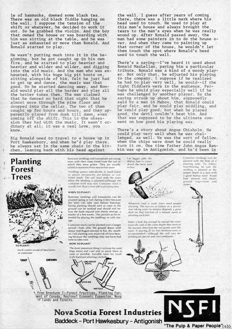 le of bannocks, downed some black tea. There was an old black fiddle hanging on the wall. I suppose the tension of the shift or whatever, he decided to work it out. So he grabbed the violin. And the boy that owned the house or was boarding with him was sitting at the table, and he was just as exhausted or more than Ronald. And Ronald started to play. He wasn't putting much into it in the be? ginning, but he got caught up in his own fire, and he started to play heavier and heavier and wilder and wilder, and digging into the old music. And the man who was ex? hausted, with his huge big pit boots on, sitting alongside of him, felt he just had to get up and dance, the music was that good. So he started dancing away, and Ron? ald would play all the harder and play all the better tunes then. The man claimed that he danced so hard that night that he almost wore through the pine floor and dropped into the cellar. The two of them caught up for hours and hours, and they ap? parently played from dusk till dawn, even coming off the shift. This is the obses? sion they had with the music. It wasn't or? dinary at all; it was a real love, you know. Big Ronald used to travel to a house up in Port Hawkesbury, and when he'd play there, he always sat in the same chair in the kit? chen, leaning back with his head against the wall. I guess after years of coming there, there was a little mark where his head used to touch. He used to play at this man's house and always brought the tears to the man's eyes when he was really wound up. After Ronald passed away, the man had some painters in to do the house o- ver. And when they came to painting up that corner of the house, he wouldn't let them touch the spot where Ronald's head used to touch the wall. There's a saying--I've heard it used about Ronald MacLellan, paying him a particular tribute. Ronald was a kind of a moody play? er. Not only that, he adjusted his playing to the company. I suppose if he realized he had to. play very well, he would--if the right fiddlers were in the audience. Per? haps he would play especially well if he was challenged by another player. So the saying struck up about him, supposedly said by a man in Mabou, that Ronald could play fair, and he could play middling, and he could play good; but when he played good, the devil couldn't beat him. And that was supposed to be the ultimate com? ment on how good his playing was. There's a story about Angus Chisholm. He could play very well when he was chal? lenged, as well. He was the sort of fellow, when the chips were down he could really turn it on. One time Father John Angus Ran? kin was up in Antigonish, and he'd been in Planting Forest Trees Barerc trees v which raised Seedl or pi Idiner Tonta usual WHE' ot seedlings vith their ro they were in nurseries ngs grown 1 and transplant ots freed from grown. They rom two to f IV idividually in Stic receptacles are kno stock. The the seedlinf. ner itself m V less than a TO PLANT soil stays wit is planted {a iy not). Conta year old it ph s are young the soi are usu 3 years mill p A/n IS 1 tht r though itinj'tin in ,lly ptr on the k IS '' be pi, the ??root seedlings and transplants cai ted spring or fall. Spring is best because the trees can take root before freezeup Spring planting should start as ground can be worked and should end be? fore the buds expand and shoots emerge, a matter of a few weeks. This period can be ex? tended by placing the seedlings in cold stor- Container stock can be planted over a longer period • from after the ground tliaws until about mid-August (except in hot, dry weath? er). Fall planting runs more risk of frost-heav? ing because the seedlings may not have had Container seedlings may b? ()lanted with the help of i planting ,tube. To reduct frost-heaving, be sure th? seedling is planted at tht proper depth in a spot witf a good humus layer. Avoif used trees need propei ure depends a greal )ugh to spread the e depth they ? soil gently cing of six feet betweer lended • although this will ! on species and site condi otaki HOW TO PLANT? he most important thing is to keep the seed- ngs moist and cool and to plant them as )on as possible. Suitable tools for small :ale bareroot plani t from Brochure 7--Forest Practices, Planting For- nent of Canada, Regional Economic Expansion, Nova of Lands and Forests. Nova Scotia Forest Industries Baddeck - Port Hawkesbury - Antigonish IN5FI "The Pulp & Paper People"(45)