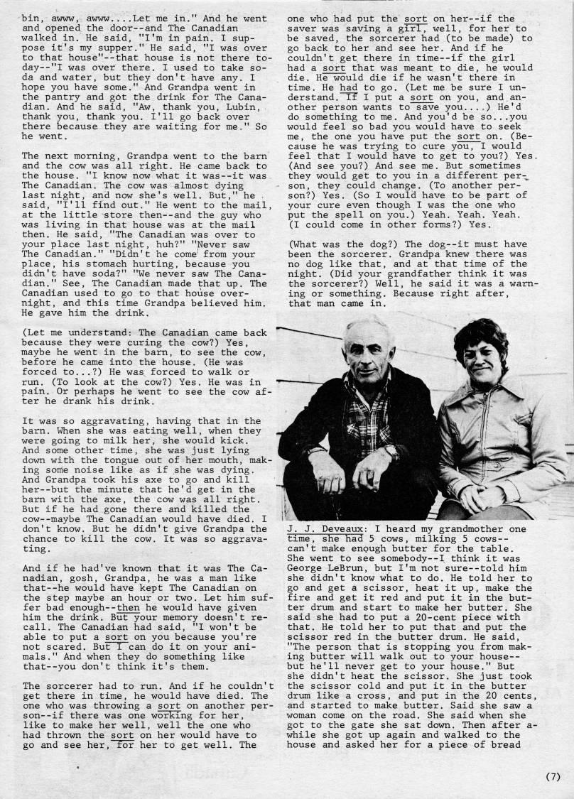 Published by Ronald Caplan on 1981/12/1 (258 reads)bin, awww, awww....Let me in." And he went and opened the door--and The Canadian walked in. He said, "I'm in pain. I sup? pose it's my supper." He said, "I was over to that house"--that house is not there to- day--"I was over there. I used to take so? da and water, but they don't have any, I hope you have some." And Grandpa went in the pantry and got the drink for The Cana? dian. And he said, "Aw, thank you, Lubin, thaiik you, thank you. I'll go back over there because they are waiting for me'" So he went. The next morning, Grandpa went to the barn and the cow was all right. He came back to the house. "I know now what it was--it was The Canadian. The cow was almost dying last night, and now she's well. But," he . said, "I'll find out." He went to the mail, at the little store then--and the guy who was living in that house was at the mail then. He said, "The Canadian was over to your place last night, huh?" "Never saw The Canadian." "Didn't he come' from your place, his stomach hurting, because you didn't have soda?" "We never saw The Cana? dian." See, The Canadian made that up. The Canadian used to go to that house over? night, and this time Grandpa believed him. He gave him the drink. (Let me understand: The Canadian came back because they were curing the cow?) Yes, maybe he went in the barn, to see the cow, before he came into the house. (He was forced to...?) He was forced to walk or run. (To look at the cow?) Yes. He was in pain. Or perhaps he went to see the cow af? ter he drank his drink. It was so aggravating, having that in the barn. When she was eating well, when they were going to milk her, she would kick. And some other time, she was just lying down with the tongue out of her mouth, mak? ing some noise like as if she was dying. And Grandpa took his axe to go and kill her--but the minute that he'd get in the bam with the axe, the cow was all right. But if he had gone there and killed the cow--maybe The Canadian would have died, I don't know. But he didn't give Grandpa the chance to kill the cow. It was so aggrava? ting. And if he had've known that it was The Ca? nadian, gosh. Grandpa, he was a man like that--he would have kept The Canadian on the step maybe an hour or two. Let him suf? fer bad enough--then he would have given him the drink. But your memory doesn't re? call. The Canadian had said, "I won't be able to put a sort on you because you're not scared. But I can do it on your ani? mals ." And when they do something like that--you don't think it's them. The sorcerer had to run. And if he couldn't get there in time, he would have died. The one who was throwing a sort on another per- son--if there was one working for her, like to make her well, well the one who had thrown the sort on her would have to go and see her, for her to get well. The one who had put the sort on her--if the saver was saving a girl, well, for her to be saved, the sorcerer had (to be made) to go back to her and see her. And if he couldn't get there in time--if the girl had a sort that was meant to die, he would die. He would die if he wasn't there in time. He had to go. (Let me be sure I un? der stand."~T7 I put a sort on you, and.an? other person wants to save you..,,) He'd do something to me. And you'd be so...you would feel so bad you would have to seek me, the one you have put the sort on. (Be? cause he was trying to cure you, I would feel that I would have to get to you?) YeSo (And see you?) And see me. But sometimes they would get to you in a different per-' son, they could change. (To another per? son?) Yes. (So I woulcl have to be part of your cure even though I was the one who put the spell on you.) Yeah. Yeah. Yeah. (I could come in other forms?) Yes. (What was the dog?) The dog--it must have been the sorcerer. Grandpa knew there was no dog like that, and at that time of the night. (Did your grandfather think it was the sorcerer?) Well, he said it was a warn? ing or something. Because right after, that man came in. J. J. Deveaux: I heard my grandmother one time, she had 5 cows, milking 5 cows-- can't make enough butter for the table. She went to see somebody--! think it was George LeBrun, but I'm not sure--told him she didn't know what to do. He told her to go and get a scissor, heat it up, make the fire and get it red and put it in the but? ter drum and start to make her butter. She said she had to put a 20-cent piece with that. He told her to put that and put the scissor red in the butter drum. He said, "The person that is stopping you from mak? ing butter will walk out to your house-- but he'll never get to your house." But she didn't heat the scissor. She just took the scissor cold and put it in the butter drum like a cross, and put in the 20 cents, and started to make butter. Said she saw a woman come on the road. She said when she got to the gate she sat down. Then after a- while she got up again and walked to the house and asked her for a piece of bread (7)
