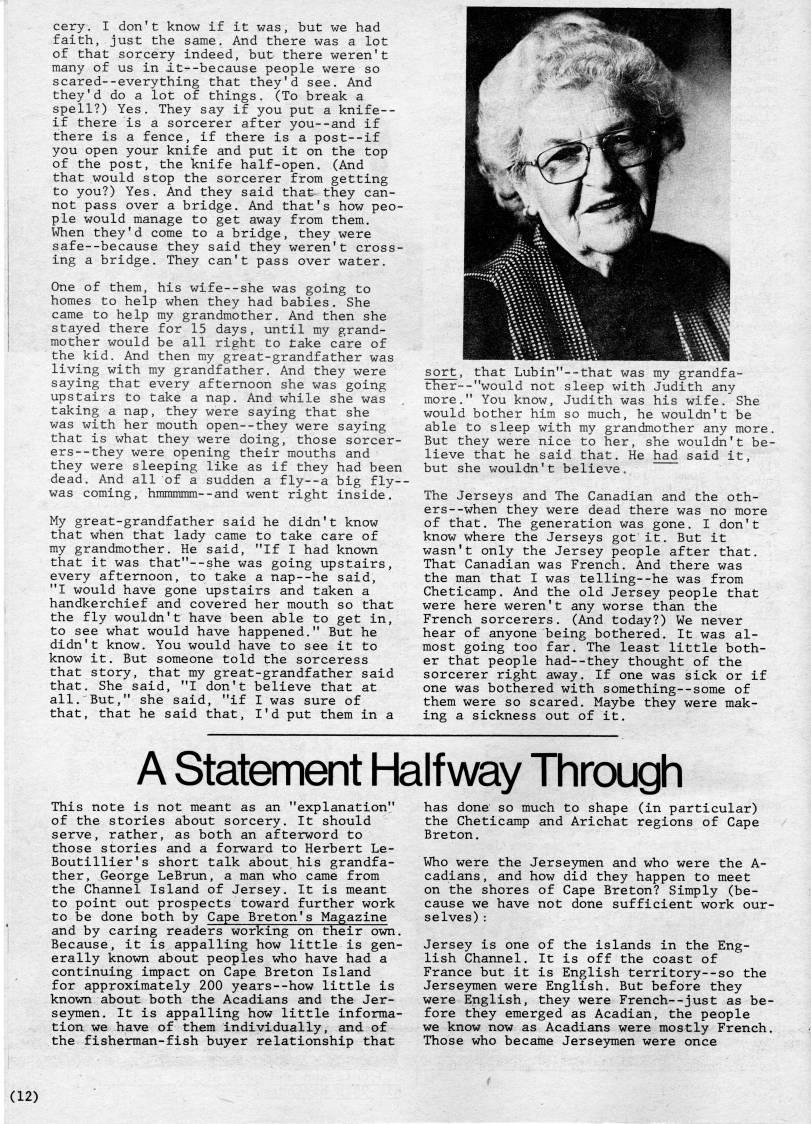Published by Ronald Caplan on 1981/12/1 (283 reads)eery. I don't know if it was, but we had faith, just the same. And there was a lot of that sorcery indeed, but there weren't many of us in it--because people were so scared--everything that they'd see. And they'd do a lot of things. (To break a spell?) Yes. They say if you put a knife-- if there is a sorcerer after you--and if there is a fence, if there is a post--if you open your knife and put it on the top of the post, the knife half-open. (And that would stop the sorcerer from getting to you?) Yes. And they said that- they can? not pass over a bridge. And that's how peo? ple would manage to get away from them. When they'd come to a bridge, they were safe--because they said they weren't cross? ing a bridge. They can't pass over water. One of them, his wife--she was going to homes to help when they had babies. She came to help my grandmother. And then she stayed there for 15 days, until my grand? mother would be all right to take care of the kid. And then my great-grandfather was living with my grandfather. And they were saying that every afternoon she was going upstairs to take a nap. And while she was taking a nap, they were saying that she was with her mouth open--they were saying that is what they were doing, those sorcer? ers --they were opening their mouths and they were sleeping like as if they had been dead. And all of a sudden a fly--a big fly-- was coming, hmmmmm--and went right inside. My great-grandfather said he didn't know that when that lady came to take care of my grandmother. He said, "If I had known that it was that"--she was going upstairs, every afternoon, to take a nap--he said, "I would have gone upstairs and taken a handkerchief and covered her mouth so that the fly wouldn't have been able to get in, to see what would have happened." But he didn't know. You would have to see it to know it. But someone told the sorceress that story, that my great-grandfather said that. She said, "I don't believe that at all. But," she said, "if I was sure of that, that he said that, I'd put them in a sort, that Lubin"--that was my grandfa- ther--"would not sleep with Judith any more." You know, Judith was his wife. She would bother him so much, he wouldn't be able to sleep with my grandmother any more. But they were nice to her, she wouldn't be? lieve that he said that. He had said it, but she wouldn't believe. The Jerseys and The Canadian and the oth? ers --when they were dead there was no more of that. The generation was gone. I don't know where the Jerseys got it. But it wasn't only the Jersey people after that. That Canadian was French. And there was the man that I was telling--he was from Cheticamp. And the old Jersey people that were here weren't any worse than the French sorcerers. (And today?) We never hear of anyone being bothered. It was al? most going too far. The least little both? er that people had--they thought of the sorcerer right away. If one was sick or if one was bothered with something--some of them were so scared. Maybe they were mak? ing a sickness out of it. A Statement Halfway Through This note is not meant as an "explanation" of the stories about sorcery. It should serve, rather, as both an afterword to those stories and a forward to Herbert Le- Boutillier's short talk about his grandfa? ther, George LeBrun, a man who came from the Channel Island of Jersey. It is meant to point out prospects toward further work to be done both by Cape Breton's Magazine and by caring readers working on their own. Because, it is appalling how little is gen? erally known about peoples who have had a continuing impact on Cape Breton Island for approximately 200 years--how little is known about both the Acadians and the Jer? seymen. It is appalling how little informa? tion we have of them individually, and of the fisherman-fish buyer relationship that has done so much to shape (in particular) the Cheticamp and Arichat regions of Cape Breton. Who were the Jerseymen and who were the A- cadians, and how did they happen to meet on the shores of Cape Breton? Simply (be? cause we have not done sufficient work our? selves) : Jersey is one of the islands in the Eng? lish Channel. It is off the coast of France but it is English territory--so the Jerseymen were English. But before they were English, they were French--just as be? fore they emerged as Acadian, the people we know now as Acadians were mostly French. Those who became Jerseymen were once