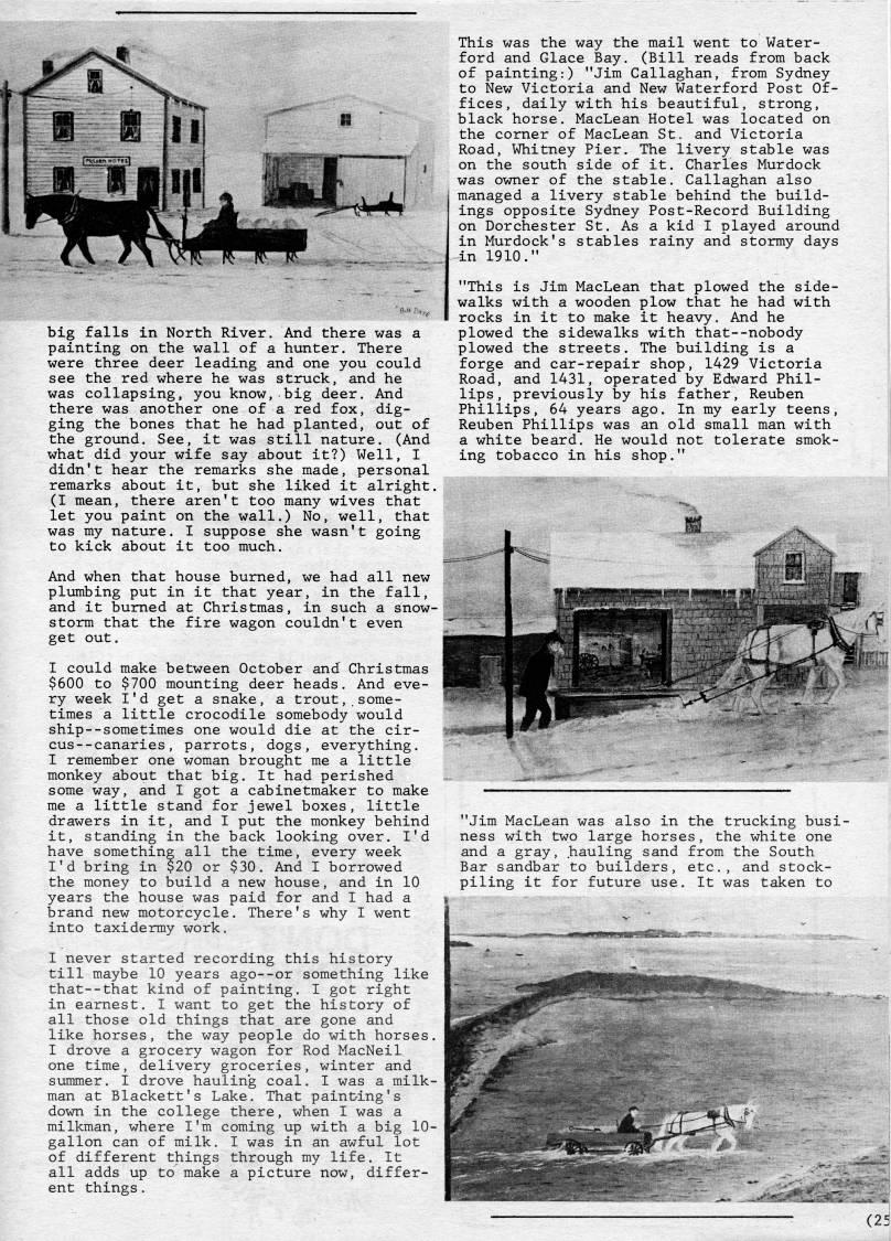 Published by Ronald Caplan on 1981/12/1 (288 reads)big falls in North River. And there was a painting on the wall of a hunter. There were three deer leading and one you could see the red where he was struck, and he was collapsing, you know, big deer. And there was another one of a red fox, dig? ging the bones that he had planted, out of the ground. See, it was still nature. (And what did your wife say about it?) Well, I didn't hear the remarks she made, personal remarks about it, but she liked it alright. (I mean, there aren't too many wives that let you paint on the wall.) No, well, that was my nature. I suppose she wasn't going to kick about it too much. And when that house burned, we had all new plumbing put in it that year, in the fall, and it burned at Christmas, in such a snow? storm that the fire wagon couldn't even get out. I could make between October and Christmas $600 to $700 mounting deer heads. And eve? ry week I'd get a snake, a trout,.some? times a little crocodile somebody would ship--sometimes one would die at the cir? cus --canaries , parrots, dogs, everything. I remember one woman brought me a little monkey about that big. It had perished some way, and I got a cabinetmaker to make me a little stand for jewel boxes, little drawers in it, and I put the monkey behind it, standing in the back looking over. I'd have something all the time, every week I'd bring in $20 or $30. And I borrowed the money to build a new house, and in 10 years the house was paid for and I had a brand new motorcycle. There's why I went into taxidermy work. I never started recording this history till maybe 10 years ago--or something like that--that kind of painting. I got right in earnest. I want to get the history of all those old things that are gone and like horses, the way people do with horses. I drove a grocery wagon for Rod MacNeil one time, delivery groceries, winter and summer. I drove hauling coal. I was a milk? man at Blackett's Lake. That painting's down in the college there, when I was a milkman, where I'm coming up with a big 10- gallon can of milk. I was in an awful lot of different things through my life. It all adds up to make a picture now, differ? ent things. This was the way the mail went to Water- ford and Glace Bay. (Bill reads from back of painting:) "Jim Callaghan, from Sydney to New Victoria and New Waterford Post Of? fices , daily with his beautiful, strong, black horse. MacLean Hotel was located on the corner of MacLean Sto and Victoria Road, Whitney Pier. The livery stable was on the south side of it. Charles Murdock was owner of the stable. Callaghan also managed a livery stable behind the build? ings opposite Sydney Post-Record Building on Dorchester St. As a kid I played around in Murdock's stables rainy and stormy days in 1910." "This is Jim MacLean that plowed the side? walks with a wooden plow that he had with rocks in it to make it heavy. And he plowed the sidewalks with that--nobody plowed the streets. The building is a forge and car-repair shop, 1429 Victoria Road, and 1431, operated by Edward Phil? lips, previously by his father, Reuben Phillips, 64 years ago. In my early teens, Reuben Phillips was an old small man with a white beard. He would not tolerate smok? ing tobacco in his shop." "Jim MacLean was also in the trucking busi? ness with two large horses, the white one and a gray, hauling sand from the South Bar sandbar to builders, etc., and stock? piling it for future use. It was taken to