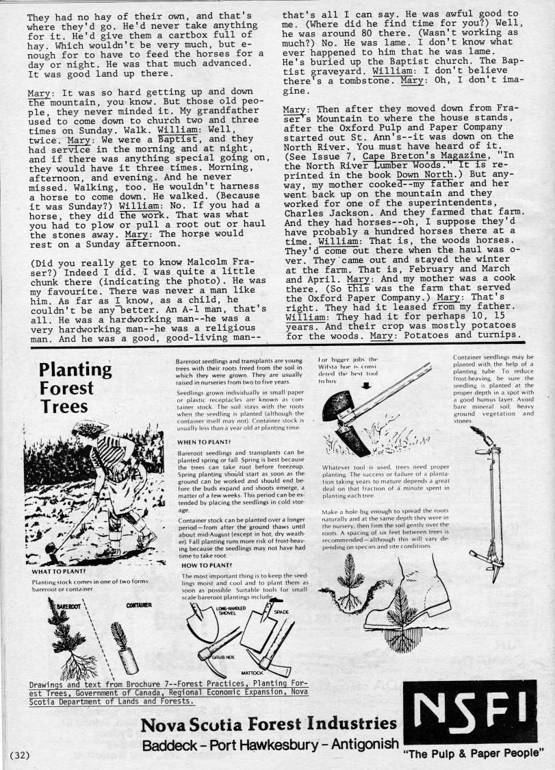 They had no hay of their own, and that's where they'd go. He'd never take anything for it. He'd give them a cartbox full of hay. Which wouldn't be very much, but e- nough for to have to feed the horses for a day or night. He was that much advanced. It was good land up there. Mary: It was so hard getting up and down the mountain, you know. But those old peo? ple, they never minded it. My grandfather used to come down to church two and three times on Sunday. Walk. William: Well, Mary twice. Mary: We were a Baptist, and they had service in the morning and at night, and if there was anything special going on, they would have it three times. Morning, afternoon, and evening. And he never missed. Walking, too. He wouldn't harness a horse to come down. He walked. (Because it was Sunday?) William: No. If you had a horse, they did the work. That was what you had to plow or pull a root out or haul the stones away. Mary: The horse would rest on a Sunday afternoon. (Did you really get to know Malcolm Fra? ser?) Indeed I did. I was quite a little chunk there (indicating the photo). He was my favourite. There was never a man like him. As far as ][ know, as a child, he couldn't be any better. An A-1 man, that's all. He was a hardworking man--he was a very hardworking man--he was a religious man. And he was a good, good-living man-- that's all I can say. He was awful good to mOo (Where did he find time for you?) Well, he was around 80 there. (Wasn't working as much?) No. He was lame. I don't know what ever happened to him that he was lame. He's buried up the Baptist church. The Bap? tist graveyard. William: I don't believe there's a tombstone. Mary: Oh, I don't ima? gine. Mary: Then after they moved down from Fra- ser s Mountain to where the house stands, after the Oxford Pulp and Paper Company started out St. Ann's--it was down on the North River, You must have heard of it. (See Issue 7, Cape Breton's Magazine, "In the North River Lumber Woods." It is re? printed in the book Down North.) But any? way, my mother cooked--my father and her went back up on the mountain and they worked for one of the superintendents, Charles Jackson. And they farmed that farm. And they had horses--oh, I suppose they'd have probably a hundred horses there at a time. William: That is, the woods horses. They'd come out there when the haul was o- ver. They came out and stayed the winter at the farm. That is, February and March and April. Mary: And my mother was a cook there. (So this was the farm that served the Oxford Paper Company.) Mary: That's right. They had it leased from my father. William: They had it for perhaps 10, 15 years. And their crop was mostly potatoes for the woods. Mary: Potatoes and turnips. Planting Forest Trees Bareroot seedlings and transplants are young trees with their roots freed from the soil in which they were grown. They are usually raised in nurseries from two to five years. Seedlings grown individually in small paper or plastic receptacles are known as con? tainer stock. The soil stays with the roots when the seedling is planted (although the container itself may not). Container stock is usually less than a year old at planting time. WHEN TO PLANT? Bareroot seedlings and transplants can be planted spring or fall. Spring is best because the trees can take root before freezeup. Spring planting should start as soon as the ground can be worked and should end be? fore the buds expand and shoots emerge, a matter of a few weeks. This period can be ex? tended by placing the seedlings in cold stor? age. n be planted over a longer period • from after the ground th. about mid-August (except in hot, dry weath? er). Fall planting runs more risk of frost-heav? ing because the seedlings may not have had e to take root. Container seedlings may be planted with the help of a planting tube To reduce frost-heaving, be sure the seedling is planted at the proper depth in a spot with a good humus layer Avoid jil, heavy planting each tree. need proper lure of a planta- depends a great minute spent in a hole big enough to spread the r lly and at the same depth they v then firm these A spacing of six feel ided • although • Drawings and text from Brochure 7--Forest Practices, Planting For? est Trees, Government of Canada, Regional Economic Expansion, Nova Scotia Department of Lands and Forests. (32) Nova Scotia Forest Industries Baddeck- Port Hawkesbury - Antigonish IN5FI The Pulp & Paper People"