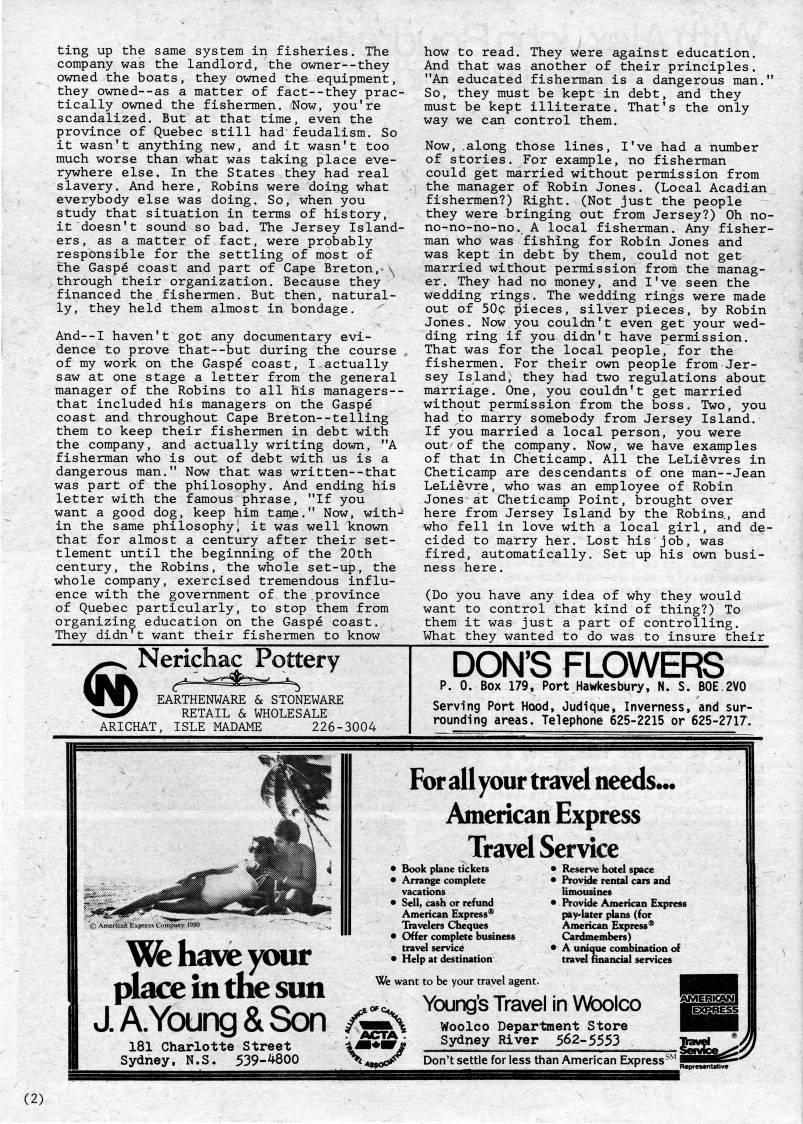 ting up the same system in fisheries. The company was the landlord, the owner--they owned the boats, they owned the equipment, they owned--as a matter of fact--they prac? tically owned the fishermen. Now, you're scandalized. But at that time, even the province of Quebec still had feudalism. So it wasn't anything new, and it wasn't too much worse than what was taking place eve? rywhere else. In the States they had real slavery. And here, Robins were doing what everybody else was doing. So, when you study that situation in terms of history, it doesn't sound so bad. The Jersey Island? ers, as a matter of fact, were probably responsible for the settling of most of the Gaspe coast and part of Cape Breton, ' through their organization. Because they financed the fishermen. But then, natural? ly, they held them almost in bondage. And--I haven't got any documentary evi? dence to prove that--but during the course of my work on the Gaspe coast, I actually saw at one stage a letter from the general manager of the Robins to all his managers-- that included his managers on the Gaspe coast and throughout Cape Breton--telling them to keep their fishermen in debt with the company, and actually writing down, "A fisherman who is out of debt with us is a dangerous man." Now that was written--that was part of the philosophy. And ending his letter with the famous phrase, "If you want a good dog, keep him tame." Now, with? in the same philosophy, it was well known that for almost a century after their set? tlement until the beginning of the 20th century, the Robins, the whole set-up, the whole company, exercised tremendous influ? ence with the government of the province of Quebec particularly, to stop them from organizing education on the Gaspe coast. They didn't want their fishermen to know how to read. They were against education. And that was another of their principles. "An educated fisherman is a dangerous man." So, they must be kept in debt, and they must be kept illiterate. That's the only way we can control them. Now, .along those lines, I've had a number of stories. For example, no fisherman could get married without permission from the manager of Robin Jones. (Local Acadian fishermen?) Right. (Not just the people they were bringing out from Jersey?) Oh no- no-no-no-no. A local fisherman. Any fisher? man who was fishing for Robin Jones and was kept in debt by them, could not get married without permission from the manag? er. They had no money, and I've seen the wedding rings. The wedding rings were made out of 50c pieces, silver pieces, by Robin Jones. Now you couldn't even get your wed? ding ring if you didn't have permission. That was for the local people, for the fishermen. For their own people from Jer? sey Island, they had two regulations about marriage. One, you couldn't get married without permission from the boss. Two, you had to marry somebody from Jersey Island. If you married a local person, you were out of the company. Now, we have examples of that in Cheticamp. All the LeLievres in Cheticamp are descendants of one man--Jean LeLievre, who was an employee of Robin Jones at Cheticamp Point, brought over here from Jersey Island by the Robins., and who fell in love with a local girl, and de? cided to marry her. Lost his job, was fired, automatically. Set up his own busi? ness here. (Do you have any idea of why they would want to control that kind of thing?) To them it was just a part of controlling. What they wanted to do was to insure their #Nerichac Pottery EARTHENWARE & STONEWARE RETAIL & WHOLESALE ?? ARICHAT, ISLE MADAME 226-3004 DON'S FLOWERS p. 0. Box 179, Port Hawkesbury, N. S. B0E,2V0 Serving Port Hood, Judique, Inverness, and sur? rounding areas. Telephone 625-2215 or 625-2717. g'Ameriedft Express Company 19it0 'haveyour place in the sun J.A.Young&Son; 181 Charlotte Street Sydney, N.S. 539-'800 For all your travel needs. American Express Travel Service • Book plane tickets • Arrange complete vacations • Sell, cash or refund American Express? Travelers Cheques • Offer complete business travel service • Help at destination We want to be your travel agent. • Reserve h