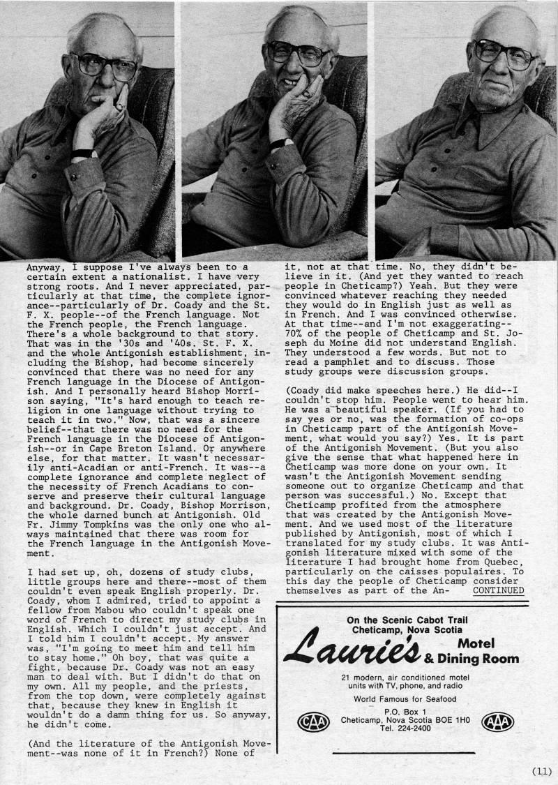 Anyway, 1 suppose I've always been to a certain extent a nationalist. I have very strong roots. And I never appreciated, par? ticularly at that time, the complete ignor? ance- -particularly of Dr. Coady and the St. F. X. people--of the French language. Not the French people, the French language. There's a whole background to that story. That was in the '30s and '40s. St. F. X. and the whole Antigonish establishment, in? cluding the Bishop, had become sincerely convinced that there was no need for any French language in the Diocese of Antigon? ish. And I personally heard Bishop Morri? son saying, "It's hard enough to teach re? ligion in one language without trying to teach it in two." Now, that was a sincere belief--that there was no need for the French language in the Diocese of Antigon? ish- -or in Cape Breton Island. Or anywhere else, for that matter. It wasn't necessar? ily anti-Acadian or anti-French. It was--a complete ignorance and complete neglect of the necessity of French Acadians to con? serve and preserve their cultural language and background. Dr. Coady, Bishop Morrison, the whole darned bunch at Antigonish. Old Fr. Jimmy Tompkins was the only one who al? ways maintained that there was room for the French language in the Antigonish Move? ment. I had set up, oh, dozens of study clubs, little groups here and there--most of them couldn't even speak English properly. Dr. Coady, whom I admired, tried to appoint a fellow from Mabou who couldn't speak one word of French to direct my study clubs in English. Which I couldn't just accept. And I told him I couldn't accept. My answer was, "I'm going to meet him and tell him to stay home." Oh boy, that was quite a fight, because Dr. Coady was not an easy man to deal with. But I didn't do that on my own. All my people, and the priests, from the top down, were completely against that, because they knew in English it wouldn't do a damn thing for us. So anyway, he didn't come. (And the literature of the Antigonish Move? ment- -was none of it in French?) None of it, not at that time. No, they didn't be? lieve in it. (And yet they wanted to reach people in Cheticamp?) Yeah. But they were convinced whatever reaching they needed they would do in English just as well as in French. And I was convinced otherwise. At that time--and I'm not exaggerating-- 70% of the people of Cheticamp and St. Jo? seph du Moine did not understand English. They understood a few words. But not to read a pamphlet and to discuss. Those study groups were discussion groups. (Coady did make speeches here.) He did--I couldn't stop him. People went to hear him. He was a beautiful speaker. (If you had to say yes or no, was the formation of co-ops in Cheticamp part of the Antigonish Move? ment, what would you say?) Yes. It is part of the Antigonish Movement. (But you also give the sense that what happened here in Cheticamp was more done on your own. It wasn't the Antigonish Movement sending someone out to organize Cheticamp and that person was successful.) No. Except that Cheticamp profited from the atmosphere that was created by the Antigonish Move- m.ent. And we used most of the literature published by Antigonish, most of which I translated for my study clubs. It was Anti? gonish literature mixed with some of the literature I had brought home from Quebec, particularly on the caisses populaires. To this day the people of Cheticamp consider themselves as part of the An- CONTINUED On the Scenic Cabot Trail Cheticamp, Nova Scotia #-'A Motel & Dining Room 21 modern, air conditioned motel units with TV, phone, and radio World Famous for Seafood P.O. Box 1 Cheticamp, Nova Scotia BOE IHO Tel. 224-2400 (11)