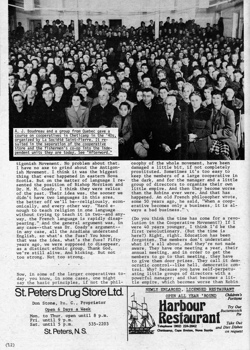 '''anil ?? A. J. Boudreau and a gr H course on cooperatives ?? organized by La Societe H suited in the separatio ?? store and the fishermen ?? pendent units they are oup from Quebec gave a in Cheticamp in the '40s, Saint-Pierre. It re- n of the cooperative 's co-op into the inde- today. See "Afterword." ' ? m'm w mm t' f *i*i. tigonish Movement. No problem about that. I have no axe to grind about the Antigon? ish Movement. I think it was the biggest thing that ever happened in eastern Nova Scotia. But on the matter of language I re? sented the position of Bishop Morrison and Dr. M. M. Coady. I think they were relics of the past. Their idea was, the sooner we didn't have two languages in this area, the better off we'll be--religiously, econ? omically, and every other way • "Hard e- nough to teach religion in one language without trying to teach it in two--and any? way, the French language is rapidly disap? pearing." And the general argument was, in any case--that was Dr. Coady's argument-- in any case, all the Acadians understand English, so what's the fuss? You know, that was the idea, what's the fuss? Fifty years ago, we were supposed to disappear, as a distinct ethnic group. Thank God, we're still alive. And kicking. But not too strong. Not too strong. Now, in some of the larger cooperatives to? day, you know, in some cases, one might say the basic principles, if not the phil? osophy of the whole movement, have been damaged a little bit, if not completely prostituted. Sometimes it's too easy to keep the members of a large cooperative in the dark, and for the manager and a little group of directors to organize their own little empire. And then they become worse than the Robins ever were. And that has happened. An old French philosopher wrote, some 50 years ago, he said, "When a coop-' erative becomes only a business, it is al? ways a bad business." ' (Do you think the time has come for a revo? lution in the Cooperative Movement?) If I were 40 years younger, I think I'd be the first revolutionary. (But the time is here?) Right, right. Education has been forgotten. The members don't understand what it's all about. And they're not made aware. They have one meeting a year, their annual meeting, and in order to get the members to go to that meeting, they have to give them door prizes. They call it dem? ocratic control--like hell, democratic con? trol. Why? Because you have self-perpetu? ating little groups of directors with a powerful manager; and that becomes a lit? tle empire, which becomes worse than Robin St. Peters Drug Store Ltd. Don Stone, I'n. C, Proprietor Open 6 Days a Week Mon. to Thur. open until 8 p.m. Fri. until 9 p.m. Sat. until 5 p.m. 535-2203 StPfeters,N.S. NEWLY ENLARGED. LICENSED RESTAURANT OPEN ALL YEAR 'ROUND Children's Portions Harbour Restaurant Try Our Butterscotch Pie Take Out Telephone (902) 224-2042 ' • j 2>/e/ Dishes Cheticamp, Cape Brvton, Nova Scotia q • request (12)