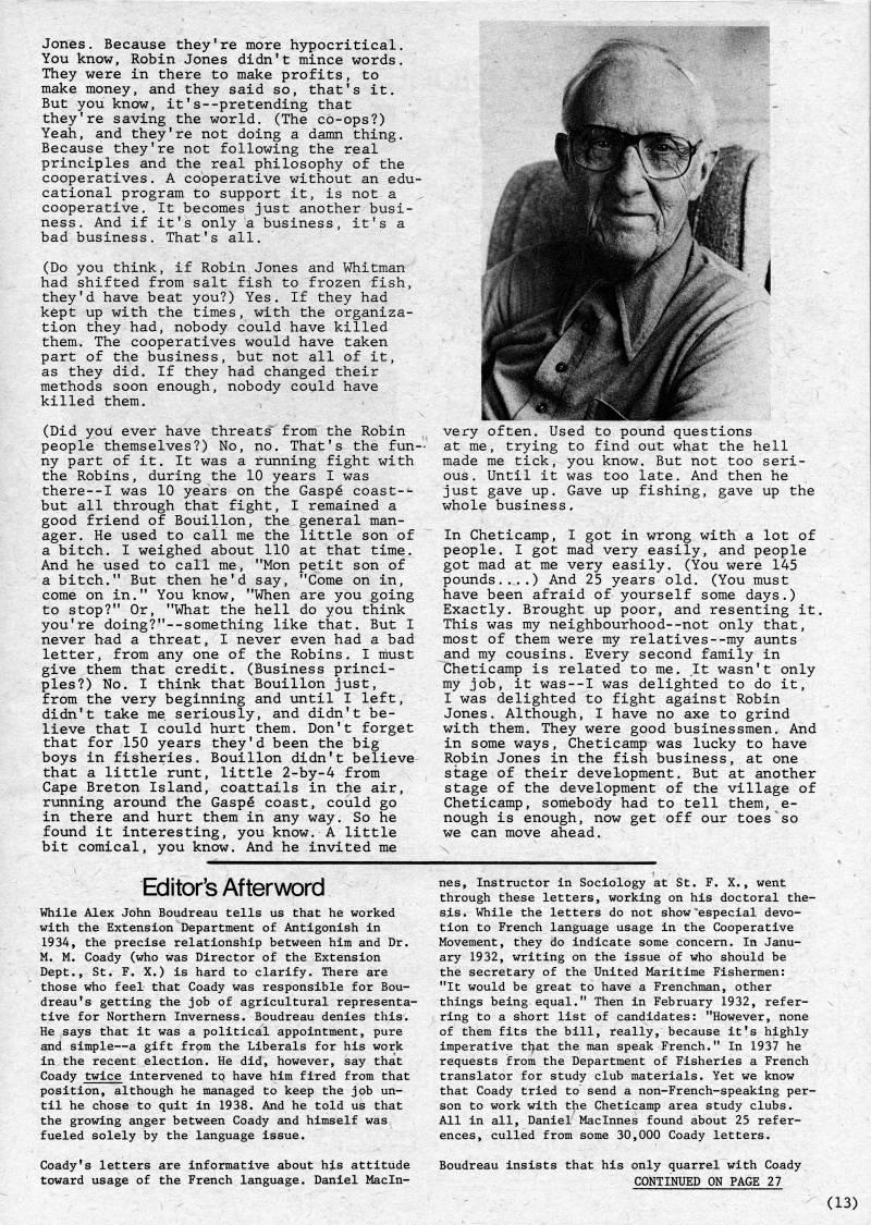 Published by Ronald Caplan on 1982/8/1 (325 reads)Jones. Because they're more hypocritical. You know, Robin Jones didn't mince words. They were in there to make profits, to make money, and they said so, that's it. But you know, it's--pretending that they're saving the world. (The co-ops?) Yeah, and they're not doing a damn thing. Because they're not following the real principles and the real philosophy of the cooperatives. A cooperative without an edu? cational program to support it, is not a cooperative. It becomes just another busi? ness. And if it's only a business, it's a bad business. That's all. (Do you think, if Robin Jones and Whitman had shifted from salt fish to frozen fish, they'd have beat you?) Yes. If they had kept up with the times, with the organiza? tion they had, nobody could have killed them. The cooperatives would have taken part of the business, but not all of it, as they did. If they had changed their methods soon enough, nobody could have killed them. (Did you ever have threats from the Robin people themselves?) No, no. That's the fun? ny part of it. It was a running fight with the Robins, during the 10 years I was there--I was 10 years on the Gaspe coast-- but all through that fight, I remained a good friend of Bouillon, the general man? ager. He used to call me the little son of a bitch. I weighed about 110 at that time. And he used to call me, "Mon petit son of a bitch." But then he'd say, "Come on in, come on in." You know, "When are you going to stop?" Or, "What the hell do you think you're doing?"--something like that. But I never had a threat, I never even had a bad letter, from any one of the Robins. I must give them that credit. (Business princi? ples?) No. I think that Bouillon just, from the very beginning and until I left, didn't take me seriously, and didn't be? lieve that I could hurt them. Don't forget that for 150 years they'd been the big boys in fisheries. Bouillon didn't believe that a little runt, little 2-by-4 from Cape Breton Island, coattails in the air, running around the Gaspe coast, could go in there and hurt them in any way. So he found it interesting, you know. A little bit comical, you know. And he invited me very often. Used to pound questions at me, trying to find out what the hell made me tick, you know. But not too seri? ous. Until it was too late. And then he just gave up. Gave up fishing, gave up the whole business. In Cheticamp, I got in wrong with a lot of people. I got mad very easily, and people got mad at me very easily. (You were 145 pounds....) And 25 years old. (You must have been afraid of yourself some days.) Exactly. Brought up poor, and resenting it. This was my neighbourhood--not only that, most of them were my relatives--my aunts and my cousins. Every second family in Cheticamp is related to me. .It wasn't only my job, it was--I was delighted to do it, I was delighted to fight against Robin Jones. Although, I have no axe to grind with them. They were good businessmen. And in some ways, Cheticamp was lucky to have Rpbin Jones in the fish business, at one stage of their development. But at another stage of the development of the village of Cheticamp, somebody had to tell them, e- nough is enough, now get off our toes so we can move ahead. Editor's Afterword While Alex John Boudreau tells us that he worked with the Extension Department of Antigonish in 1934, the precise relationship between him and Dr. M. M. Coady (who was Director of the Extension Dept., St. F. X.) is hard to clarify. There are those who feel that Coady was responsible for Bou? dreau 's getting the job of agricultural representa? tive for Northern Inverness. Boudreau denies this. He says that it was a political appointment, pure and simple • a gift from the Liberals for his work in the recent election. He did, however, say that Coady twice intervened to have him fired from that position, although he managed to keep the job un? til he chose to quit in 1938. And he told us that the growing anger between Coady and himself was fueled solely by the language issue. Coady's letters are informative about his attitude toward usage of the French language. Daniel Macln? nes, Instructor in Sociology at St. F. X., went through these letters, working on his doctoral the? sis. While the letters do not show'especial devo? tion to French language usage in the Cooperative Movement, they do indicate some concern. In Janu? ary 1932, writing on the issue of who should be the secretary of the United Maritime Fishermen: "It would be great to have a Frenchman, other things being equal." Then in February 1932, refer? ring to a short list of candidates: "However, none of them fits the bill, really, because it's highly imperative that the man speak French." In 1937 he requests from the Department of Fisheries a French translator for study club materials. Yet we know that Coady tried to send a non-French-speaking per? son to work with the Cheticamp area study clubs. All in all, Daniel Maclnnes found about 25 refer? ences, culled from some 30,000 Coady letters. Boudreau insists that his only quarrel with Coady