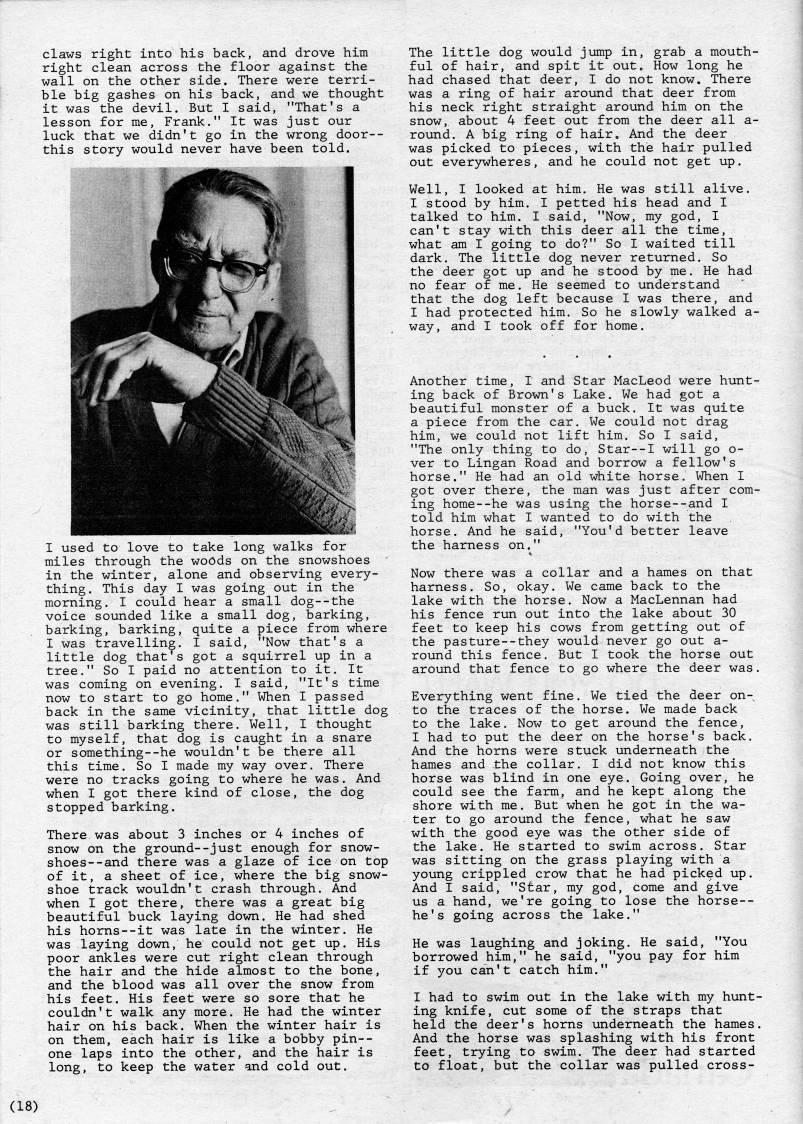 Published by Ronald Caplan on 1982/8/1 (220 reads)claws right into his back, and drove him right clean across the floor against the wall on the other side. There were terri? ble big gashes on his back, and we thought it was the devil. But I said, "That's a lesson for me, Frank." It was just our luck that we didn't go in the wrong door-- this story would never have been told. I used to love to take long walks for miles through the wo6ds on the snowshoes in the winter, alone and observing every? thing. This day I was going out in the morning. I could hear a small dog--the voice sounded like a small dog, barking, barking, barking, quite a piece from where I was travelling. I said, "Now that's a little dog that's got a squirrel up in a tree." So I paid no attention to it. It was coming on evening. I said, "It's time now to start to go home." When I passed back in the same vicinity, that little dog was still barking there. Well, I thought to myself, that dog is caught in a snare or something--he wouldn't be there all this time. So I made my way over. There were no tracks going to where he was. And when I got there kind of close, the dog stopped barking. There was about 3 inches or 4 inches of snow on the ground--just enough for snow- shoes--and there was a glaze of ice on top of it, a sheet of ice, where the big snow- shoe track wouldn't crash through. And when I got there, there was a great big beautiful buck laying down. He had shed his homs--it was late in the winter. He was laying down, he could not get up. His poor ankles were cut right clean through the hair and the hide almost to the bone, and the blood was all over the snow from his feet. His feet were so sore that he couldn't walk any more. He had the winter hair on his back. When the winter hair is on them, each hair is like a bobby pin-- one laps into the other, and the hair is long, to keep the water and cold out. The little dog would jump in, grab a mouth? ful of hair, and spit it out. How long he had chased that deer, I do not know. There was a ring of hair around that deer from his neck right straight around him on the snow, about 4 feet out from the deer all a- round. A big ring of hair. And the deer was picked to pieces, with the hair pulled out everywheres, and he could not get up. Well, I looked at him. He was still alive. I stood by him. I petted his head and I talked to him. I said, "Now, my god, I can't stay with this deer all the time, what am I going to do?" So I waited till dark. The little dog never returned. So the deer got up and he stood by me. He had no fear of me. He seemed to understand that the dog left because I was there, and I had protected him. So he slowly walked a- way, and I took off for home. Another time, I and Star MacLeod were hunt? ing back of Brown's Lake. We had got a beautiful monster of a buck. It was quite a piece from the car. We could not drag him, we could not lift him. So I said, "The only thing to do, Star--I will go o- ver to Lingan Road and borrow a fellow's horse." He had an old white horse. When I got over there, the man was just after com? ing home--he was using the horse--and I told him what I wanted to do with the horse. And he said, "You'd better leave the harness on." Now there was a collar and a hames on that harness. So, okay. We came back to the lake with the horse. Now a MacLennan had his fence run out into the lake about 30 feet to keep his cows from getting out of the pasture--they would never go out a- round this fence. But I took the horse out around that fence to go where the deer was. Everything went fine. We tied the deer on? to the traces of the horse. We made back to the lake. Now to get around the fence, I had to put the deer on the horse's back. And the horns were stuck underneath the hames and the collar. I did not know this horse was blind in one eye. Going over, he could see the farm, and he kept along the shore with me. But when he got in the wa? ter to go around the fence, what he saw with the good eye was the other side of the lake. He started to swim across. Star was sitting on the grass playing with a young crippled crow that he had picked up. And I said, "Star, my god, come and give us a hand, we're going to lose the horse-- he's going across the lake." He was laughing and joking. He said, "You borrowed him," he said, "you pay for him if you can't catch him." I had to swim out in the lake with my hunt? ing knife, cut some of the straps that held the deer's horns underneath the hames. And the horse was splashing with his front feet, trying to swim. The deer had started to float, but the collar was pulled cross-