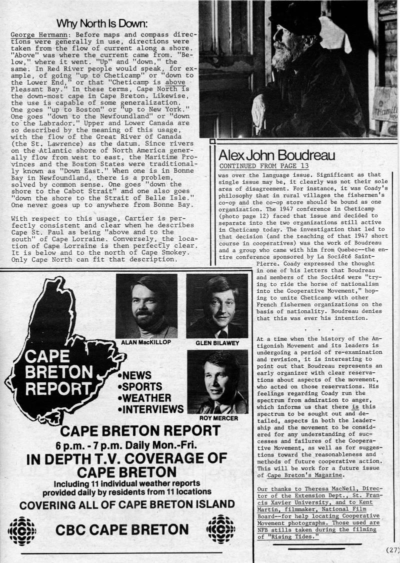 Published by Ronald Caplan on 1982/8/1 (375 reads)Why North Is Down: George Hermann: Before maps and compass direc? tions were generally in use, directions were taken from the flow of current along a shore. "Above" was where the current came from. "Be? low," where it went. "Up" and "down," the same. In Red River people would speak, for ex? ample, of going "up to Cheticamp" or "down to the Lower End," or that "Cheticamp is above Pleasant Bay." In these terms, Cape North is the down-most cape in Cape Breton. Likewise, the use is capable of some generalization. One goes "up to Boston" or "up to New York." One goes "down to the Newfoundland" or "down to the Labrador." Upper and Lower Canada are so described by the meaning of this usage, with the flow of the Great River of Canada (the St. Lawrence) as the datum. Since rivers on the -Atlantic shore of North America gener? ally flow from west to east, the Maritime Pro? vinces and the Boston States were traditional? ly known as "Down East." When one is in Bonne Bay in Newfoundland, there is a problem, solved by common sense. One goes "down the shore to the Cabot Strait" and one also goes "down the shore to the Strait of Belle Isle." One never goes up to an5rwhere from Bonne Bay. With respect to this usage, Cartier is per? fectly consistent and clear when he describes Cape St. Paul as being "above and to the south" of Cape Lorraine. Conversely, the loca? tion of Cape Lorraine is then perfectly clear. It is below and to the north of Cape Smokey. Only Cape North can fit that description. >NEWS • SPORTS • WEATHER • INTERVIEWS I ROY MERCER CAPE BRETON REPORT 6 p.m. - 7 p.m. Daily Mon.-Fri. IN DEPTH T.V. COVERAGE OF CAPE BRETON Including 11 individual weather reports provided daily by residents from 11 locations COVERING ALL OF CAPE BRETON ISLAND Alex John Boudreau CONTINUED FROM PAGE 13 was over the language issue. Significant as that single issue may be, it clearly was not their sole area of disagreement. For instance, it was Coady's philosophy that in rural villages the fishermen's co-op and the co-op store should be bound as one organization. The 1947 conference in Cheticamp (photo page 12) faced that issue and decided to separate into the two organizations still active in Cheticamp today. The investigation that led to that decision (and the teaching of that 1947 short course in cooperatives) was the work of Boudreau and a group who came with him from Quebec • the en? tire conference sponsored by La Society Saint- • Pierre. Coady expressed the thought in one of his letters that Boudreau and members of the Society were "try? ing to ride the horse of nationalism into the Cooperative Movement," hop? ing to unite Cheticamp with other French fishermen organizations on the basis of nationality. Boudreau denies that this was ever "his intention. At a time when the history of the An? tigonish Movement and its leaders is undergoing a period of re-examination and revision, it is interesting to point out that Boudreau represents an early organizer with clear reserva? tions about aspects of the movement, who acted on those reservations. His feelings regarding Coady run the spectrum from admiration to anger, which informs us that there Is' this spectrum to be sought out and de? tailed, aspects in both the leader? ship and the movement to be consid? ered for any understanding of suc? cesses and failures of the Coopera? tive Movement, as well as for sugges? tions toward the reasonableness and methods of future cooperative action. This will be work for a future issue of Cape Breton's Magazine. Our thanks to Theresa MacNeil, Direc- CBC CAPE BRETON tor of the Extension Dept., St. Fran? cis Xavier University, and to Kent Martin, filmmaker. National Film Board • for help locating Cooperative Movement photographs. Those used are NFB stills taken during the filming of "Rising Tides." (27: