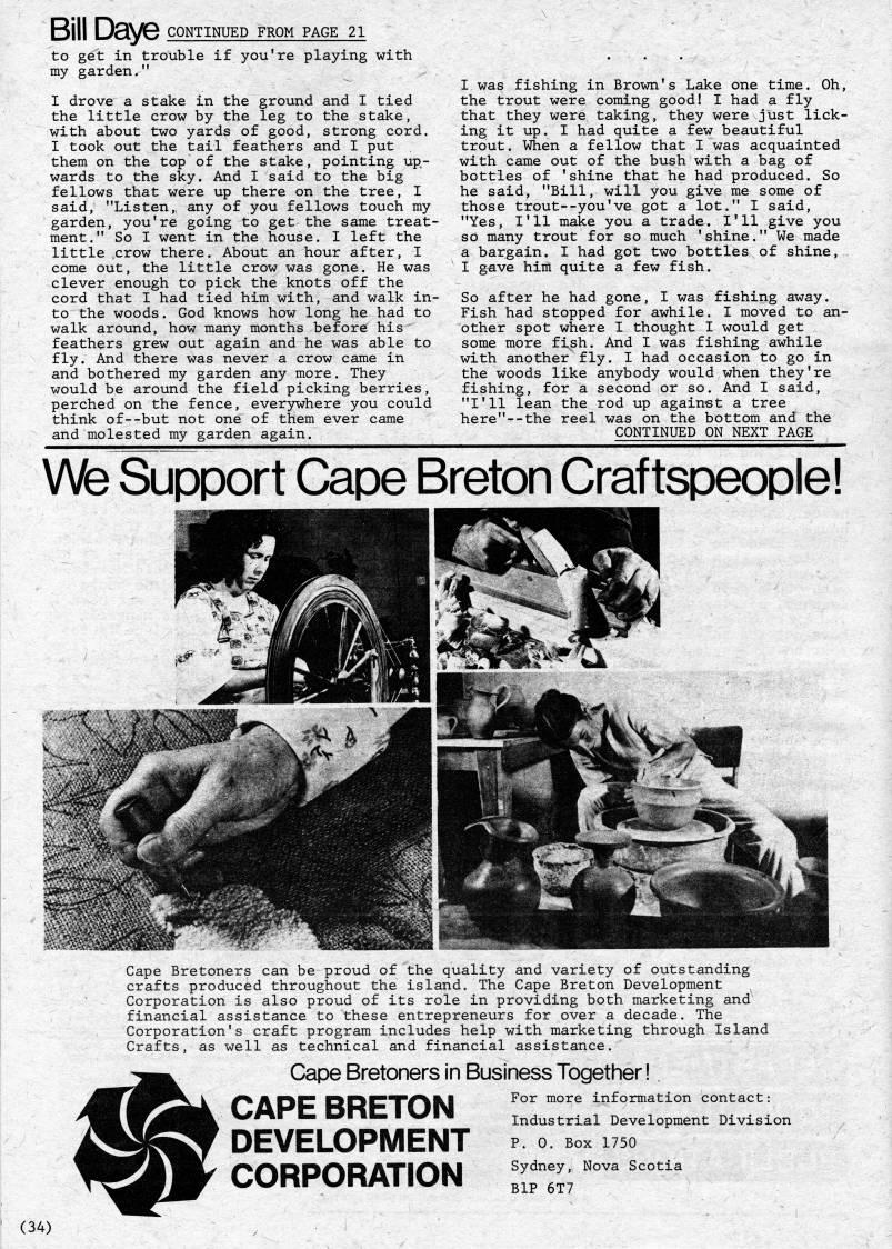 Published by Ronald Caplan on 1982/8/1 (276 reads)Bill Daye CONTINUED FROM PAGE 21 to get in trouble if you're playing with my garden." I drove a stake in the ground and I tied the little crow by the leg to the stake, with about two yards of good, strong cord. I took out the tail feathers and I put them on the top of the stake, pointing up? wards to the sky. And I said to the big fellows that were up there on the tree, I said, "Listen, any of you fellows touch my garden, you're going to get the same treat? ment." So I went in the house. I left the little crow there. About an hour after, I come out, the little crow was gone. He was clever enough to pick the knots off the cord that I had tied him with, and walk in? to the woods. God knows how long he had to walk around, how many months before his feathers grew out again and he was able to fly. And there was never a crow came in and bothered my garden any more. They would be around the field picking berries, perched on the fence, everywhere you could think of--but not one of them ever came and molested my garden again. I was fishing in Brown's Lake one time. Oh, the trout were coming good! I had a fly that they were taking, they were just lick? ing it up. I had quite a few beautiful trout. When a fellow that I was acquainted with came out of the bush with a bag of bottles of 'shine that he had produced. So he said, "Bill, will you give me some of those trout--you've got a lot." I said, "Yes, I'll make you a trade. I'll give you so many trout for so much 'shine." We made a bargain. I had got two bottles of shine, . I gave him quite a few fish. So after he had gone, I was fishing away. Fish had stopped for awhile. I moved to an? other spot where I thought I would get some more fish. And I was fishing awhile with another fly. I had occasion to go in the woods like anybody would when they're fishing, for a second or so. And I said, "I'll lean the rod up against a tree here"--the reel was on the bottom and the CONTINUED ON NEXT PAGE We Support Cape Breton Craftspeople! Cape Bretoners can be proud of the quality and variety of outstanding crafts produced throughout the island. The Cape Breton Development Corporation is also proud of its role in providing both marketing and financial assistance to these entrepreneurs for over a decade. The Corporation's craft program includes help with marketing through Island Crafts, as well as technical and financial assistance. Gape Bretoners in Business Together! ' AnC DDCT''M ''' more information contact: ''' *- D"??C ?? wi' Industrial Development Division DEVELOPMENT p o box 1750 CORPORATION ZTZ', ""''' ?''' (34)