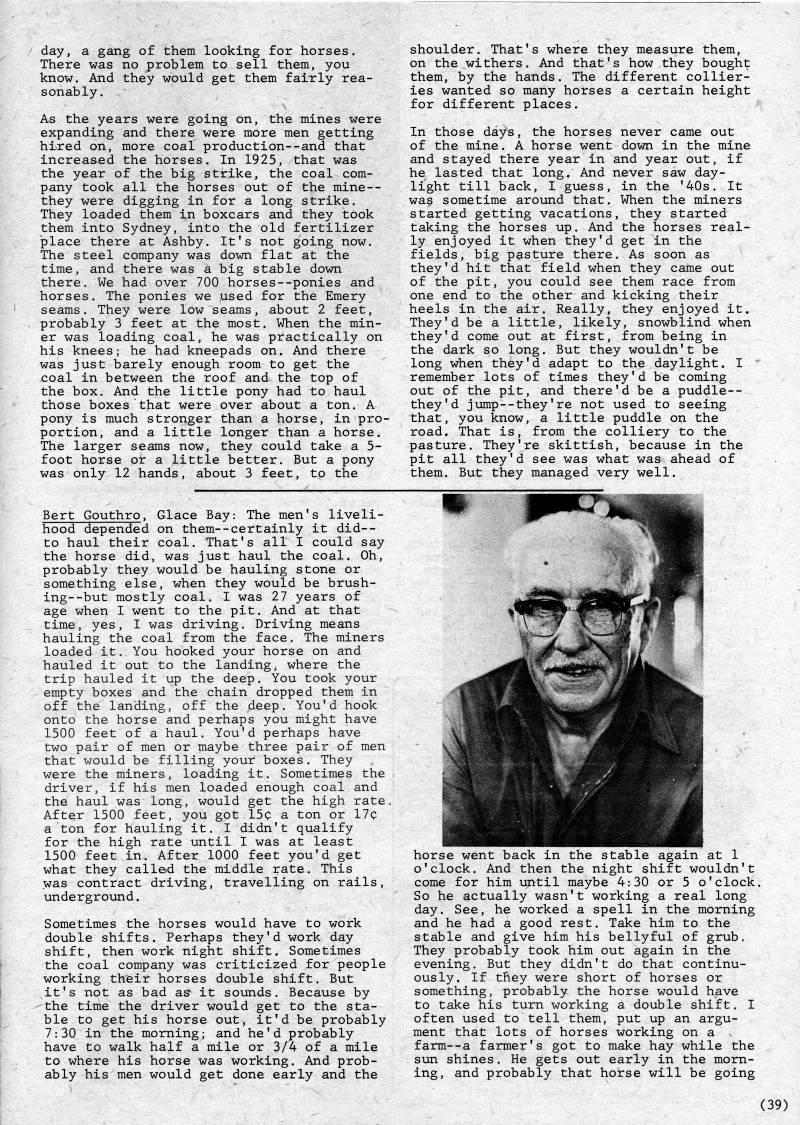 Published by Ronald Caplan on 1982/8/1 (788 reads)day, a gang of them looking for horses. There was no problem to sell them, you know. And they would get them fairly rea? sonably. As the years were going on, the mines were expanding and there were more men getting hired on, more coal production--and that increased the horses. In 1925, that was the year of the big strike, the coal com? pany took all the horses out of the mine-- they were digging in for a long strike. They loaded them in boxcars and they took them into Sydney, into the old fertilizer place there at Ashby. It's not going now. The steel company was down flat at the time, and there was a big stable down there. We had over 700 horses--ponies and horses. The ponies we used for the Emery seams. They were low seams, about 2 feet, probably 3 feet at the most. When the min? er was loading coal, he was practically on his knees; he had kneepads on. And there was just barely enough room to get the coal in between the roof and the top of the box. And the little pony had to haul those boxes that were over about a ton, A pony is much stronger than a horse, in pro? portion, and a little longer than a horse. The larger seams now, they could take a 5- foot horse or a little better. But a pony was only 12 hands, about 3 feet, to the shoulder. That's where they measure them, on the withers, And that's how they bought them, by the hands. The different collier? ies wanted so many horses a certain height for different places. In those days, the horses never came out of the mine, A horse went down in the mine and stayed there year in and year out, if he lasted that long. And never saw day? light till back, I guess, in the '40s, It was sometime around that. When the miners started getting vacations, they started taking the horses up. And the horses real? ly enjoyed it when they'd get in the fields, big pasture there. As soon as they'd hit that field when they came out of the pit, you could see them race from one end to the other and kicking their heels in the air. Really, they enjoyed it. They'd be a little, likely, snowblind when they'd come out at first, from being in the dark so long. But they wouldn't be long when they'd adapt to the daylight. I ' remember lots of times they'd be coming out of the pit, and there'd be a puddle-- they'd jump--they're not used to seeing that, you know, a little puddle on the road. That is, from the colliery to the pasture. They're skittish, because in the pit all they'd see was what was ahead of them. But they managed very well. Bert Gouthro, Glace Bay: The men's liveli? hood depended on them--certainly it did-- to haul their coal. That's all I could say the horse did, was just haul the coal. Oh, probably they would be hauling stone or something else, when they would be brush- ing--but mostly coal. I was 27 years of age when I went to the pit. And at that time, yes, I was driving. Driving means hauling the coal from the face. The miners loaded it. You hooked your horse on and hauled it out to the landings where the trip hauled it up the deep. You took your empty boxes and the chain dropped them in off the landing, off the deep. You'd hook onto the horse and perhaps you might have 1500 feet of a haul. You'd perhaps have two pair of men or maybe three pair of men that would be filling your boxes. They were the miners, loading it. Sometimes the < driver, if his men loaded enough coal and the haul was long, would get the high rate • After 1500 feet, you got 15c a ton or 17c a ton for hauling it. I didn't qualify for the high rate until I was at least 1500 feet in. After 1000 feet you'd get what they called the middle rate. This was contract driving, travelling on rails, underground. Sometimes the horses would have to work double shifts. Perhaps they'd work day shift, then work night shift. Sometimes the coal company was criticized for people working their horses double shift. But it's not as bad aS' it sounds. Because by the time the driver would get to the sta? ble to get his horse out, it'd be probably 7:30 in the morning; and he'd probably have to walk half a mile or 3/4 of a mile to where his horse was working. And prob? ably his men would get done early and the horse went back in the stable again at 1 o'clock. And then the night shift wouldn't come for him until maybe 4:30 or 5 o'clock. So he actually wasn't working a real long day. See, he worked a spell in the morning and he had a good rest. Take him to the stable and give him his bellyful of grub. They probably took him out again in the evening. But they didn't do that continu? ously. If they were short of horses or something, probably the horse would have to take his turn working a double shift. I often used to tell them, put up an argu? ment that lots of horses working on a fa2rm--a farmer's got to make hay while the sun shines. He gets out early in the morn? ing, and probably that horse will be going (39)