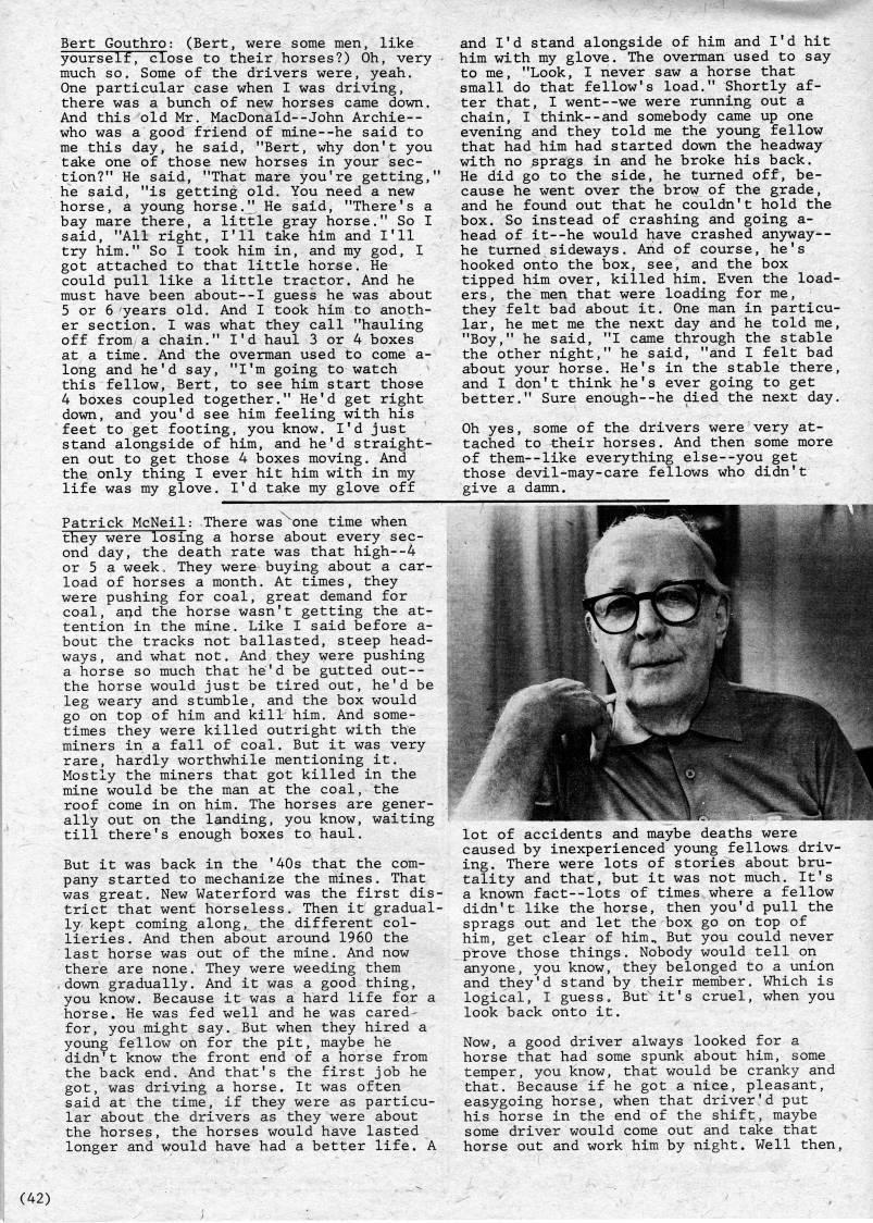 Published by Ronald Caplan on 1982/8/1 (308 reads)Bert Gouthro: (Bert, were some men, like yourself, close to their horses?) Oh, very much so. Some of the drivers were, yeah. One particular case when I was driving, there was a bunch of new horses came down. And this old Mr. MacDonald--John Archie-- who was a good friend of mine--he said to me this day, he said, "Bert, why don't you take one of those new horses in your sec? tion?" He said, "That mare you're getting," he said, "is getting old. You need a new horse, a young horse." He said, "There's a bay mare there, a little gray horse," So I said, "All right, I'll take him and I'll try him," So I took him in, and my god, I got attached to that little horse. He could pull like a little tractor. And he must have been about--I guess he was about 5 or 6 years old. And I took him to anoth? er section. I was what they call "hauling off from a chain," I'd haul 3 or 4 boxes at a time. And the overman used to come a- long and he'd say, "I'm going to watch this fellow, Bert, to see him start those 4 boxes coupled together." He'd get right down, and you'd see him feeling with his feet to get footing, you know, I'd just stand alongside of him, and he'd straight? en out to get those 4 boxes moving. And the only thing I ever hit him with in my life was my glove, I'd take my glove off and I'd stand alongside of him and I'd hit him with my glove. The overman used to say to me, "Look, I never saw a horse that small do that fellow's load." Shortly af? ter that, I went--we were running out a chain, I think--and somebody came up one evening and they told me the young fellow that had him had started down the headway with no sprags in and he broke his back. He did go to the side, he turned off, be? cause he went over the brow of the grade, and he found out that he couldn't hold the box. So instead of crashing and going a- head of it--he would have crashed anyway-- he turned sideways. And of course, he's hooked onto the box, see, and the box tipped him over, killed him. Even the load? ers , the men that were loading for me, they felt bad about it. One man in particu? lar, he met me the next day and he told me, "Boy," he said, "I came through the stable the other night," he said, "and I felt bad about your horse. He's in the stable there, and I don't think he's ever going to get better." Sure enough--he died the next day. Oh yes, some of the drivers were very at? tached to their horses. And then some more of them--like everything else--you get those devil-may-care fellows who didn't give a damn. Patrick McNeil: There was''one time when they were losing a horse about every sec? ond day, the death rate was that high--4 or 5 a weeko They were buying about a car? load of horses a month. At times, they were pushing for coal, great demand for coal, and the horse wasn't getting the at? tention in the mine. Like I said before a- bout the tracks not ballasted, steep head? ways , and what not. And they were pushing a horse so much that he'd be gutted out-- the horse would just be tired out, he'd be leg weary and stumble, and the box would go on top of him and kill him. And some? times they were killed outright with the miners in a fall of coal. But it was very rare, hardly worthwhile mentioning it. Mostly the miners that got killed in the mine would be the man at the coal, the roof come in on him. The horses are gener? ally out on the landing, you know, waiting till there's enough boxes to haul. But it was back in the '40s that the com? pany started to mechanize the mines. That was great. New Waterford was the first dis? trict that went horseless. Then it gradual? ly kept coming along, the different col? lieries. And then about around 1960 the last horse was out of the mine. And now there are none. They were weeding them down gradually. And it was a good thing, you know. Because it was a hard life for a horse. He was fed well and he was cared- for, you might say. But when they hired a young fellow on for the pit, maybe he didn't know the front end of a horse from the back end. And that's the first job he got, was driving a horse. It was often said at the time, if they were as particu? lar about the drivers as they were about the horses, the horses would have lasted longer and would have had a better life. A lot of accidents and maybe deaths were caused by inexperienced young fellows driv? ing. There were lots of stories about bru? tality and that, but it was not much. It's a known fact--lots of times where a fellow didn't like the horse, then you'd pull the sprags out and let the box go on top of him, get clear of him.. But you could never prove those things. Nobody would tell on anyone, you know, they belonged to a union and they'd stand by their member. Which is logical, I guess. But it's cruel, when you look back onto it. Now, a good driver always looked for a horse that had some spunk about him, some temper, you know, that would be cranky and that. Because if he got a nice, pleasant, easygoing horse, when that driver'd put his horse in the end of the shift, maybe some driver would come out and take that horse out and work him by night. Well then. (42)
