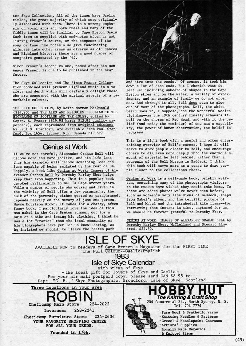 ter Skye Collection. All of the tunes have Gaelic titles, the great majority of which were original? ly associated with them. There is a strong empha? sis on vocal airs and both these and many of the fiddle tunes will be familiar to Cape Breton Gaels. Each item is supplied with end-notes often as not listing Fraser's source, or the composer of the song or tune. The notes also give fascinating glimpses into other areas as diverse as old dances and Highland history; there are a good number of song-airs generated by the '45. Simon Eraser's second volume, named after his son Angus Fraser, is due to be published in the near future. The Skye Collection and The Simon Fraser Collec? tion combined will present Highland music in a va? riety and depth which will certainly delight those who are concerned with the musical aspects of a re? markable culture. THE SKYE COLLECTION, by Keith Norman MacDonald ($14.95) and THE AIRS AND MELODIES PECULIAR TO THE HIGHLANDS OF SCOTLAND AND THE ISLES, edited by Captn. S. Fraser ($19.95 hard; $12.95 quality pa? perback) , each reproduced from original editions by Paul S. Cranford, are available from Paul Cran? ford, Box 1654, Sydney, N.S. Canada BlP 6T7 Genius at Work If we're not careful, Alexander Graham Bell will become more and more gddllke, and his life (and thus his example) will become something less and less capable of being emulated by the rest of us. Happily, a book like Genius at Work: Images of Al? exander Graham Bell by Dorothy Harley Eber helps keep that from happening. This is a popular book devoted particularly to Bell's Cape Breton years. While a number of people who worked and lived in the vicinity of Bell offer a few paragraphs, the bulk of the portrait, either quoted or paraphrased, depends heavily on the memory of just one person, Mayme Morrison Brown. It makes for a chatty, often funny book. I particularly love the idea of this man naked in the Cape Breton summer, out for a swim or a hike and losing his clothing. I think he was a lot "crazier" than the local community or his biographers have yet let us know • daring, as he Insisted we should, to "leave the beaten path and dive into the woods." Of course, it took him down a lot of dead ends. But I cherish what it left us: including unheard-of shapes in the Cape Breton skies and on the water, a variety of exper? iments, and an example of family we do not often see. And through it all. Bell does seem to glow out of most of the photographs. Well, the white beard does it, I suppose, and the wonderful woolen clothing • as the 19th century finally exhausts it? self on the shores of Red Head, and with it the be? lief (and today the reminder) of one man's capabil? ity, the power of human observation, the belief in progress. This is a light book with a useful and often enter? taining overview of Bell's career. I hope it will serve to draw people closer to Bell, and encourage others to dig even more deeply into the enormous a- mount of material he left behind. Rather than a souvenir of the Bell Museum in Baddeck, I think this book will serve more as a tease to draw peo? ple closer to the collections there. Genius at Work is a well-made book, briskly writ? ten, containing many of the photographs visitors to the museum have wished they could take home. To these are added photos we've never seen before, such as Notman's very fine views of Baddeck, snaps from Mabel's album, and the terrific picture of Bell and Mabel and the tetrahedral kite frame • for retrieving that instant in time, captured for us, we should be forever grateful to Dorothy Eber. GENIUS AT WORK: IMAGES OF ALEXANDER GRAHAM BELL by Dorothy Harley Eber. McClelland and Stewart Lim? ited. $22.50. ISLE OF SKYE AVAILABLE NOW to readers of Cape Breton's Magazine for the FIRST TIME The Full Colour--Gaelic/English 1983 Isle of Skye Calendar with views of Skye ~ the ideal gift for lovers of Skye and Gaelic ~ For your air mail postpaid copy, please send CAN $8.95 to:-- Dept. "C. B.," Skye Photographic, Broadford, Isle of Skye, Scotland Three Locations in your area ROBIN Cheticamp Main Store 224-2022 Inverness 258-2241 Cheticamp Furniture Store 224-2434 YOUR FAVORITE SHOPPING CENTRE FOR ALL YOUR NEEDS. Founded in I7<66. HOBBY HUT The Knitting St Craft Shop 204 Commercial St., North Sydney, N. S. Tel. l'i'-im • Pure Wool & Synthetic Yarns • Knitting Needles & Patterns • Crewel & Needlepoint Canvases • Artists' Supplies • Locally Made Ceramics & Knitted Items -__ (45)