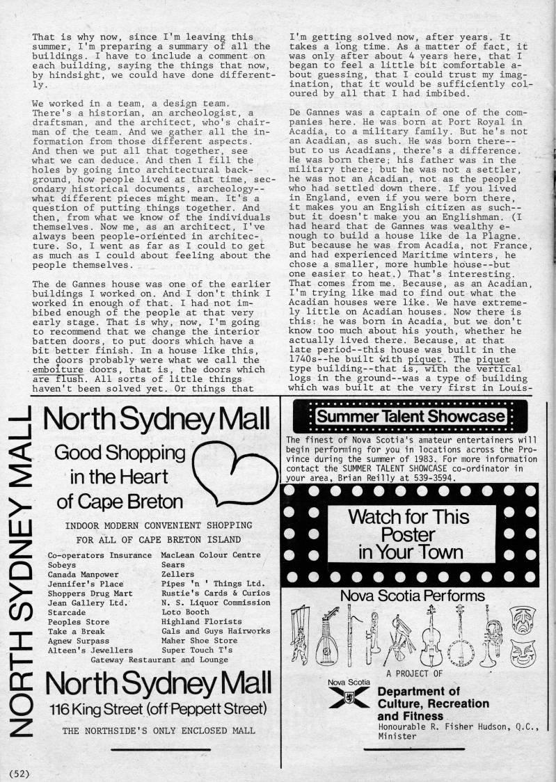 • Yvon LeBlanc, Architect, Fortress of Louisbourg • Bowden Murphy: 24 Years Splitting Fish • A Micmac Tale: “The Magical Dancing-Doll†• Bill Fraser, Superintendent R.C.M.P, Rtd. • World War One Continues: Nursing-Sisters, the Halifax Explosion, Siberia, & Coming Home • With Frank E. Jackson of North Sydney