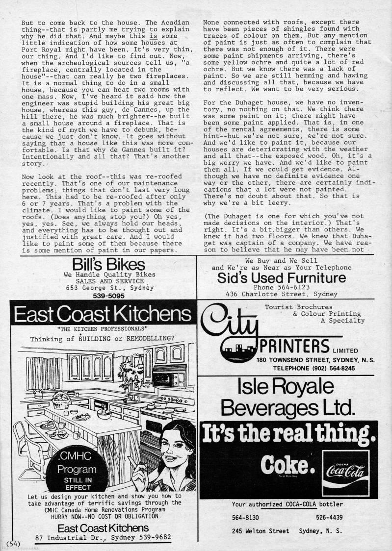 But to come back to the house. The Acadian thing--that is partly me trying to explain why he did that. And maybe this is. some little indication of how some houses at Port Royal might have been. It's very thin, our thing. And I'd like to find out. Now, when the archeological sources tell us, "a fireplace, centrally located in the house"--that can really be two fireplaces. It is a normal thing to do in a small house, because you can heat two rooms with one mass. Now, I've heard it said how the engineer was stupid building his great big house, whereas this guy, de Gannes, up the hill there, he was much brighter--he built a small house around a fireplace. That is the kind of myth we have to debunk, be? cause we just don't know. It goes without saying that a house like this was more com? fortable. Is that why de Gannes built it? Intentionally and all that? That's another story. Now look at the roof--this was re-roofed recently. That''s one of our maintenance problems; things that don't last very long here. This had to be re-roofed after only 6 or 7 years. That's a problem with the climate. I would like to paint some of the roofs. (Does anything stop you?) Oh yes, yes, yes. See, we always hold our heads, and everything has to be thought out and justified with great care. And I would like to paint some of them because there is some mention of paint in our papers. None connected with roofs, except there have been pieces of shingles found with traces of colour on them. But any mention of paint is just as often to complain that there was not enough of it. There were some paint shipments arriving, there's some yellow ochre and quite a lot of red ochre. But we know there was a lack of paint. So we are still hemming and hawing and discussing all that, because we have to reflect. We want to be very serious. For the Duhaget house, we have no inven? tory , no nothing on that. We think there was some paint on it; there might have been some paint applied. That is, in one of the rental agreements, there is some hint--but we're not sure, We're not sure. And we'd like to paint it, because our houses are deteriorating with the weather and all that--the exposed wood. Oh, it's a big worry we have. And we'd like to paint them all. If we could get evidence. Al? though we have no definite evidence one way or the other, there are certainly indi? cations that a lot were not painted. There's no doubt about that. So that is why we're a bit leery. (The Duhaget is one for which you've not made decisions on the interior.) That's right. It's a bit.bigger than others. We knew it had two floors. We knew that Duha? get was captain of a company. We have rea? son to believe that he may have been not Bill's Bikes We Handle Quality Bikes SALES AND SERVICE 653 George St., Sydney 539-5095 We Buy and We Sell and We're as Near as Your Telephone Sid s Used Furniture Phone 564-6123 436 Charlotte Street, Sydney East Coast Kitchens "THE KITCHEN PROFESSIONALS" Thinking of BUILDING or REMODELLING? LIMITED 180 TOWNSEND STREET, SYDNEY. N. S. TELEPHONE (902) 564'245 Tourist Brochures & Colour Printing A Specialty PRINTERS IsleRoyale Beverages Ltd. (54) Let us design your kitchen and show you how to take advantage of terrific savings through the CMHC Canada Home Renovations Program HURRY NOW • NO COST OR OBLIGATION East Coast Kitchens 87 Industrial Dr., Sydney 539-9682 Your authorized COCA-COLA bottler 564-8130 526-4439 245 Welton Street Sydney, N. S.