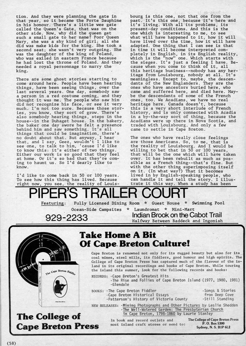 tion. And they were planning the gate in that year, so it became the Porte Dauphine in his honour. There's a little wee gate called the Queen's Gate, that was on the other side. Now, why did the queen get such a small gate to her name? Poor Queen Mary, she was a shy kind of girl; all she did was make kids for the king. She took a second seat; she wasn't very outgoing. She was the daughter of the king of Poland, who was exiled in eastern France because he had lost the throne of Poland. And they needed a royal personnage to marry the king. There are some ghost stories starting to come around here. People have been hearing things, have been seeing things, over the last several years. One day, somebody saw a person in a red costume coming, and they thought it was me. The people who saw him did not recognize his face, or see it very much. I'm not too sure. Because those stor? ies, you know, they sort of grow. There's also somebody hearing things, steps in the house--in the Duhaget house. In the bakery, the baker one day swore he felt a presence behind him and saw something. It's all things that could be imagination, there's no doubt about that. But anyway, I hear that, and I say, Geez, wouldn't I like to see one, to talk to him, 'cause I'd like to know this: it's either of two things. Either our work is so good that they feel at home. Or it's so bad that they're com? ing to haunt us. So I'd dearly like to know. I'd like to come back in 50 or 100 years. To see how this thing has lived. Because right now, you see, the reality of Louis- bourg is this one, not that one from the past. It's this one, because it's here and it's living. With all its problems, its present-day conditions. And this is the one which is interesting to me, to see what will have happened to it, how it will have lived over the time, how it will have adapted. One thing that I can see is that in time it will become interpreted com? pletely in English, in its English reality, which is the "now" one. Which starts with the sieges. It's just a feeling I have. Be? cause when you come to think of it, all this heritage business--nobody has any her? itage from Louisbourg, nobody at all. It's meaningless. Except to, maybe, the descen? dants of the New Englanders, They are the ones who have ancestors buried here, who came and suffered here, and died here. May? be the descendants of some of the French ones, too, We Acadians, we have no real heritage here. Canada doesn't, because this is a very short interlude of French history, and is only connected with Acadia in a by-the-way sort of thing, because the Acadians were up there in Nova Scotia, and traded with Louisbourg. And only a few came to settle in Cape Breton. The ones who have really close feelings are those Americans. So, to me, that is the reality of Louisbourg, And I would be willing to bet that in 50 or 100 years, that will be the one which will have taken over. It has been rebuilt as much as pos? sible as a French thing--that's fine. But with the other thing superimposing itself on it, (In what way?) That it becomes lived in by English-speaking people, who can handle it and tell the story, I illus- trate it this way. When a study has been PIPER'S TRAILER COURT Featuring: Fully Licensed Dining Room * Guest House * Swimming Pool Ocean-Side Campsites * Latmdromat * Mini-Mart 929-2233 Indian Brook on the Cabot Trail ?? JCJ C-C-JJ Halfway Between Baddeck and Ingonish Take Home A Bit Of CapeBretan Culture! The College of Cape Breton Press Cape Breton is renowned not only for its rugged beauty but also for its coal mines, steel mills, its fiddlers, good humour and high spirits. The College of Cape Breton Press has captured much of the flavour of the is? land in its original recordings and books of Cape Breton. While touring the island this summer, look for the following records and books: RECORDS: -Cape Breton's Greatest Hits • The Rise and Follies of Cape Breton Island (1977, 1980, 1981) • Glendale BOOKS: -The Cape Breton Fiddler • Songs & Stories • Cape Breton Historical Essays from Deep Cove • Patterson's History of Victoria County -Still Standing NEW RELEASES: -Mining Photographs and Other Pictures by Leslie Shedden • The Well-Watered Garden: The Presbyterian Church in Cape Breton, 1798-1860 by Laurie Stanley In book and record outlets and most island craft stores or send to: The College of Cape Breton Press P. 0. Box 5300 Sydney, N. S. BIP 6L2 (58)