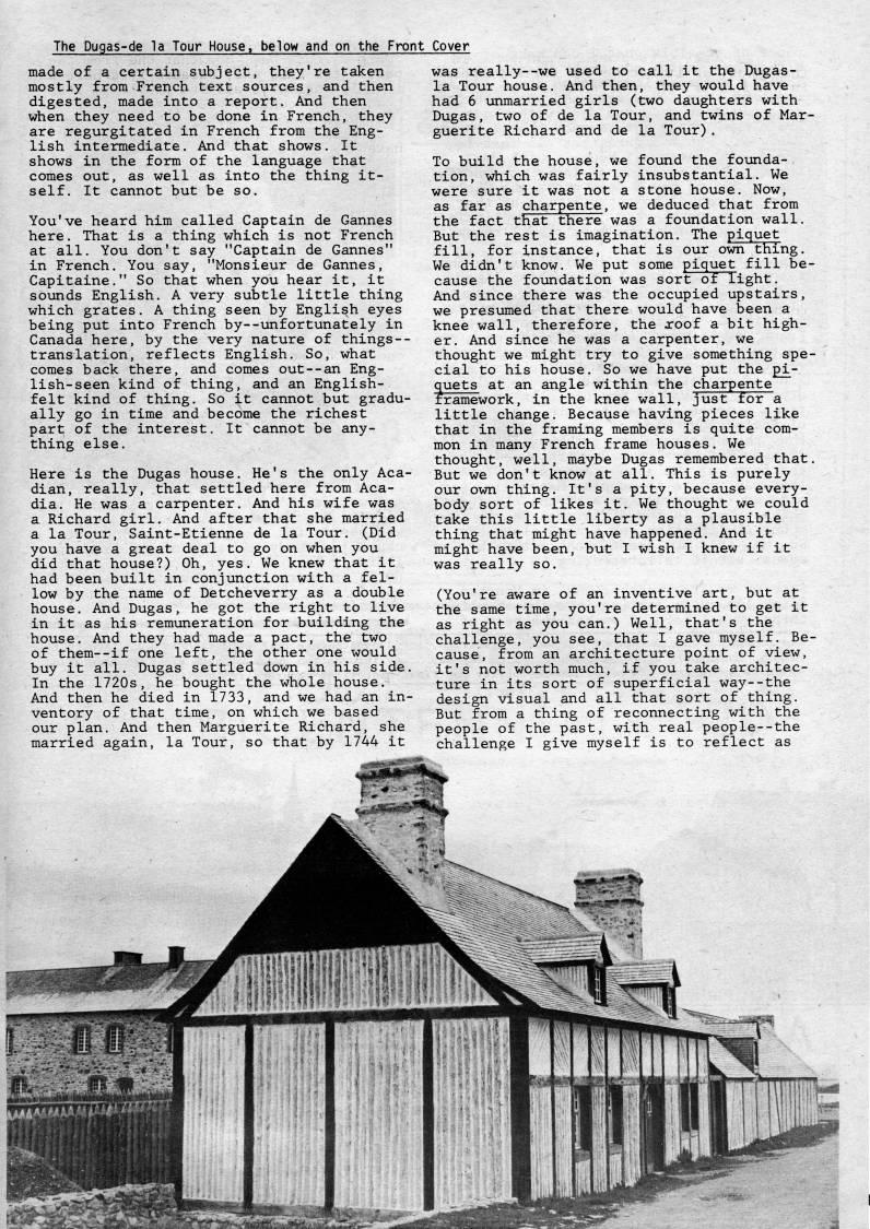 The Dugas-de la Tour House, below and on the Front Cover made of a certain subject, they're taken mostly from French text sources, and then digested, made into a report. And then when they need to be done in French, they are regurgitated in French from the Eng? lish intermediate. And that shows. It shows in the form of the language that comes out, as well as into the thing it? self. It cannot but be so. You've heard him called Captain de Gannes here. That is a thing which is not French at all. You don't say "Captain de Gannes" in French. You say, "Monsieur de Gannes, Capitaine." So that when you hear it, it sounds English. A very subtle little thing which grates. A thing seen by English eyes being put into French by--unfortunately in Canada here, by the very nature of things-- translation, reflects English. So, what comes back there, and comes out--an Eng? lish-seen kind of thing, and an English- felt kind of thing. So it cannot but gradu? ally go in time and become the richest part of the interest. It cannot be any? thing else. Here is the Dugas house. He's the only Aca? dian, really, that settled here from Aca? dia. He was a carpenter. And his wife was a Richard girl. And after that she married a la Tour, Saint-Etienne de la Tour, (Did you have a great deal to go on when you did that house?) Oh, yes. We knew that it had been built in conjunction with a fel? low by the name of Detcheverry as a double house. And Dugas, he got the right to live in it as his remuneration for building the house. And they had made a pact, the two of them--if one left, the other one would buy it all, Dugas settled down in his side. In the 1720s, he bought the whole house. And then he died in 1733, and we had an in? ventory of that time, on which we based our plan. And then Marguerite Richard, she married again, la Tour, so that by 1744 it was really--we used to call it the Dugas- la Tour house. And then, they would have had 6 unmarried girls (two daughters with Dugas, two of de la Tour, and twins of Mar? guerite Richard and de la Tour). To build the house, we found the fomda- tion, which was fairly insubstantial. We were sure it was not a stone house. Now, as far as charpente, we deduced that from the fact that there was a foundation wall. But the rest is imagination. The piquet fill, for instance, that is our own thing. We didn't know. We put some piquet fill be? cause the fovmdation was sort of light, And since there was the occupied upstairs, we presumed that there would have been a knee wall, therefore, the jroof a bit high? er. And since he was a carpenter, we thought we might try to give something spe? cial to his house. So we have put the pi- fuets at an angle within the charpente ramework, in the knee wall, just for a little change. Because having pieces like that in the framing members is quite com? mon in many French frame houses. We thought, well, maybe Dugas remembered that. But we don't know at all. This is purely our own thing. It's a pity, because every? body sort of likes it. We thought we could take this little liberty as a plausible thing that might have happened. And it might have been, but I wish I knew if it was really so. (You're aware of an inventive art, but at the same time, you're determined to get it as right as you can.) Well, that's the challenge, you see, that I gave myself. Be? cause, from an architecture point of view, it's not worth much, if you take architec? ture in its sort of superficial way--the design visual and all that sort of thing. But from a thing of reconnecting with the people of the past, with real people--the challenge I give myself is to reflect as