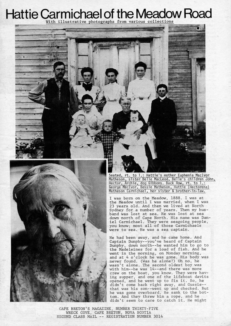Hattie Carmichael of the Meadow Road With illustrative photographs from various collections Hector, Archie, dog Gibbons. Back Row, rt. to 1.: George Maclvor, Bessie Matheson, Hattie (Hectorena) Matheson Carmichael, her sister & brother-in-law. I was born on the Meadow, 1888. I was at the Meadow until I was married, when I was 23 years old. And then we lived at North Sydney for a number of years. Then my hus? band was lost at sea. He was lost at sea down north of Cape North. His name was Dan? iel Carmichael. They were seagoing people, you know; most all of those Carmichaels were to sea. He was a sea captain. He had been away, and he came home. And Captain Dunphy--you've heard of Captain Dunphy, down north--he wanted him to go to the Madeleines for a load of fish. And he went in the morning, on Monday morning, and at 4 o'clock he was gone. His body was never found. (Was he alone?) Oh no, he wasn't alone. The second oldest boy was with him--he was 14--and there was more crew on the boat, you know. They were hav? ing supper, and one of the lifeboat davits opened, and he went up to fix it. So, he didn't come back right away, and Gussie-- that was his son--went up and checked. But he was gone overboard. He sank to the bot? tom. And they threw him a rope, and he didn't seem to care to catch it. He might CAPE BRETON'S MAGAZINE, NUMBER THIRTY-FIVE WRECK COVE, CAPE BRETON, NOVA SCOTIA SECOND CLASS MAIL -- REGISTRATION NUMBER 3014