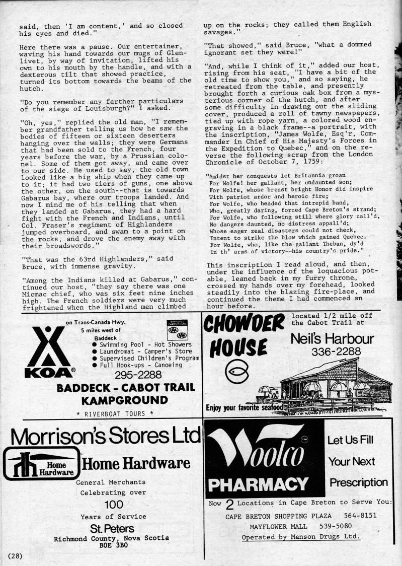 Published by Ronald Caplan on 1984/6/1 (285 reads)said, then 'I am content, his eyes and died." and so closed Here there was a pause. Our entertainer, waving his hand towards our mugs of Glen? livet, by way of invitation, lifted his own to his mouth by the handle, and with a dexterous tilt that showed practice, turned its bottom towards the beams of the hutch. "Do you remember any farther particulairs of the siege of Louisburgh?" I asked. "Oh, yes," replied the old man, "I remem? ber grandfather telling us how he saw the bodies of fifteen or sixteen deserters hanging over the walls; they were Germans that had been sold to the French, four years before the war, by a Prussian colo? nel. Some of them got away, and came over to our side. He used to say, the old town looked like a big ship when they came up to it; it had two tiers of guns, one above the other, on the south--that is towards Gabarus bay, where our troops landed. And now I mind me of his telling that when they landed at Gabarus, they had a hard fight with the French and Indians, until Col. Fraser's regiment of Highlanders jumped overboard, and swam to a point on the rocks, and drove the enemy away with their broadswords." "That was the 63rd Highlanders," said Bruce, with immense gravity. "Among the Indians killed at Gabarus," con? tinued our host, "they say there was one Micmac chief, who was six feet nine inches high. The French soldiers were very much frightened when the Highland men climbed up on the rocks; they called them English savages." "That showed," said Bruce, "what a dommed ignorant set they were!" "And, while I think of it," added our host, rising from his seat, "I have a bit of the old time to show you," and so saying, he retreated from the table, and presently brought forth a curious oak box from a mys? terious comer of the hutch, and after some difficulty in drawing out the sliding cover, produced a roll of tawny newspapers, tied up with rope yarn, a colored wood en? graving in a black frame--a portrait, with the inscription, "James Wolfe, Esq'r, Com? mander in Chief of His Majesty's Forces in the Expedition to Quebec," and on the re? verse the following scrap from the London Chronicle of October 7, 1759: "Amidst her conquests let Britannia groan For Wolfe! her gallant, her undaunted son; For Wolfe, whose breast bright Honor did Inspire With patriot ardor and heroic fire; For Wolfe, who headed that intrepid band, Who, greatly daring, forced Cape Breton's strand; For Wolfe, who following still where glory call'd. No dangers daunted, no distress appall'd; Whose eager zeal disasters could not check. Intent to strike the blow which gained Quebec. For Wolfe, who, like the gallant Theban, dy'd In th' arms of victory • his country's pride." This inscription I read aloud, and then, under the influence of the loquacious pot? able, leaned back in my furry throne., crossed my hands over my forehead, looked steadily into the blazing fire-place, and continued the theme I had commenced an hour before. A on Trans-Canada Hwy. 5 mites west of Baddeck • Swimming Pool - Hot Showers • Laundromat - Camper's Store • Supervised Children's Program • Full Hook-ups - Canoeing 295-2288 BADDECK - CABOT TRAIL KAMPGROUND * RIVERBOAT TOURS * emfOEH located 1/2 mile off the Cabot Trail at Neil's Harbour 336-2288 Eni(qi your favorite Morrison's Stores Ltd iHome Hardware If General Merchants Celebrating over 100 Years of Service St Peters Richmond County, Nova Scotia BOE 3B0 Let Us Fill Your Next Prescription (28) Now O Locations in Cape Breton co Serve You CAPE BRETON SHOPPING PLAZA 564-8151 MAYFLOWER MALL 539-5080 Operated by Manson Drugs Ltd.