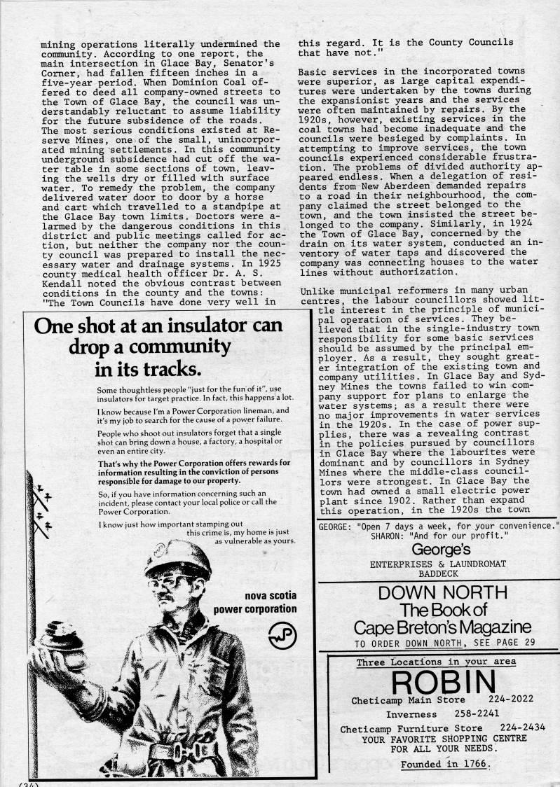 Published by Ronald Caplan on 1984/8/1 (297 reads)mining operations literally undermined the community. According to one report, the main intersection in Glace Bay, Senator's Comer, had fallen fifteen inches in a five-year period. When Dominion Coal of? fered to deed all company-owned streets to the Town of Glace Bay, the council was un? derstandably reluctant to assume liability for the future subsidence of the roads. The most serious conditions existed at Re? serve Mines, one of the small, unincorpor? ated mining settlements. In this community underground subsidence had cut off the wa? ter table in some sections of town, leav? ing the wells dry or filled with surface water. To remedy the problem, the company delivered water door to door by a horse and cart which travelled to a standpipe at the Glace Bay town limits. Doctors were a- larmed by the dangerous conditions in this district and public meetings called for ac? tion, but neither the company nor the coun? ty council was prepared to install the nec? essary water and drainage systems. In 1925 county medical health officer Dr. A. S. Kendall noted the obvious contrast between conditions in the county and the towns: "The Town Councils have done very well in One shot at an insulator can drop a community in its tracks. Some thoughtless people "just for the fun of it", use insulators for target practice. In fact, this happens a lot. I know because I'm a Power Corporation lineman, and it's my job to search for the cause of a power failure. People who shoot out insulators forget that a single shot can bring down a house, a factory, a hospital or even an entire city. That's why the Power Corporation offers rewards for information resulting in the conviction of persons responsible for damage to our property. So, if you have information concerning such an incident, please contact your local police or call the Power Corporation. I know just how important stamping out this crime is, my home is just as vulnerable as yours. nova scotia power corporation this regard. It is the County Councils that have not." Basic services in the incorporated towns were superior, as large capital expendi? tures were undertaken by the towns during the expansionist years and the services were often maintained by repairs. By the 1920s, however, existing services in the coal towns had become inadequate and the councils were besieged by complaints. In attempting to improve services, the town councils experienced considerable frustra? tion. The problems of divided authority ap? peared endless. When a delegation of resi? dents from New Aberdeen demanded repairs to a road in their neighbourhood, the com? pany claimed the street belonged to the town, and the town insisted the street be? longed to the company. Similarly, in 1924 the Town of Glace Bay, concerned by the drain on its water system, conducted an in? ventory of water taps and discovered the company was connecting houses to the water lines without authorization. Unlike municipal reformers in many urban centres, the labour councillors showed lit? tle interest in the principle of munici? pal operation of services. They be? lieved that in the single-industry town responsibility for some basic services should be assumed by the principal em? ployer. As a result, they sought great? er integration of the existing town and company utilities. In Glace Bay and Syd? ney Mines the towns failed to win com? pany support for plans to enlarge the water systems; as a result there were no major improvements in water services in the 1920s. In the case of power sup? plies, there was a revealing contrast in the policies pursued by councillors in Glace Bay where the labourites were dominant and by councillors in Sydney Mines where the middle-class council? lors were strongest. In Glace Bay the town had owned a small electric power plant since 1902. Rather than expand this operation, in the 1920s the town GEORGE: "Open 7 days a week, for your convenience. SHARON: "And for our profit." George's ENTERPRISES & LAUNDROMAT BADDECK DOWN NORTH The Book of Cape Breton's Magazine TO ORDER DOWN NORTH, SEE PAGE 29 Three Locations in your area ROBIN Cheticamp Main Store 224-2022 Inverness 258-2241 Cheticamp Furniture Store 224-2434 YOUR FAVORITE SHOPPING CENTRE FOR ALL YOUR NEEDS. Founded in 1766.