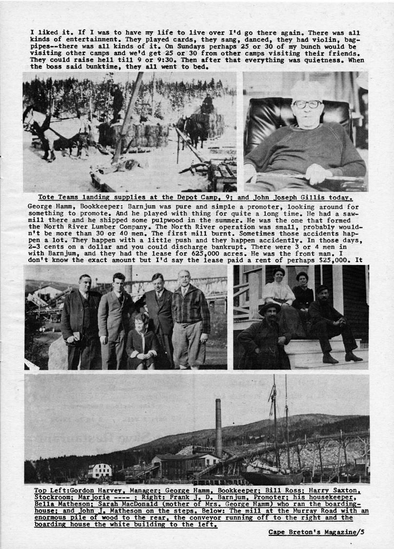 Published by Ronald Caplan on 1974/3/1 (881 reads)I liked it. If I was to have my life to live over I'd go there again. There was all kinds of entertainment. They played cards, they sang, danced, they had violin, bag? pipes • there was all kinds of it. On Sundays perhaps 25 or 30 of my bimch would be visiting other camps and we'd get 25 or 30 from other camps visiting their friends. They could raise hell till 9 or 9:30. Then after that everything was quietness. When the boss said bunktime, they all went to bed. Tote Teams landing supplies at the Depot Camp and John Joseph Gillis today. George Hamm, Bookkeeper: Barnjum was pure and simple a promoter, looking around for something to promote. And he played with thing for quite a long time. He had a saw? mill there and he shipped some pulpwood in the summer. He was the one that formed the North River Lumber Company. The North River operation was small, probably would? n't be more than 30 or 40 men. The first mill burnt. Sometimes those accidents hap? pen a lot. They happen with a little push and they happen accidently. In those days, 2-3 cents on a dollar and you could discharge bankrupt. There were 3 or 4 men in with Barnjum, and they had the lease for 625,000 acres. He was the front man. I don't know the exact amount but I'd say the lease paid a rent of perhaps S25,000. It Top LeftrGordon Harvey, Manager: George Hamm, Bookkeeper: Bill Ross; Harry Saxton. Stockroom; Marjorie • -- ; Right; Frank J. D, Barnjum. Promoter; his housekeeper, Bella Matheson; Sarah MacDonald (mother of Mrs, George Hamm) who ran the boarding- house; and John J, Matheson on the steps. Below: The mill at the Murray Road with an enormous pile of wood to the rear, the conveyor running off to the right and the boarding house the white building to the left. Cape Breton's Magazine/S