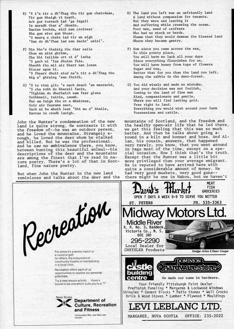 'S i'n tir a dh'fhag thu tir gun chairdeas, Tir gun bhaigh ri tuath. Ach gur tursach iad 'ga fagail Is anradh thar a' chuain. Daoine bochda, siol nan croitear Bha gun stoc gun bhuar. 'S mearg a chain iad tir an aigh 'San do dh'fhas iad nan daoin' uaisl'. E) The land you left was an unfriendly land A land without compassion for tenants. But they were sad leaving it And suffering while crossing the ocean. Poor men, seed of crofters Who had no stock or herds. Shame that they would demean the blessed land Where they became gentry. F) Nis bho'n thainig thu thar saile Chun an aite ghrinn, Cha bhi failinn ort ri d' latha 'S gach ni 'fas dhuinn fhin. Gheobh thu mil air bharr nan lusan Siucar agus ti. 'S fhearr dhuit siud na'n tir a dh'fhag thu Aig a' ghraisg 'san fhrith. G) 'S tu rinn glic 's nach deach 'am mearachd, 'S cha robh do bharail faoin, 'Tighinn do dhuthaieh nam fear glana Coibhneil, tairis, caomh. Far am faigh thu or a mhaireas. Coir air fearann saor, Gach ni bu mhath leat 'bhi mu d' bhaile, Earras is erodh laoigh. F) Now since you came across the sea. To this pretty place. You will have no lack all your days Since everything flourishes for us. You will have honey from tops of flowers Sugar and tea. Better that for you than the land you left. Among the rabble in the deer-forest. G) You did wisely and made no mistake. And your decision was not foolish. Coming to the land of fine men Kind, compassionate and gentle. Where you will find lasting gold. Free right to land. Everything you would wish around your farm Possessions and cattle. John the Hunter's condemnation of the new land is quite strong. He contrasts it with the freedom of--he was an outdoor person, and he loved the mountains. Strangely e- nough, he loved the deer whom he stalked and killed. But he was the professional. And he saw no ambivalence there, you know, between hunting this beautiful animal--his descriptions of the deer and the mountains are among the finest that I've read in na? ture poetry. There's a lot of that in Scot? land, fine nature poetry. But when John the Hunter in the new land reminisces and talks about the deer and the mountains of Scotland, and the freedom and the healthy open-air life that he led there, we get this feeling that this was so much better. And then he talks about going a- round in a kilt and bonnet and hose. And Al? lan, his cousin, answers, that happened very rarely; you know, that you went around in rags most of the time, except on a spe? cial occasion. Now I think that's the truth. Except that the Hunter was a little bit more privileged than your average emigrant. He is reputed to have arrived here with quite a considerable amount of money. He had very good muskets, very good guns-- there might be one in Mabou, but we haven't For some it's a tennis nnatch or a round of golf; for others, the enjoyment of : community theatre or membership in a local choir. Recreation offers each of us opportunities to explore our personal potentials. Try a new leisure activity ... there's bound to be one which suits you to a "T". v'f' Department of '' Culture, Recreation and Fitness J)a4's IflarW MEAT FISH GROCERIES OPEN 7 DAYS A WEEK 9-9 TO SERVE YOU BETTER ST. PETERS ?H. 535-3363 Midway Motors Ltd. Middle River R. R. No. 3, Baddeck Victoria Co., N. S. BOE IBO 295-2290 Local Dealer for CHRYSLER Products Dodge Aries 2-Door Coupe We made our name in hardware. dSstle building centre Your Friendly Pittsburgh Paint Dealer Prefinish Paneling * Margaree & Lockwood Windows Shingles * Cement Blocks * Patio Stones * Well Crocks Brick & Wood Stoves * Lumber * Plywood * Mouldings LEVI LEBLANC LTD. MARGAREE, NOVA SCOTIA OFFICE: 235-2022