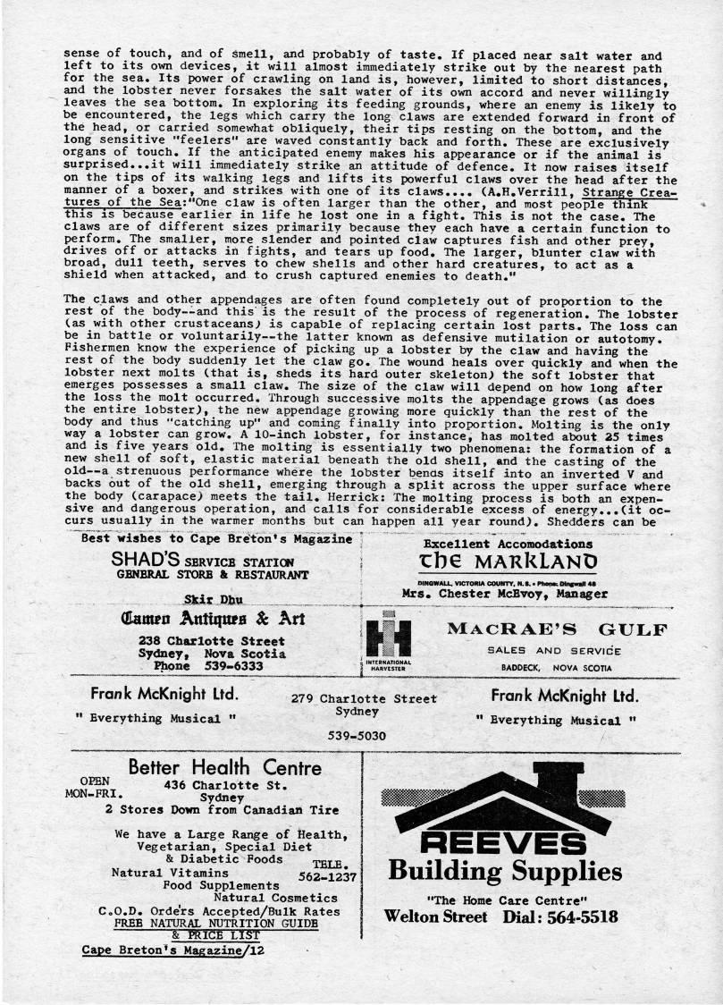 Published by Ronald Caplan on 1974/3/1 (592 reads)sense of touch, and of smell, and probably of taste. If placed near salt water and left to its own devices, it will almost immediately strike out by the nearest path for the sea. Its power of crawling on land is, however, limited to short distances, and the lobster never forsakes the salt water of its own accord and never willingly leaves the sea bottom. In exploring its feeding grounds, where an enemy is likely to be encountered, the legs which carry the long claws are extended forward in front of the head, or carried somewhat obliquely, their tips resting on the bottom, and the long sensitive "feelers" are waved constantly back and forth. These are exclusively organs of touch. If the anticipated enemy makes his appearance or if the animal is surprised,..it will immediately strike an attitude of defence. It now raises itself on the tips of its walking legs and lifts its powerful claws over the head after the manner of a boxer, and strikes with one of its claws.,,. (A.H.Verrill, Strange Crea? tures of the Sea;"One claw is often larger than the other, and most people think this is because earlier in life he lost one in a fight. This is not the case. The claws are of different sizes primarily because they each have a certain function to perform. The smaller, more slender and pointed claw captures fish and other prey, drives off or attacks in fights, and tears up food. The larger, blunter claw with broad, dull teeth, serves to chew shells and other hard creatures, to act as a shield when attacked, and to crush captured enemies to death." The claws and other appendages are often found completely out of proportion to the rest of the body • and this is the result of the process of regeneration. The lobster (as with other crustaceans; is capable of replacing certain lost parts. The loss can be in battle or voluntarily • the latter known as defensive mutilation or autotomy. Fishermen know the experience of picking up a lobster by the claw and having the rest of the body suddenly let the claw go. The wound heals over quickly and when the lobster next molts (that is, sheds its hard outer skeleton) the soft lobster that emerges possesses a small claw. The size of the claw will depend on how long after the loss the molt occurred. Through successive molts the appendage grows (as does the entire lobster), the new appendage growing more quickly than the rest of the body and thus "catching up" and coming finally into proportion. Molting is the only way a lobster can grow. A 10-inch lobster, for instance, has molted about 25 times and is five years old. The molting is essentially two phenomena: the formation of a new shell of soft, elastic material beneath the old shell, and the casting of the old • a strenuous performance where the lobster bends itself into an inverted V and backs out of the old shell, emerging through a split across the upper surface where the body (carapace) meets the tail. Herrick: The molting process is both an expen? sive and dangerous operation, and calls for considerable excess of energy...(it oc? curs usually in the warmer months but can happen all year round). Shedders can be Best wishes to Cape Breton's Magazine SHAD'S SERVICE STATIOK GENERAL STORE & RESTAURANT Sidr DblL ' • ,._ (ttamrn Anttiii??a & Art 238 Charlotte Street Sydney, Nova Scotia 'pne 539-6333 Excellent Accomodations rbe marKLanO DINGWALL. VICTORIA COUHTY, N.S. • I Mrs. Chester McSvoyt Manager ii MACRAE'S aXJLF SALES AND SERVICE BADDECK, NOVA SCOTIA Frank McKnight Ltd. Everything Musical " 279 Charlotte Street Sydney 539-5030 Frank McKnight Ltd. Everything Musical " Better Health Centre OPEN 436 Charlotte St. MON-FRI, Sydney 2 Stores Down from Canadian Tire We have a Large Range of Health, Vegetarian, Special Diet & Diabetic Foods TELE Natural Vitamins 562-1237 Food Supplements Natural Cosmetics CoO,D. Orders Accepted/Bulk Rates FREE NATURAL NUTRITION GUIDE & PRICE LIST Cape Breton's Magazine/12 Building Supplies "The Home Care Centre" Welton Street Dial: 564-5518