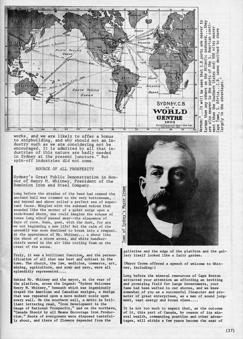 Published by Ronald Caplan on 1985/6/1 (290 reads)works, and we are likely to offer a bonus to shipbuilding, and why should not an in? dustry such as we are considering not be encouraged. It is admitted by all that in? dustries of this nature are badly needed in Sydney at the present juncture." But spin-off industries did not come. SOURCE OF ALL PROSPERITY Sydney's Great Public Demonstration in Hon? our of Henry M. Whitney, President of the Dominion Iron and Steel Company. Long before the strains of the band had ceased the ancient hall was crammed to the very buttresses, and beyond and above rolled a perfect sea of expec? tant faces. Mingled with the subdued voices that sounded like the murmur of a quiet surge upon a rock-bound shore, one could imagine the echoes of tones long since"passed away • the eloquence of days of yore. Gone, gone, with the dust, for are we not beginning a new life? But the calm of the assembly was soon destined to break into a tempest. At the appearance of Mr. Whitney... a shout like the shout of a storm arose, and white handker? chiefs waved in the air like curling foam on the crest of the waves. Truly, it was a brilliant function, and the person? ification of all that was best and noblest in the town. The church, the law, medicine, commerce, art, mining, agriculture, and army and navy, were all splendidly represented.... Behind Mr. Whitney and the mayor, at the rear of the platform, arose the legend: "Sydney Welcomes Henry M. Whitney," beneath which was ingeniously draped the American and Canadian ensigns, a design that was repeated upon a more modest scale upon every wall. On the southern wall, a motto in bril? liant lettering read, "Iron Development is the Gauge of National Prosperity," and on the northern, "Canada Should by all Means Encourage Iron Produc? tion. ".Knots of evergreens were disposed tasteful? ly about, and tiers of flowers depended from the galleries and the edge of the platform and the gal? lery itself looked like a fairy garden. (Mayor Crowe offered a speech of welcome to Whit? ney, including:) Long before the mineral resources of Cape Breton attracted your attention as affording an inviting and promising field for large investments, your fame had been wafted to our shores, and we knew somewhat of you as a successful financier and pro? moter of great enterprises, as a man of sound judg? ment, vast energy and broad views.... It is not too much to expect that, as the outcome of it, this part of Canada, by reason of its min? eral wealth, commanding position and other advan? tages, will within a few years become the seat of (37)