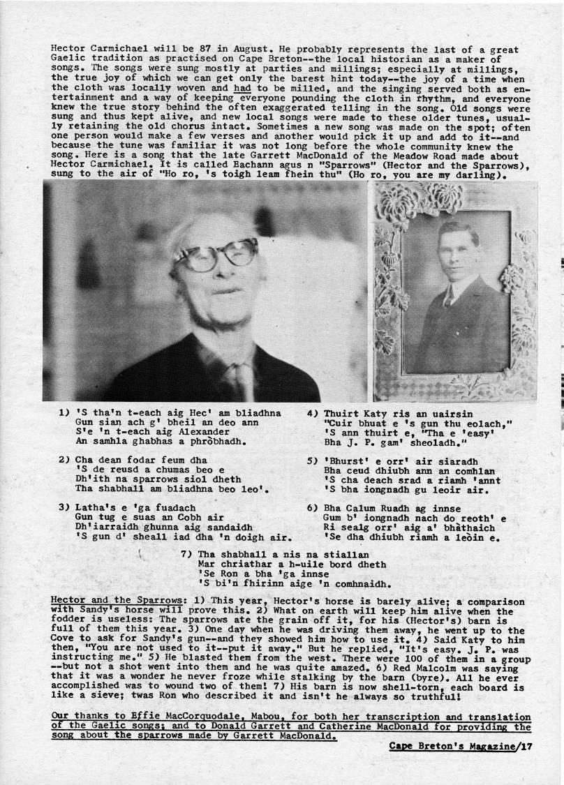Published by Ronald Caplan on 1974/3/1 (702 reads)Hector Carmichael will be 87 in August. He probably represents the last of a great Gaelic tradition as practised on Cape Breton • the local historian as a maker of songs. The songs were sung mostly at parties and millings; especially at millings, the true joy of which we can get only the barest hint today • the joy of a time when the cloth was locally woven and had to be milled, and the singing served both as en? tertainment and a way of keeping everyone pounding the cloth in rhythm, and everyone knew the true story behind the often exaggerated telling in the song. Old songs were sung and thus kept alive, and new local songs were made to these older tunes, usual? ly retaining the old chorus intact. Sometimes a new song was made on the spot; often one person would make a few verses and another would pick it up and add to it • and because the tune was familiar it was not long before the whole community knew the song. Here is a song that the late Garrett MacDonald of the Meadow Road made about Hector Carmichael. It is called Eachann agus n "Sparrows" (Hector and the Sparrows), sung to the air of "Ho ro, 's toigh leam fhein thu" (Ho ro, you are my darling), ,'''..;. , ?? '. ' ,' ' xx iv: S- 4??fM'??- 1) 'S tha'n t-each aig Hec' am bliadhna Gun sian ach g' bheil an deo ann S'e 'n t-each aig Alexander An samhla ghabhas a phrobhadh. 2) Cha dean fodar feum dha 'S de reusd a chumas beo e Dh'ith na sparrows siol dheth Tha shabhall am bliadhna beo leo', 3) Latha's e 'ga fuadach Gun tug e suas an Cobh air Dh'iarraidh ghunna aig sandaidh 'S gun d' sheall iad dha 'n doigh air. 4) Thuirt Katy ris an uairsin "Cuir bhuat e 's gun thu eolach," 'S ann thuirt e, "Tha e 'easy* Bha J. P. gam' sheoladh," 5) 'Bhurst' e orr' air siaradh Bha ceud dhiubh ann an comhlan 'S cha deach srad a riamh 'annt 'S bha iongnadh gu leoir air. 6) Bha Calum Ruadh ag innse Gum b' iongnadh nach do reoth' e Ri sealg orr' aig a' bhathaich 'Se dha dhiubh riamh a leoin e. 7) Tha shabhall a nis na stiallan Mar chriathar a h-uile bord dheth *Se Ron a bha 'ga innse 'S bi'n fhirinn aige 'n comhnaidh. Hector and the Sparrows: 1) This year. Hector's horse is barely alive; a comparison with Sandy's horse will prove this, 2) What on earth will keep him alive when the fodder is useless: The sparrows ate the grain off it, for his (Hector's) barn is full of them this year. 3) One day when he was driving them away, he went up to the Cove to ask for Sandy's gun • and they showed him how to use it. 4) Said Katy to him then, "You are not used to it • put it away." But he replied, "It's easy. J. P. was instructing me." 5) He blasted them from the west. There were 100 of them in a group • but not a shot went into them and he was quite amazed, 6) Red Malcolm was saying that it was a wonder he never froze while stalking by the barn (byre). All he ever accomplished was to wound two of themI 7) His barn is now shell-torn, each board is like a sieve; twas Ron who described it and isn't he always so truthfulS Our thanks to Effie MacCorquodale. Mabou. for both her transcription and translation of the Gaelic songs; and to Donald Garrett and Catherine MacDonald for providing the song about the sparrows made by Garrett MacDonald. Cape Breton's Magazine/l?