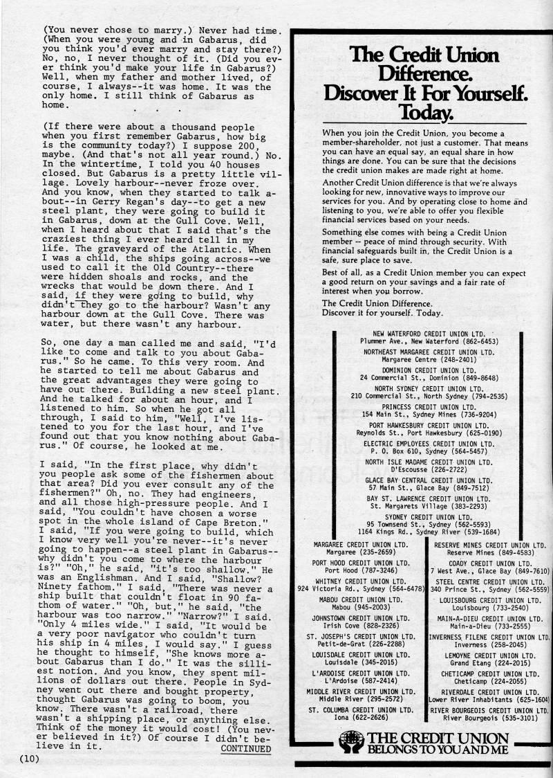 Published by Ronald Caplan on 1985/8/1 (363 reads)(You never chose to marry.) Never had time. (When you were young and in Gabarus, did you think you'd ever marry and stay there?) No, no, I never thought of it. (Did you ev? er think you'd make your life in Gabarus?) Well, when my father and mother lived, of course, I always--it was home. It was the only home. I still think of Gabarus as home. (If there were about a thousand people when you first remember Gabarus, how big is the community today?) I suppose 200, maybe. (And that's not all year round.) No. In the wintertime, I told you 40 houses closed. But Gabarus is a pretty little vil? lage. Lovely harbour--never froze over. And you know, when they started to talk a- bout--in Gerry Regan's day--to get a new steel plant, they were going to build it in Gabarus, down at the Gull Cove. Well, when I heard about that I said that's the craziest thing I ever heard tell in my life, the graveyard of the Atlantic. When I was a child, the ships going across--we used to call it the Old Country--there were hidden shoals and rocks, and the wrecks that would be down there. And I said, if they were goring to build, why didn't~they go to the harbour? Wasn't any harbour down at the Gull Cove. There was water, but there wasn't any harbour. So, one day a man called me and said, "I'd like to come and talk to you about Gaba? rus . " So he came. To this very room. And he started to tell me about Gabarus and the great advantages they were going to have out there. Building a new steel plant. And he talked for about an hour, and I listened to him. So when he got all through, I said to him, "Well, I've lis? tened to you for the last hour, and I've found out that you know nothing about Gaba? rus." Of course, he looked at me. I said, "In the first place, why didn't you people ask some of the fishermen about that area? Did you ever consult any of the fishermen?" Oh, no. They had engineers, and all those high-pressure people. And I said, "You couldn't have chosen a worse spot in the whole island of Cape Breton." I said, "If you were going to build, which I know very well you're never--it's never going to happen--a steel plant in Gabarus-- why didn't you come to where the harbour is?" "Oh," he said, "it's too shallow," He was an Englishman. And I said, "Shallow? Ninety fathom." I said, "There was never a ship built that couldn't float in 90 fa? thom of water." "Oh, but," he said, "the harbour was too narrow." "Narrow?" I said. "Only 4 miles wide," I said, "It would be a very poor navigator who couldn't turn his ship in 4 miles, I would say." I guess he thought to himself, "She knows more a- bout Gabarus than I do." It was the silli? est notion. And you know, they spent mil? lions of dollars out there. People in Syd? ney went out there and bought property, thought Gabarus was going to boom, you know. There wasn't a railroad, there wasn't a shipping place, or anything else. Think of the money it would cost! (You nev? er believed in it?) Of course I didn't be? lieve in it. CONTINUED (10) The Credit Union Difference. Discover It For Yourself. Today. When you join the Credit Union, you become a member-shareholder, not just a customer. That means you can have an equal say, an equal share in how things are done. You can be sure that the decisions the credit union makes are made right at home. Another Credit Union difference is that we're always looking for new, innovative ways to improve our services for you. And by operating close to home and listening to you, we're able to offer you flexible financial services based on your needs. Something else comes with being a Credit Union member ~ peace of mind through security. With financial safeguards built in, the Credit Union is a safe, sure place to save. Best of all, as a Credit Union member you can expect a good return on your savings and a fair rate of interest when yoy borrow. The Credit Union Difference. Discover it for yourself. Today. NEW WATERFORD CREDIT UNION LTD. ' Plummer Ave., New Waterford (862-6453) NORTHEAST MARGAREE CREDIT UNION LTD, Margaree Centre (248-2401) DOMINION CREDIT UNION LTD. 24 Commercial St., Dominion (849-8648) NORTH SYDNEY CREDIT UNION LTD. 210 Commercial St., North Sydney (794-2535) PRINCESS CREDIT UNION LTD. 154 Main St., Sydney Mines (736-9204) PORT HAWKESBURY CREDIT UNION LTD. Reynolds St., Port Hawkesbury (625-0190) ELECTRIC EMPLOYEES CREDIT UNION LTD. P. 0. Box 610, Sydney (564-5457) NORTH ISLE MADAME CREDIT UNION LTD. D'Escousse (226-2722) GLACE BAY CENTRAL CREDIT UNION LTD. 57 Main St., Glace Bay (849-7512) BAY ST. LAWRENCE CREDIT UNION LTD. St. Margarets Village (383-2293) SYDNEY CREDIT UNION LTD. 95 Townsend St., Sydney (562-5593) 1164 Kings Rd., Sydney River (539-1684) MARGAREE CREDIT UNION LTD. Margaree (235-2659) PORT HOOD CREDIT UNION LTD. Port Hood (787-3246) WHITNEY CREDIT UNION LTD. 924 Victoria Rd., Sydney (564-6478)| MABOU CREDIT UNION LTD. Mabou (945-2003) JOHNSTOWN CREDIT UNION LTD. Irish Cove (828-2326) ST. JOSEPH'S CREDIT UNION LTD. Petit-de-Grat (226-2288) LOUISDALE CREDIT UNION LTD. Louisdale (345-2015) L'ARDOISE CREDIT UNION LTD. L'Ardoise (587-2414) MIDDLE RIVER CREDIT UNION LTD. Middle River (295-2572) ST. COLUMBA CREDIT UNION LTD. lona (622-2626) RESERVE MINES CREDIT UNION LTD. Reserve Mines (849-4583) COADY CREDIT UNION LTD. 7 West Ave.. Glace Bay (849-7610) j STEEL CENTRE CREDIT UNION LTD. 340 Prince St., Sydney (562-5559)] • LOUISBOURG CREDIT UNION LTD. Louisbourg (733-2540) MAIN-A-DIEU CREDIT UNION LTD. Main-a-Dieu (733-2555) INVERNESS FILENE CREDIT UNION LTD, | Inverness (258-2045) LEMOYNE CREDIT UNION LTD. Grand Etang (224-2015) CHETICAMP CREDIT UNION LTD. Cheticamp (224-2055) RIVERDALE CREDIT UNION LTD. [Lower River Inhabitants (625-1604)1 RIVER BOURGEOIS CREDIT UNION LTD. [ River Bourgeois (535-3101) > THE CREDIT UNION