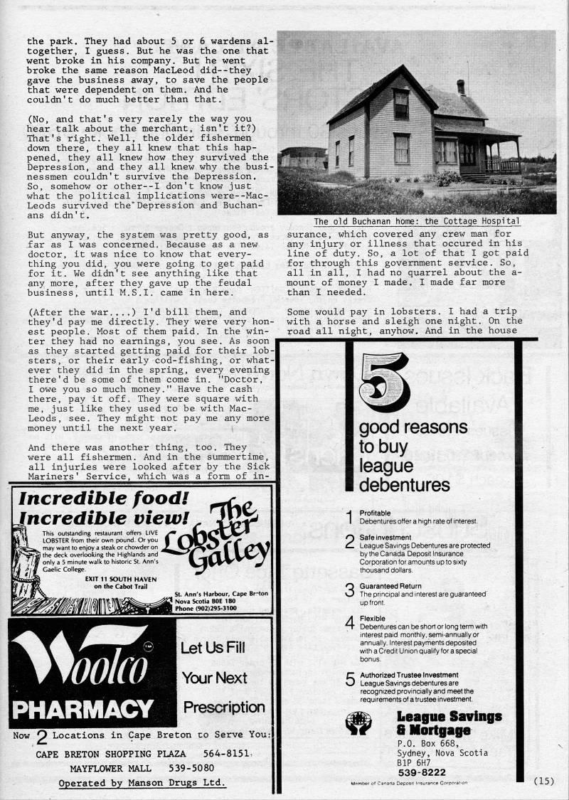 the park. They had about 5 or 6 wardens al? together, I guess. But he was the one that went broke in his company. But he went broke the same reason MacLeod did--they gave the business away, to save the people that were dependent on them. And he couldn't do much better than that. (No, and that's very rarely the way you hear talk about the merchant, isn't it?) That's right. Well, the older fishermen down there, they all knew that this hap? pened, they all knew how they survived the Depression, and they all knew why the busi? nessmen couldn't survive the Depression. So, somehow or other--I don't know just what the political implications were--Mac? Leods survived the*Depression and Buchan? ans didn't. But anyway, the system was pretty good, as .far as I was concerned. Because as a new doctor, it was nice to know that every? thing you did, you were going to get paid for it. We didn't see anything like that any more, after they gave up the feudal business, until M.S.I, came in here. (After the war....) I'd bill them, and they'd pay me directly. They were very hon? est people. Most of them paid. In the win? ter they had no earnings, you see. As soon as they started getting paid for their lob? sters, or their early cod-fishing, or what? ever they did in the spring, every evening there'd be some of them come in. "Doctor, I owe you so much money." Have the cash there, pay it off. They were square with me, just like they used to be with Mac? Leods, see. They might not pay me any more money until the next year. And there was another thing, too. They were all fishermen. And in the summertime, all injuries were looked after by the Sick Mariners' Service, which was a form of in- Prescription Now O Locations in Cape Breton uo Serve You CAPE BRETON SHOPPING PLAZA 564-8151> MAYFLOWER MALL 539-5080 Operated by Hanson Drugs Ltd. The old Buchanan home: the Cottage Hospital surance, which covered any crew man for any injury or illness that occured in his line of duty. So, a lot of that I got paid for through this government service. So, all in all, I had no quarrel about the a- mount of money I made, I made far more than I needed. Some would pay in lobsters. I had a trip with a horse and sleigh one night. On the road all night, anyhow. And in the house 1 good reasons to buy league debentures Profitable Debentures offer a high rate of interest. Safe investment League Savings Debentures are protected by the Canada Deposit Insurance Corporation for amounts up to sixty thousand dollars. Guaranteed Return The pri nci pal and i nterest are guaranteed' upfront. Flexible ' Debentures can be short or long term with interest paid monthly, semi-annually or annually. Interest payments deposited with a Credit Union qualify for a special bonus. Authorized Trustee Investment ' League Savings debentures are recognized provincially and meet the requirements of a trustee investment. League Savings 8 Mortgage P.O. Box 668, Sydney, Nova Scotia BIP 6H7 539-8222 (15)