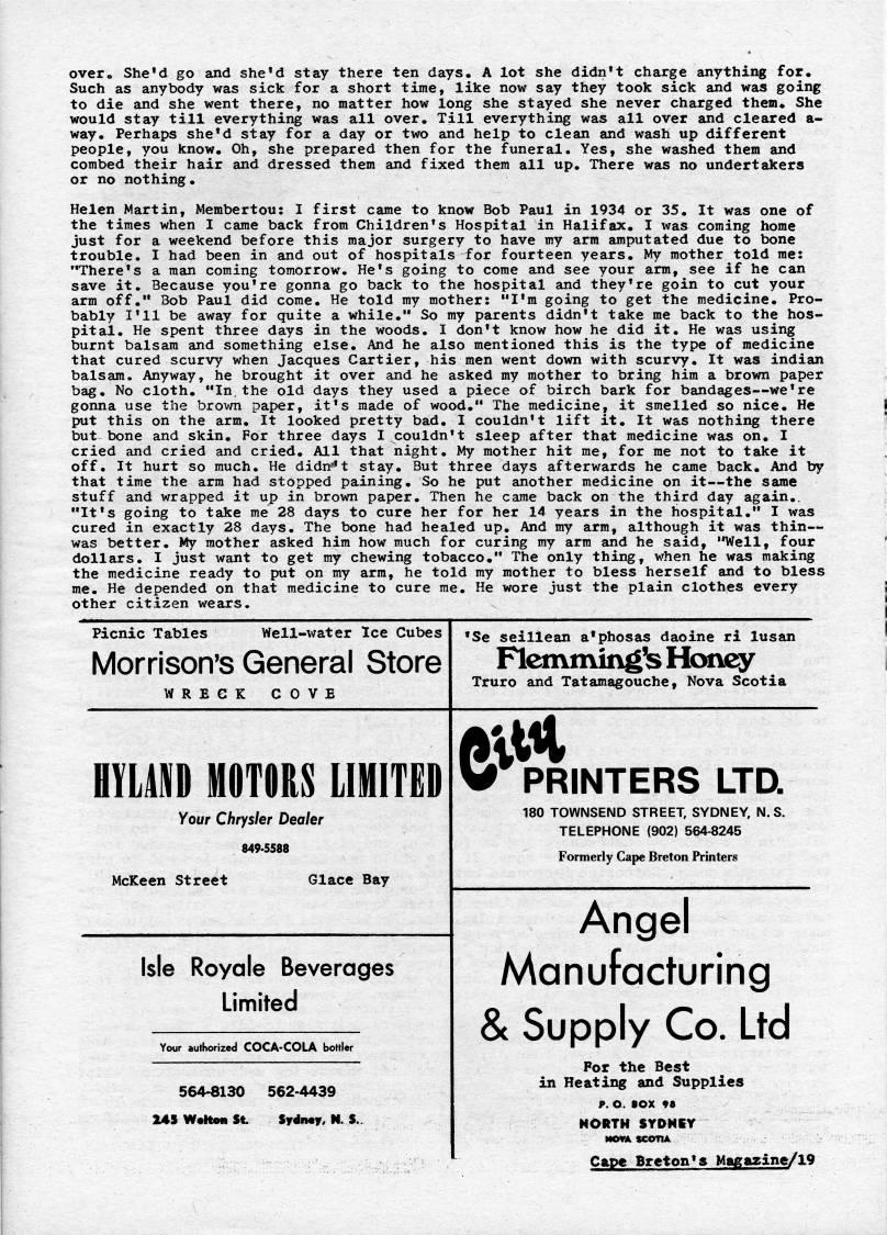 Published by Ronald Caplan on 1974/3/1 (800 reads)over. She'd go and she'd stay there ten days. A lot she didn't charge anything for. Such as anybody was sick for a short time, like now say they took sick and was going to die and she went there, no matter how long she stayed she never charged them. She would stay till everything was all over. Till everything was all over and cleared a- way. Perhaps she'd stay for a day or two and help to clean and wash up different people, you know. Oh, she prepared then for the funeral. Yes, she washed them and combed their hair and dressed them and fixed them all up. There was no undertakers or no nothing. Helen Martin, Membertou: I first came to know Bob Paul in 1934 or 35. It was one of the times when I came back from Children's Hospital in Halifax. I was coming home just for a weekend before this major surgery to have my arm amputated due to bone trouble. I had been in and out of hospitals for fourteen years. My mother told me: "There's a man coming tomorrow. He's going to come and see your arm, see if he can save it. Because you're gonna go back to the hospital and they're goin to cut your arm off." Bob Paul did come. He told my mother: • • I'm going to get the medicine. Pro? bably I'll be away for quite a while." So my parents didn't take me back to the hos? pital. He spent three days in the woods, I don't know how he did it. He was using burnt balsam and something else. And he also mentioned this is the type of medicine that cured scurvy when Jacques Cartier, his men went down with scurvy. It was Indian balsam. Anyway, he brought it over and he asked my mother to bring him a brown paper bag. No cloth. "In. the old days they used a piece of birch bark for bandages • we're gonna use the brown paper, it's made of wood." The medicine, it smelled so nice. He put this on the arm. It looked pretty bad. I couldn't lift it. It was nothing there but bone and skin. For three days I couldn't sleep after that medicine was on. I cried and cried and cried. All that night. My mother hit me, for me not to take it off. It hurt so much. He didn''t stay. But three days afterwards he came back. And by that time the arm had stopped paining. So he put another medicine on it • the same stuff and wrapped it up in brown paper. Then he came back on the third day again.. "It's going to take me 28 days to cure her for her 14 years in the hospital." I was cured in exactly 28 days. The bone had healed up. And my arm, although it was thin • was better. My mother asked him how much for curing my arm and he said, "Well, four dollars, I just want to get my chewing tobacco." The only thing, when he was making the medicine ready to put on my arm, he told ray mother to bless herself and to bless me. He depended on that medicine to cure me. He wore just the plain clothes every other citizen wears. Picnic Tables Well-water Ice Cubes Morrison's General Store WRECK COVE HmilD MOTORS LIHITED Your Chrysler Dealer 849-5588 McKeen Street Glace Bay Isle Royale Beverages Limited Your authorized COCA-COLA bottler 564-8130 562-4439 24SW?ltMiSt. SydiMy, N. S. ??Se seillean a'phosas daoine ri lusan Flemming's Honey Truro and Tatamagouche, Nova Scotia V PRINTERS LTD. 180 TOWNSEND STREET, SYDNEY, N.S. TELEPHONE (902) 564-8245 Formerly Cape Breton Printers Angel Manufacturing & Supply Co. Lfd For the Best in Heating and Supplies j??. o. iox e NORTH SYDNEY MOVA SCOTIA "' Cajfe Breton's Ma'azine/19