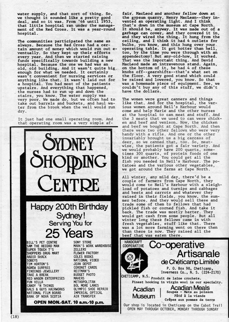 water supply, and that sort of thing. So, we thought it sounded like a pretty good deal, and so it was. From '46 until 1953, that little hospital ran inder the manage? ment of the Red Cross. It was a year-round hospital. The communities participated the same as always. Because the Red Cross had a cer? tain amount of money which would run out e- ventually. So they kept up their efforts every year. And then we started raising funds specifically towards building a new hospital. Because the one we had was an old, old building. And it wasn't quite big' enough for what we needed. It certainly wasn t convenient for nursing services or anything like that. It wasn't laid out for a hospital. You had most of the patients upstairs. And everything that happened, the nurses had to run up and down the stairs, you know. The water supply was very poor. We made do, but we often had to take out barrels and buckets, and haul wa? ter from the brook when the well would run dry. It just had one small operating room. And that operating room was a very simple af- 6YDNEY OHOg'ING Centre Happy 200th Birthday Sydney! Serving You for 25 Years BILL'S PET CENTRE SAM THE RECORD MAN SUPER TOUCH T'S SHOPPERS DRUG MART RADIO SHACK SOBEYS TIM HORTON'S AGNEW SURPASS FINDINGS JEWELLERY TAKE A BREAK RED WAGON ENTERPRISES FUN VILLA CANDY 'N THINGS GALS & GUYS HAIRWORKS NATIONAL FILM BOARD BANK OF NOVA SCOTIA SONY STORE MARK'S WORK WAREHOUSE ZELLERS FLOWER FACTORY COLES BOOKS NATIONAL VIDEO JEAN DEPOT CORONET CARDS REITMAN'S BUDGET PHOTO MAHERS METROPOLITAN BOL MORE LANES OLYMPIC SHOE REPAIR IMPERIAL OPTICAL AIR TRANSFER OPEN MON.-SAT. 10 a.m.-10 p.m. fair. MacLeod and another fellow down at the gypsum quarry, Henry MacLean • they in? vented an operating light. And I think that's down in the museum at Cape North. It should be, anyway. It was made out of a garbage can cover, and they covered it in, and they wired the thing. It hung from the ceiling, and I think it had 4 outlets for bulbs, you know, and this hung over your, operating table. It got hotter than hell, too, by the time you were through with an appendectomy! But any-old-how, it worked. That was the important thing. And David MacLeod made an intravenous stand. Again, on the bottom of it, he had 4 of these knobs off--gearshifts--that's what set on the floor. A very good stand which could be raised and lowered, you know. So that was a homemade piece of equipment. See, we couldn't buy any of this stuff, we didn't have the dollars. The women were great canners and things like that. And for the hospital, the var? ious women around Neil's Harbour would come and help Marie and the other nurses at the hospital to can meat and stuff. And the 3 meats that we used to can were chick? en and beef and venison. Now, the chicken and beef we bought at Cape North.' And then there were two other fellows who were very handy' with a rifle. And one or the other invariably brought us a big carcass of deer, so we canned that, too. So, meat- wise, the patients got a fair variety. And we would probably have 200 quarts, some? times 300 quarts, of protein foods of one kind or another. You could get all the fish you needed in Neil's Harbour. The po? tatoes and the various other vegetables, we got around the farms at Cape North, All winter, any mild day, there'd be a couple of farmers from Cape North, they would come to Neil's Harbour with a sleigh- load of potatoes and turnips and cabbages and beets and carrots and whatever they raised in their fields, you know, the sum? mer before. And they would sell these and trade some of them to fellows that had pickled fish or corned fish. And take it back. The trade was mostly barter. They would get cash from some people. But all winter long these fellows came in with fresh vegetables, stuff like that. There was a lot more farming went on there then than there is now. They raised all the beef that was eaten there. Co-operative Artisanale de Cheticamp Limitee p. 0. Box 98, Cheticamp, Inverness Co., N. S. (224-2170) [CHETICAMP, N.S. 'o ' '* ' -. ' I Produit de laine crochete. Finest hooking in virgin wool is our specialty. Acadian i Acadian Meals '''' '' ' Soupes - Mets au poisson Museum • '''' ' '' vlande Crepes aux pommes de terre Our shop is located in Cheticamp on the Cabot Trail OPEN MAY THROUGH OCTOBER, MONDAY THROUGH SUNDAY (18)