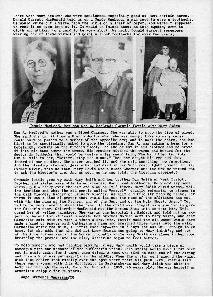 Published by Ronald Caplan on 1974/3/1 (1834 reads)There were many healers who were considered especially good at just certain cures. Donald Garrett MacDonald told us of a Sandy MacLeod, a man good to cure a toothache. He would write out a verse from the Bible on a sheet of paper. You weren't supposed to read it or even look at it. It would be folded about an inch square, sewn in cloth and affixed to a cord to be worn about the neck, Donald Garrett remembers wearing one of these verses and going without toothache for over two years. Jessijg MacLeod, her son Dan A? MacLeod; Gwennie Pottie with Mary Smith Dan A, MacLeod's mother was a Blood Charmer. She was able to stop the flow of blood. She said she got it from a French doctor when she was young. Like so many cures it could only be passed to a member of the opposite sex; and to work the charm, she had first to be specifically asked to stop the bleeding. Dan A. was making a beam for a bobsleigh, working on the kitchen floor. The axe caught in his clothes and he drove it into his hand above the thumb. His brother hitched the wagon and headed for the doctor in Baddeck; that would be twelve miles round trip. The hand bled terribly. Dan A. said to her, "Mother, stop the blood." Then she caught his eye and they looked at one another. She never touched it. And she said something now forgotten. And the bleeding stopped, Jessie MacLeod died in her 96th year. (John Joseph Gillis, Sydney River, told us that Perry Lewis was a Blood Charmer and the way he worked was to ask the bleeder's age. And as soon as he was told, the bleeding stopped.) Gwennie Pottie grew up with Mary Smith and her brother Dan Smith of West Tarbot. Brother and sister were able to work cures. Dan cured toothache. He would say some words, put a hanky over the ear and blow on it 3 times. Mary Smith cured worms, yel? low jaundice and what the old people called "gravel" • usually referring to stones in the gall bladder, kidney or urinary bladder, usually a difficulty passing urine. For worms it was a kind of prayer that would include the name of the afflicted and end with "in the name of the Father, and of the Son, and of the Holy Ghost. Amen." You had to be very careful about the name. If the child was illegitimate you had to give the father's name. Catherine MacDonald out the Meadow Road told us that Mary Smith cured her of yellow jaundice. She was in the hospital in Baddeck and told not to ex? pect to be out for at least 3 weeks. Her brother Norman went to Mary Smith, who sent Catherine skim milk to take 3 times a day. Mrs, Pottie said the old woman would have made a kind of prayer with Catherine's name and breathed three times into the milk. Catherine drank the milk, a little each day • and in 3 days she was well enough to go home. But she adds that she did not know Norman was going to Mary Smith's, and yet at the time Norman was at the house, probably while Mary Smith was alone in her room breathing the prayer into the milk, Catherine began to feel better. To help someone who had trouble passing urine, Mary Smith would take a piece of homespun yarn the measure of the sufferer's vaist. This string would have first been put in stale urine for 3 days, then dried, A knot was tied on each end of the string and then a knot was put exactly in the middle. Then the string went around the waist with that center knot exactly over the spot where there was pain. Mrs. Pottie said there was a woman with this difficulty in Saskatchewan and Mary Smith was able to help her through the mail. Mary Smith died in 1963, 90 years old. She was herself an arthritic cripple for 70 years. Cape Breton's Maga2ine/20