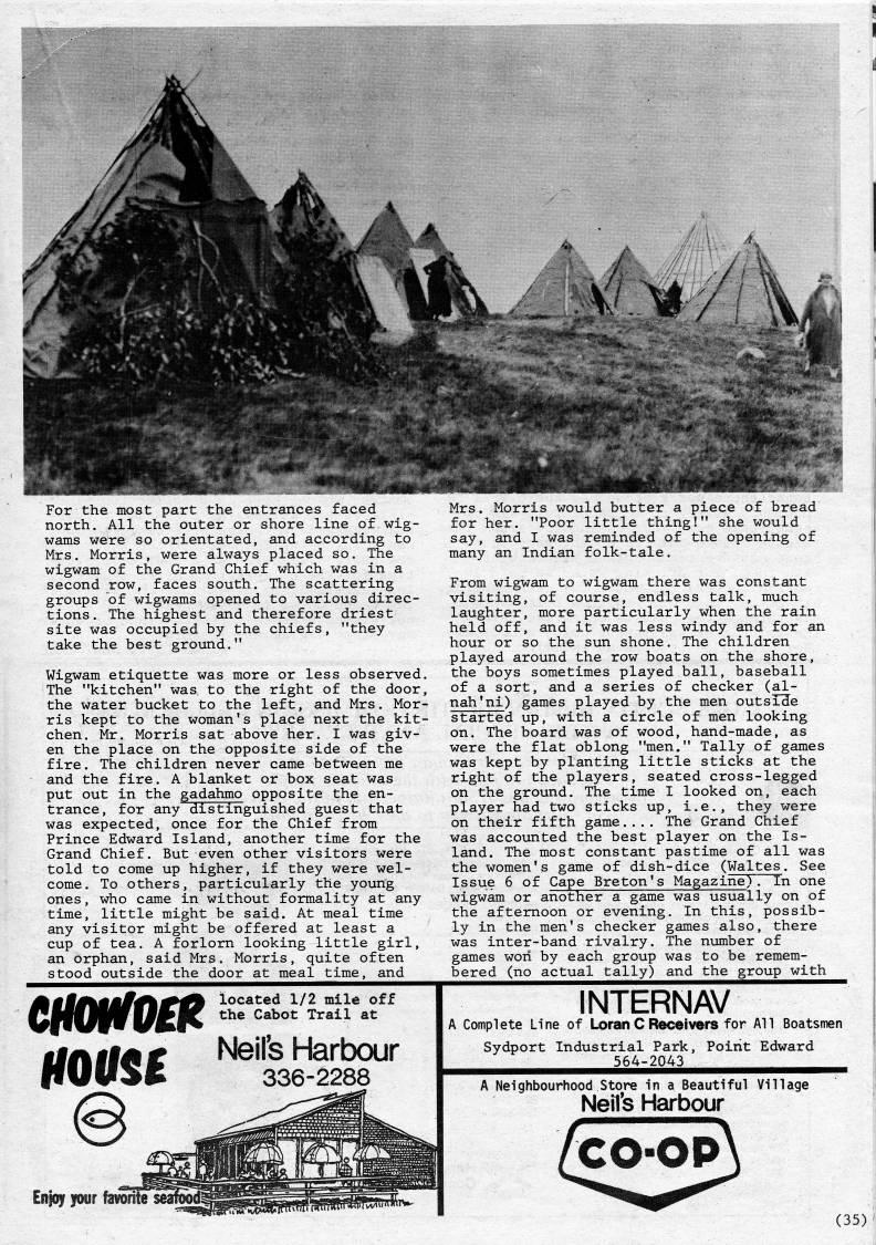 Published by Ronald Caplan on 1985/8/1 (379 reads)For the most part the entrances faced north. All the outer or shore line of wig? wams were so orientated, and according to Mrs. Morris, were always placed so. The wigwam of the Grand Chief which was in a second row, faces south. The scattering groups of wigwams opened to various direc? tions. The highest and therefore driest site was occupied by the chiefs, "they take the best ground." Wigwam etiquette was more or less observed. The "kitchen" was to the right of the door, the water bucket to the left, and Mrs. Mor? ris kept to the woman's place next the kit? chen. Mr. Morris sat above her. I was giv? en the place on the opposite side of the fire. The children never came between me and the fire. A blanket or box seat was put out in the gadahmo opposite the en? trance, for any distinguished guest that was expected, once for the Chief from Prince Edward Island, another time for the Grand Chief. But even other visitors were told to come up higher, if they were wel? come. To others, particularly the young ones, who came in without formality at any time, little might be said. At meal time any visitor might be offered at least a cup of tea. A forlorn looking little girl, an orphan, said Mrs. Morris, quite often stood outside the door at meal time, and Mrs. Morris would butter a piece of bread for her. "Poor little thing!" she would say, and I was reminded of the opening of many an Indian folk-tale. From wigwam to wigwam there was constant visiting, of course, endless talk, much laughter, more particularly when the rain held off, and it was less windy and for an hour or so the sun shone. The children played around the row boats on the shore, the boys sometimes played ball, baseball of a sort, and a series of checker (al- nah'ni) games played by the men outsTSe started up, with a circle of men looking on. The board was of wood, hand-made, as were the flat oblong "men." Tally of games was kept by planting little sticks at the right of the players, seated cross-legged on the ground. The time I looked on, each player had two sticks up, i.e., they were on their fifth game.... The Grand Chief was accounted the best player on the Is? land. The most constant pastime of all was the women's game of dish-dice (Waltes. See Issue 6 of Cape Breton's Magazine). Tn one wigwam or another a game was usually on of the afternoon or evening. In this, possib? ly in the men's checker games also, there was inter-band rivalry. The nijmber of games won by each group was to be remem- bered (no actual tally) and the group with cHonmn (foirsc located 1/2 mile off the Cabot Trail at Neil's Harbour 336-5288 Enjoy )our fawrite INTERNAV A Complete Line of Loran C Receivers for All Boatsmen Sydport Industrial Park, Point Edward 564-2043 _' A Neighbourhood Store in a Beautiful Village Neil's Harbour CO-OP (35) '