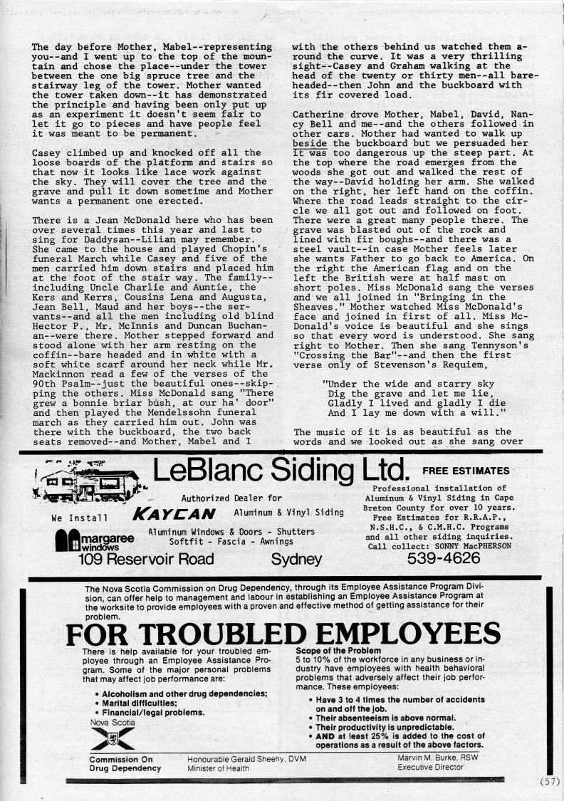 The day before Mother, Mabel--representing you--and I went up to the top of the moun? tain and chose the place • under the tower between the one big spruce tree and the stairway leg of the tower. Mother wanted the tower taken down--it has demonstrated the principle and having been only put up as an experiment it doesn't seem fair to let it go to pieces and have people feel it was meant to be permanent. Casey climbed up and knocked off all the loose boards of the platform and stairs so that now it looks like lace work against the sky. They will cover the tree and the grave and pull it down sometime and Mother wants a permanent one erected. There is a Jean McDonald here who has been over several times this year and last to sing for Daddysan--Lilian may remember. She came to the house and played Chopin's funeral March while Casey and five of the men carried him down stairs and placed him at the foot of the stair way. The family-- including Uncle Charlie and Auntie, the Kers and Kerrs, Cousins Lena and Augusta, Jean Bell, Maud and her boys--the ser? vants --and all the men including old blind Hector P., Mr. Mclnnis and Duncan Buchan? an- -were there. Mother stepped forward and stood alone with her arm resting on the coffin--bare headed and in white with a soft white scarf around her neck while Mr, Mackinnon read a few of the verses of the 90th Psalm--just the beautiful ones--skip- . ping the others. Miss McDonald sang "There grew a bonnie briar bush, at our ha' door" and then played the Mendelssohn funeral march as they carried him out. John was there with the buckboard, the two back seats removed--and Mother, Mabel and I with the others behind us watched them a- round the curve. It was a very thrilling sight • Casey and Graham walking at the head of the twenty or thirty men--all bare? headed- -then John and the buckboard with its fir covered load. Catherine drove Mother, Mabel, David, Nan? cy Bell and me--and the others followed in other cars. Mother had wanted to walk up beside the buckboard but we persuaded her It was too dangerous up the steep part. At the top where the road emerges from the woods she got out and walked the rest of the way--David holding her arm. She walked on the right, her left hand on the coffin. Where the road leads straight to the cir? cle we all got out and followed on foot. There were a great many people there. The grave was blasted out of the rock and lined with fir boughs--and there was a steel vault--in case Mother feels later she wants Father to go back to America. On the right the American flag and on the left the British were at half mast on short poles. Miss McDonald sang the verses and we all joined in "Bringing in the Sheaves." Mother watched Miss McDonald's face and joined in first of all. Miss Mc? Donald's voice is beautiful and she sings so that every word is understood. She sang right to Mother. Then she sang Tennyson's "Crossing the Bar"--and then the first verse only of Stevenson's Requiem, "Under the wide and starry sky Dig the grave and let me lie. Gladly I lived and gladly I die And I lay me down with a will." The music of it is as beautiful as the words and we looked out as she sang over LeBlanc Siding Ltd. 'e estimates ** Professional installation of We Install Authorized Dealer for margaree windows Aluminum Windows & Doors - Shutters Softfit - Fascia - Awnings 109 Reservoir Road Sydney Professional installation of Aluminum & Vinyl Siding in Cape Breton County for over 10 years. Free Estimates for R.R.A.P., N.S.H.C, & C.M.H.C. Programs and all other siding inquiries. Call collect: SONNY MacPHERSON 539-4626 The Nova Scotia Commission on Drug Dependency, through its Employee Assistance Program Divi? sion, can offer help to management and labour in establishing an Employee Assistance Program at the wort'site to provide employees with a proven and effective method of getting assistance for their problem. FOR TROUBLED EMPLOYEES There is help available for your troubled em? ployee through an Employee Assistance Pro? gram. Some of the major personal problems that may affect job performance are: • Alcoholism and other drug dependencies; • Marital difficulties; • Financial/legal problems. Nova Scotia "'iir Scope of the Problem 5 to 10% of the workforce in any business or in? dustry have employees with health behavioral problems that adversely affect their job perfor? mance. These employees: • Have 3 to 4 times the number of accidents on and off the job. • Their absenteeism is above normal. • Their productivity is unpredictable. • AND at least 25% Is added to the cost of operations as a result of the above factors. Commission On Drug Dependency Honourable Gerald Sheehy, DVM Minister of Health Marvin M. Burke, RSW Executive Director (57)