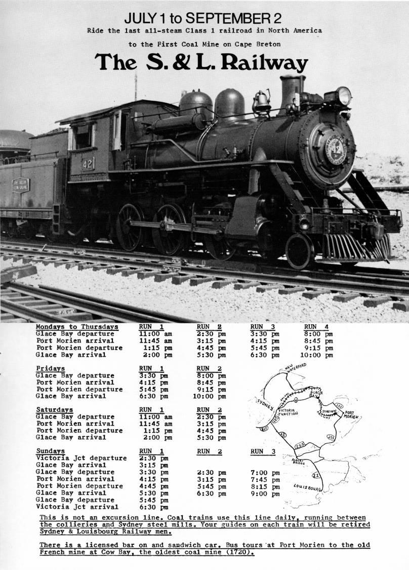 Published by Ronald Caplan on 1974/3/1 (634 reads)JULY 1 to SEPTEMBER 2 Ride the last all-steam Class 1 railroad in North America to the First Coal Mine on Cape Breton The S. & L. Railway Mondays to Thursdays Glace Bay departure Port Morien arrival Port Morien departure Glace Bay arrival Fridays Glace Bay departure Port Morien arrival Port Morien departure Glace Bay arrival Saturdays Glace Bay departure Port Morien arrival Port Morien departure Glace Bay arrival Sundays Victoria Jet departure Glace Bay arrival Glace Bay departure Port Morien arrival Port Morien departure Glace Bay arrival Glace Bay departure Victoria Jet arrival 11:00 am 11:45 am 1:15 pm 2:00 pm RUN 1 3:30 pm 4:15 pm 5:45 pm 6:30 pm RUN 1 11:00 am 11:45 am 1:15 pm 2:00 pm RUN 1 2:30 pm 3:15 pm 3:30 pra 4:15 pm 4:45 pm 5:30 pm 5:45 pm 6:30 pm 2:30 pra 3:15 pm 4:45 pm 5:30 pra RUN 2 8:00 pm 8:45 pm 9:15 pm 10:00 pm RUN 2 2:30 pra 3:15 pm 4:45 pm 5:30 pm RUN 2 2:30 pm 3:15 pra 5:45 pra 6:30 pm 7:00 pm 7:45 pm :15 pm ''"*''eoni'i 9:00 pm '' _? This is not an excursion line. Coal trains use this line daily, running between the collieries and Sydney steel mills. Your guides on each train will be retired Sydney & Louisbourg Railway men. There is a licensed bar on and sandwich car. Bus tours at Port Morien to the old French mine at Cow Bay, the oldest coal mine (1720)7