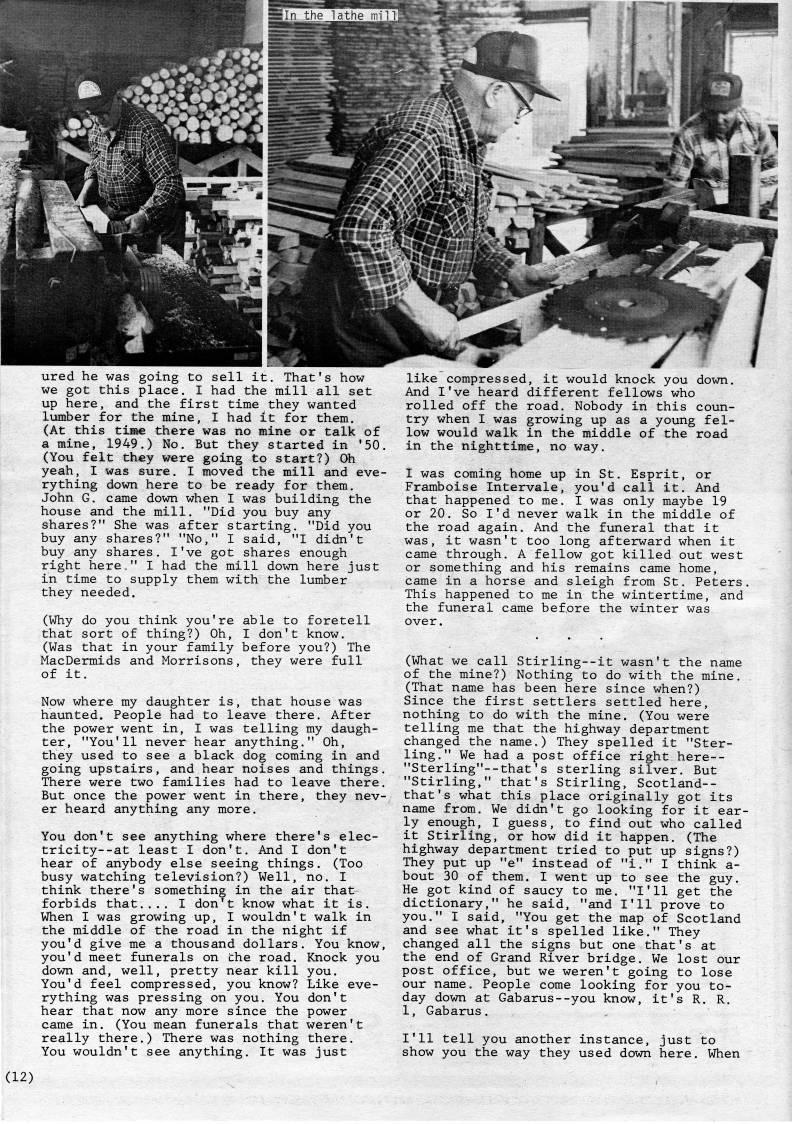Published by Ronald Caplan on 1986/1/1 (364 reads)ured he was going to sell it. That's how we got this place. I had the mill all set up here, and the first time they wanted liimber for the mine, I had it for them. (At this time there was no mine or talk of a mine, 1949.) No. But they started in '50. (You felt they were going to start?) Oh yeah, I was sure. I moved the mill and eve? rything down here to be ready for them. John G. came down when I was building the house and the mill. "Did you buy any shares?" She was after starting. "Did you buy any shares?" "No," I said, "I didn't buy any shares. I've got shares enough right here," I had the mill down here just in time to supply them with the lumber they needed. (Why do you think you're able to foretell that sort of thing?) Oh, I don't know. (Was that in your family before you?) The MacDermids and Morrisons, they were full of it. Now where my daughter is, that house was haunted. People had to leave there. After the power went in, I was telling my daugh? ter, "You'll never hear anything." Oh, they used to see a black dog coming in and going upstairs, and hear noises and things. There were two families had to leave there. But once the power went in there, they nev? er heard anything any more. You don't see anything where there's elec? tricity- -at least I don't. And I don't hear of anybody else seeing things. (Too busy watching television?) Well, no. I think there's something in the air that forbids that.... I don't know what it is. When I was growing up, I wouldn't walk in the middle of the road in the night if you'd give me a thousand dollars. You know, you'd meet funerals on the road. Knock you down and, well, pretty near kill you. You'd feel compressed, you know? Like eve? rything was pressing on you. You don't hear that now any more since the power came in. (You mean funerals that weren't really there.) There was nothing there. You wouldn't see anything. It was just like compressed, it would knock you down. And I've heard different fellows who rolled off the road. Nobody in this coun? try when I was growing up as a young fel? low would walk in the middle of the road in the nighttime, no way. I was coming home up in St. Esprit, or Framboise Intervale, you'd call it. And that happened to me. I was only maybe 19 or 20. So I'd never walk in the middle of the road again. And the funeral that it was, it wasn't too long afterward when it came through. A fellow got killed out west or something and his remains came home, came in a horse and sleigh from St. Peters. This happened to me in the wintertime, and the funeral came before the winter was over. (What we call Stirling--it wasn't the name of the mine?) Nothing to do with the mine. (That name has been here since when?) Since the first settlers settled here, nothing to do with the mine. (You were telling me that the highway department changed the name.) They spelled it "Ster? ling," We had a post office right here-- "Sterling"--that's sterling silver. But "Stirling," that's Stirling, Scotland-- that's what this place originally got its name from. We didn't go looking for it ear? ly enough, I guess, to find out who called it Stirling, or how did it happen. (The highway department tried to put up signs?) They put up "e" instead of "i." I think a- bout 30 of them. I went up to see the guy. He got kind of saucy to me. "I'll get the' dictionary," he said, "and I'll prove to you." I said, "You get the map of Scotland and see what it's spelled like." They changed all the signs but one that's at the end of Grand River bridge. We lost our post office, but we weren't going to lose our name. People come looking for you to? day down at Gabarus--you know, it's R. R, 1, Gabarus. I'll tell you another instance, just to show you the way they used down here. When