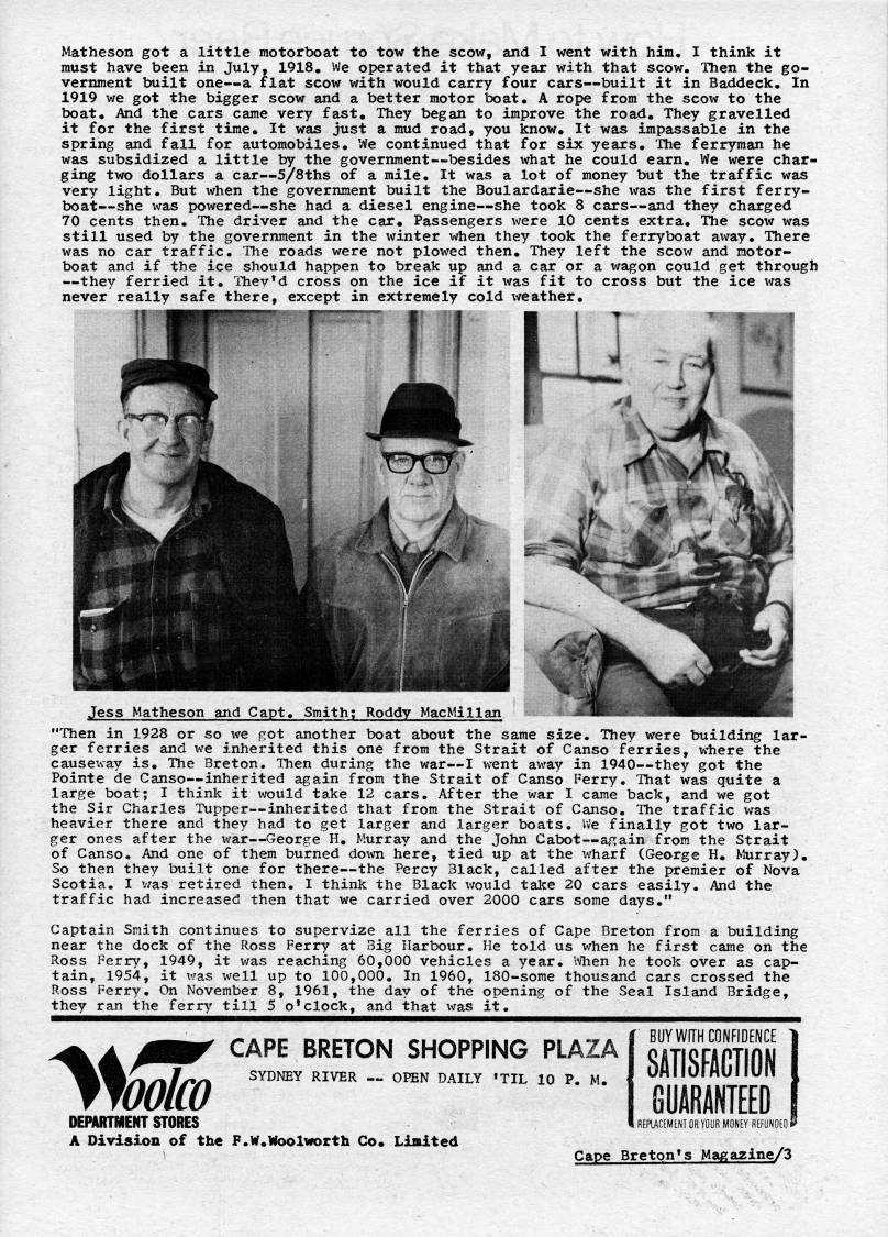 Published by Ronald Caplan on 1974/6/1 (3272 reads)Matheson got a little motorboat to tow the scow, and I went with him, I think it must have been in July, 1918, We operated it that year with that scow. Then the go? vernment built one • a flat scow with would carry four cars • built it in Baddeck, In 1919 we got the bigger scow and a better motor boat, A rope from the scow to the boat. And the cars came very fast. They began to improve the road. They gravelled it for the first time. It was just a mud road, you know. It was impassable in the spring and fall for automobiles. We continued that for six years. The ferryman he was subsidized a little by the government • besides what he could earn. We were char? ging two dollars a car • 5/8ths of a mile. It was a lot of money but the traffic was very light. But when the government built the Boulardarie • she was the first ferry? boat • she was powered • she had a diesel engine • she took 8 cars • and they charged 70 cents then. The driver and the car. Passengers were 10 cents extra. The scow was still used by the government in the winter when they took the ferryboat away. There was no car traffic. The roads were not plowed then. They left the scow and motor- boat and if the ice should happen to break up and a car or a ivagon could get through • they ferried it. They'd cross on the ice if it was fit to cross but the ice was never really safe there, except in extremely cold weather. Jess Matheson and Capt. Smith; Roddy MacMillan "Then in 1928 or so "?e got another boat about the same size. They were building lar? ger ferries and we inherited this one from the Strait of Canso ferries, where the causeway is. The Breton. Then during the war • I went away in 1940 • they got the Pointe de Canso • inherited again from the Strait of Canso Ferry. That was quite a large boat; I think it would take 12 cars. After the war I came back, and we got the Sir Charles Tupper • inherited that from the Strait of Canso. The traffic was heavier there and they had to get larger and larger boats. We finally got two lar? ger ones after the war • George H, Murray and the John Cabot • again from the Strait of Canso. And one of them burned down here, tied up at the v;harf (George H, Murray), So then they built one for there • the Percy Black, called after the premier of Nova Scotia. I v;as retired then. I think the Black would take 20 cars easily. And the traffic had increased then that we carried over 2000 cars some days," Captain Smith continues to supervize all the ferries of Cape Breton from a building near the dock of the Ross Ferry at Big Harbour. He told us when he first came on the Ross Ferry, 1949, it v/as reaching 60,000 vehicles a year, li/hen he took over as cap? tain, 1954, it v;as well up to 100,000, In 1960, 180-some thousand cars crossed the Ross Ferry. On November 8, 1961, the day of the opening of the Seal Island Bridge, they ran the ferry'' till 5 o'clock, and that was it. CAPE BRETON SHOPPING PLAZA SYDNEY RIVER • OPEN DAILY 'TIL 10 P. M, DEPARTMENT STORES A Division of the F.W.IKoolworth Co, Limited f BUY WfTH CONFIDENCE SATISFACTION GUARANTEED REPWCEWENT OR YOUR MONEY REFUNDED ?? Cape Breton's Maga2ine/3