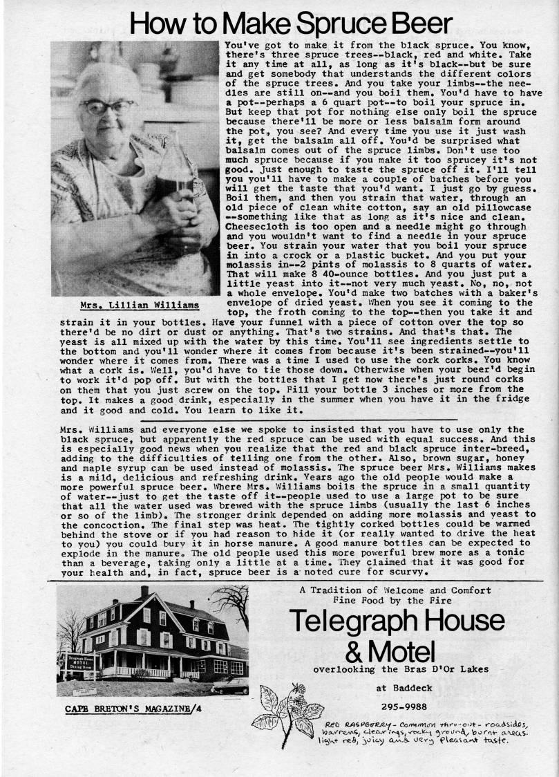 Published by Ronald Caplan on 1974/6/1 (33874 reads)How to Make Spruce Beer You've got to make it from the black spruce. You know, there's three spruce trees • black, red and white. Take it any time at all, as long as it's black • but be sure and get somebody that understands the different colors of the spruce trees. And you tsike your limbs • the nee? dles are still on • and you boil them. You'd have to have a pot • perhaps a 6 quart pot--to boil your spruce in. But keep that pot for nothing else only boil the spruce because there'll be more or less balsalm form around the pot, you see? And every time you use it just wash it, get the balsalm all off. You'd be surprised what balsalm comes out of the spruce limbs. Don't use too much spruce because if you make it too sprucey it's not good. Just enotigh to taste the spruce off it. I'll tell you you'll have to make a couple of batches before you will get the taste that you'd want, I just go by guess. Boil them, and then you strain that water, through an old piece of clean white cotton, say an old pillowcase • something like that as long as it's nice and clean. Cheesecloth is too open and a needle might go through and you wouldn't want to find a needle in your spruce beer. You strain your water that you boil your spruce in into a crock or a plastic bucket. And you put your molassis in • 2 pints of molassis to 8 quarts of water. That will make 8 40-ounce bottles. And you just put a little yeast into it • not very much yeast. No, no, not a whole envelope. You'd make two batches with a baker's envelope of dried yeast, I'Jhen you see it coming to the top, the froth coming to the top • then you take it and strain it in your bottles. Have your funnel with a piece of cotton over the top so there'd be no dirt or dust or anything. That's two strains. And that's that. The yeast is all mixed up with the water by this time. You'll see ingredients settle to the bottom and you'll wonder where it comes from because it's been strained • you'll wonder where it comes from. There was a time I used to use the cork corks. You know what a cork is. Well, you'd have to tie those down. Otherwise when your beer'd begin to work it'd pop off. But with the bottles that I get now there's just round corks on them that you just screw on the top. Fill your bottle 3 inches or more from the top. It makes a good drink, especially in the summer when you have it in the fridge and it good and cold. You learn to like it. Mrs. Lillian Williams Mrs. Williams and everyone else we spoke to insisted that you have to use only the black spruce, but apparently the red spruce can be used with equal success. And this is especially good news when you realize that the red and black spruce inter-breed, adding to the difficulties of telling one from the other. Also, brown sugar, honey and maple syrup can be used instead of molassis. The spruce beer Mrs. Williams makes is a mild, delicious and refreshing drink. Years ago the old people would make a more powerful spruce beer. Where Mrs, Williams boils the spruce in a small quantity of water • just to get the taste off it • people used to use a large pot to be sure that all the water used was brewed with the spruce limbs (usually the last 6 inches or so of the limb). The stronger drink depended on adding more molassis and yeast to the concoction. The final step was heat. The tightly corked bottles could be warmed behind the stove or if you had reason to hide it (or really v ranted to drive the heat to you) you could bury it in horse manure. A good manure bottles can be expected to explode in the manure. The old people used this more powerful brew more as a tonic than a beverage, taking only a little at a time. They claimed that it was good for your health and, in fact, spruce beer is a noted cure for scurvy, A Tradition of Welcome and Comfort Fine Food by the Fire Telegraph House & Motel overlooking the Bras D'Or Lakes at Baddeck 295-9988 CAPB BRETON'S MAGAZINB/4